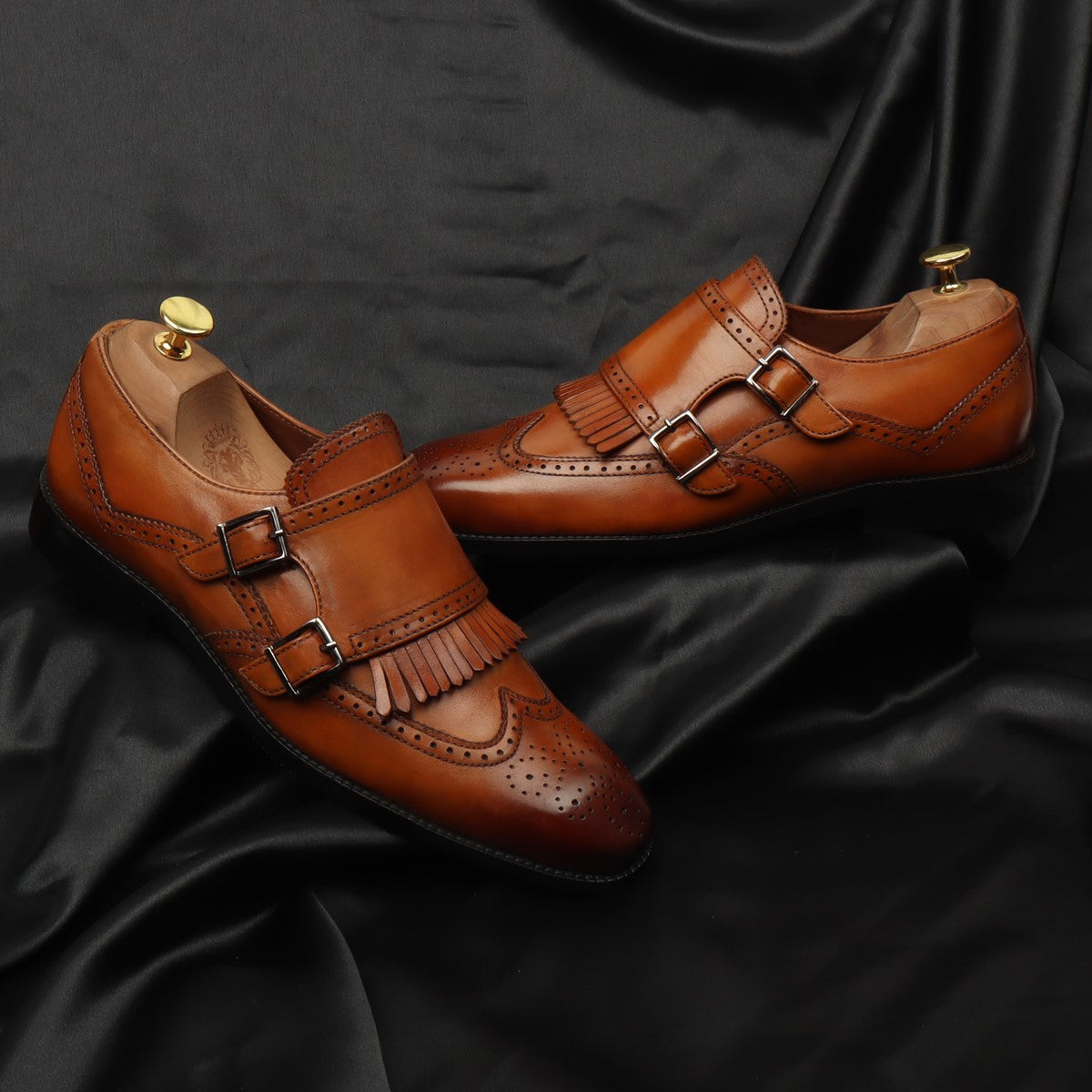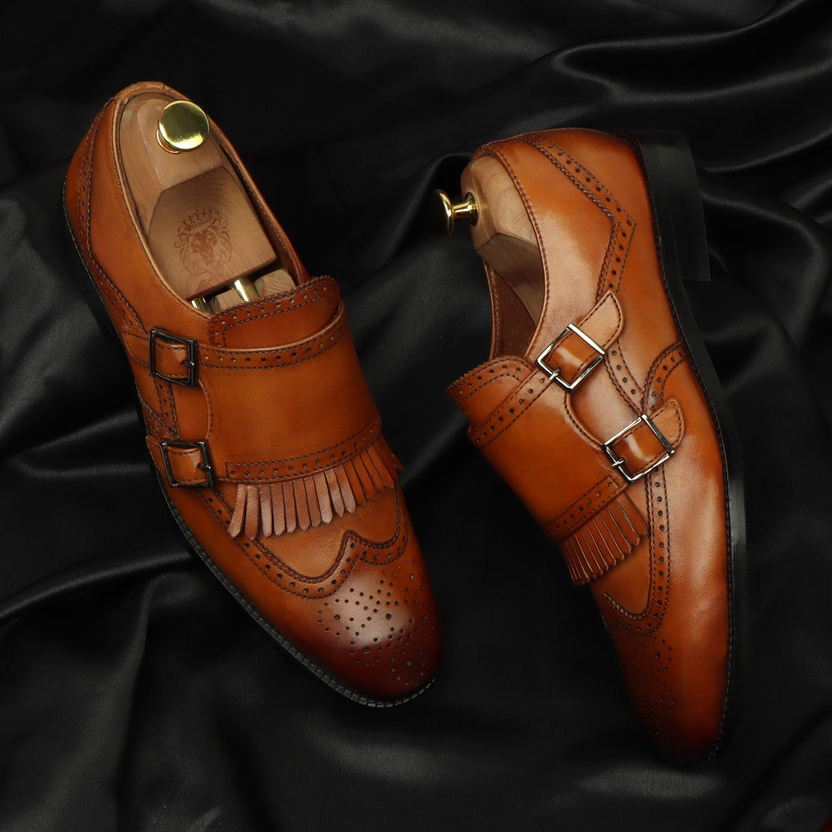 Tan Medallion Toe Wingtip Punching with Fringes Double Monk Strap Formals by Brune & Bareskin