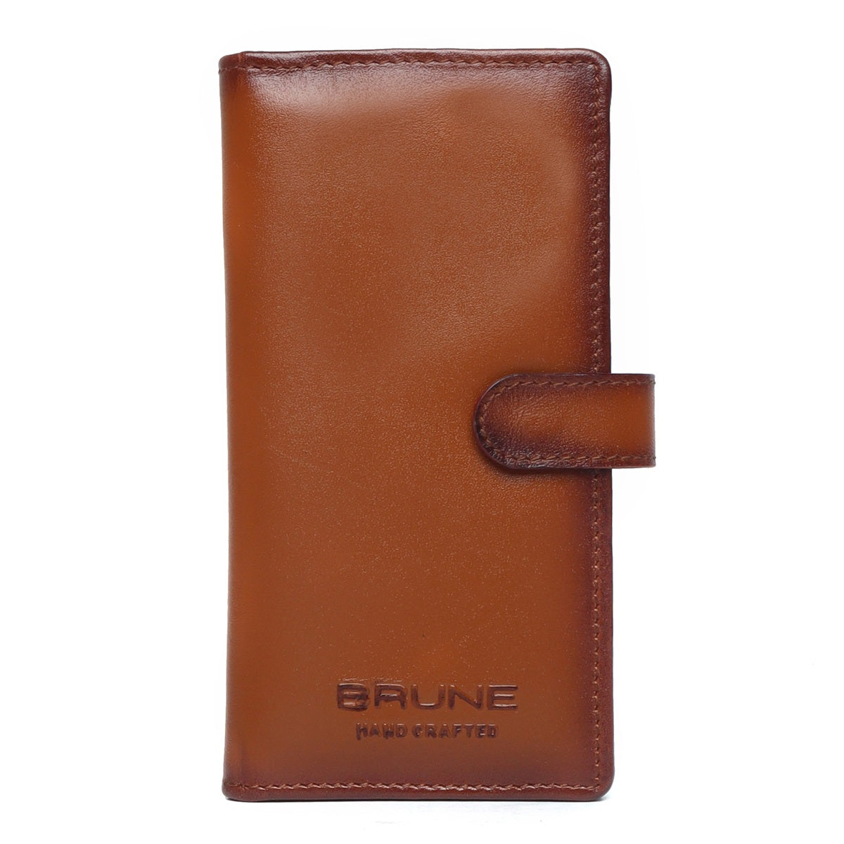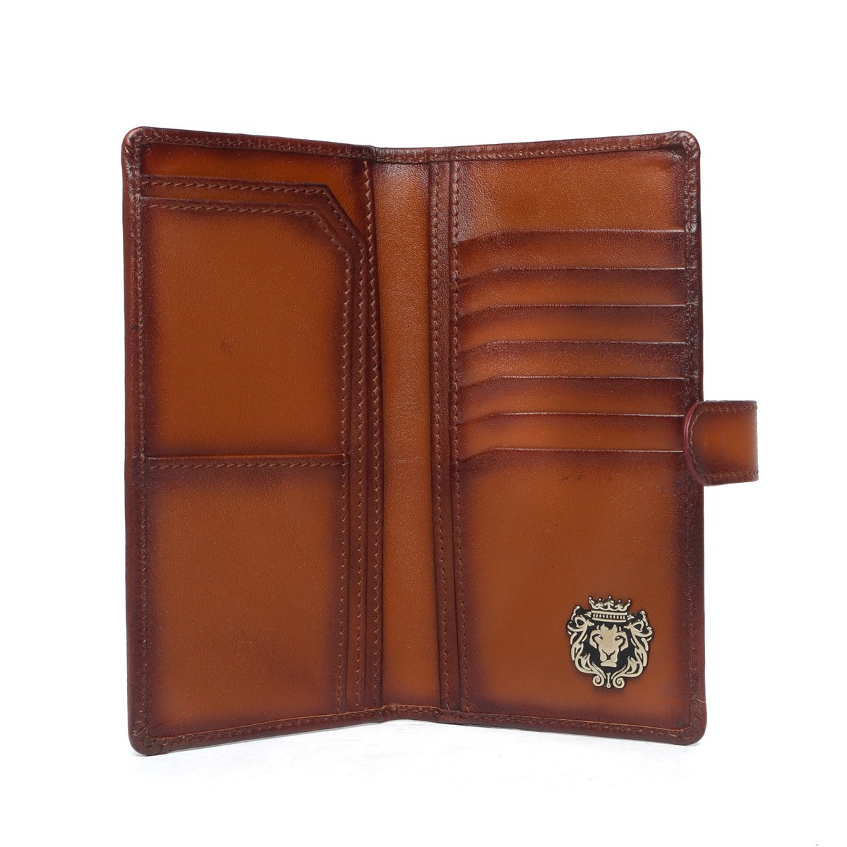 This bi-fold tan Plain leather long wallet with contrasting smudged edges looks very elegant. The BARESKIN signature metal Lion brand logo appears on the opening of the wallet. Bi-fold opening wallet features two main pockets along with small secure pocket on both sides. It has the total of 7 Card ,2 Long , 3 id card pockets, which makes it a perfect buy for today's generation. It has the smooth magnetic strap to keep it close and secure enough. It provides the style and storage with Patina regime leather shades.