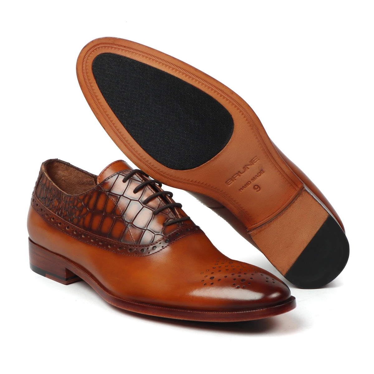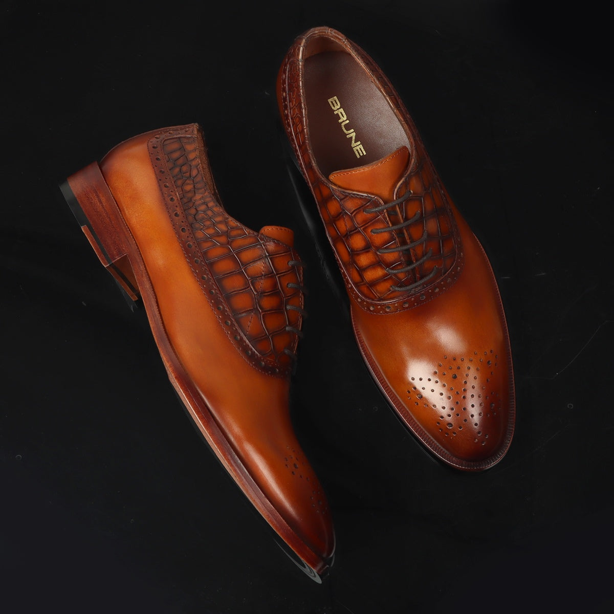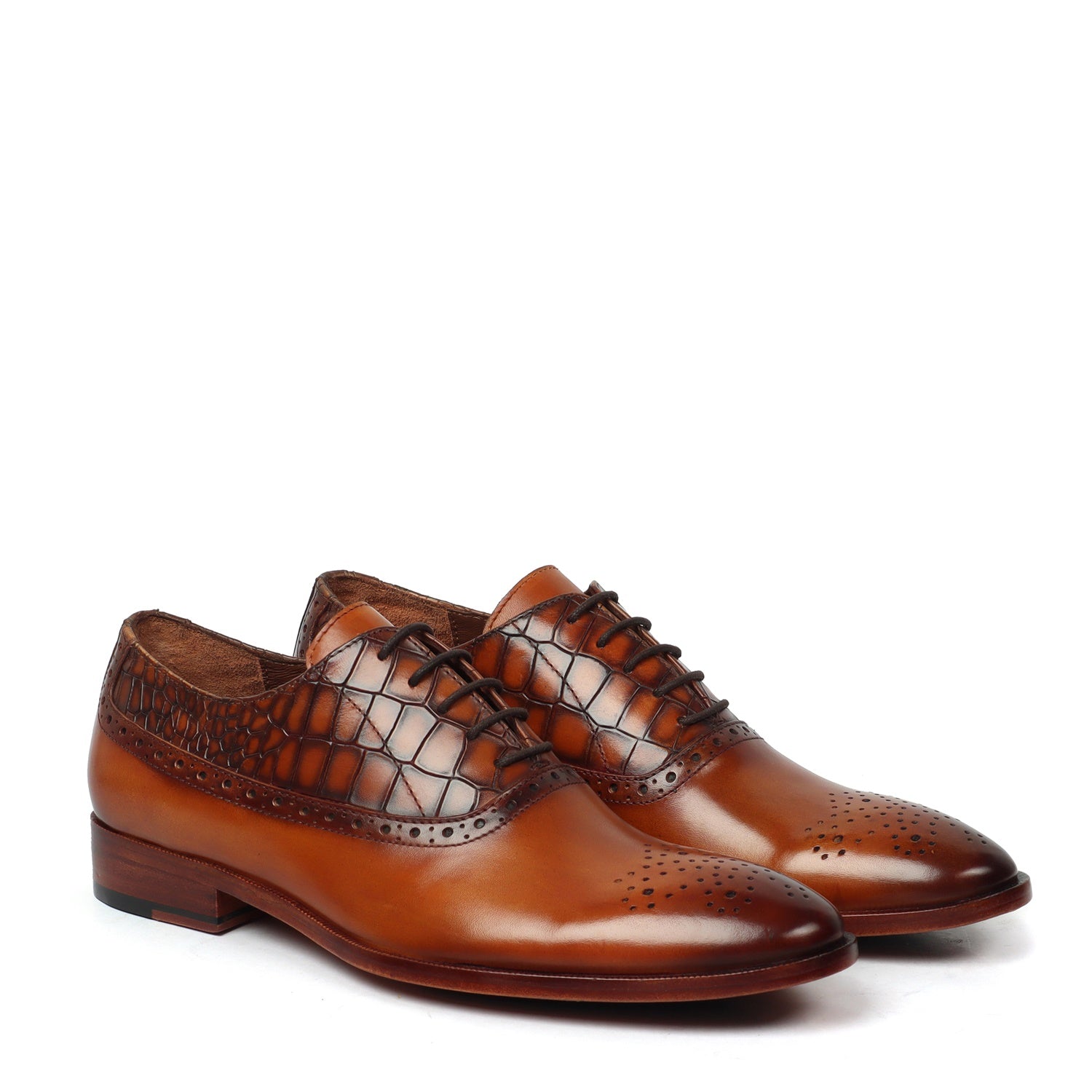 Tan Silhouette Vamp-Quarter Smokey Finish Deep Cut Croco Leather Oxford Shoes by Brune & Bareskin