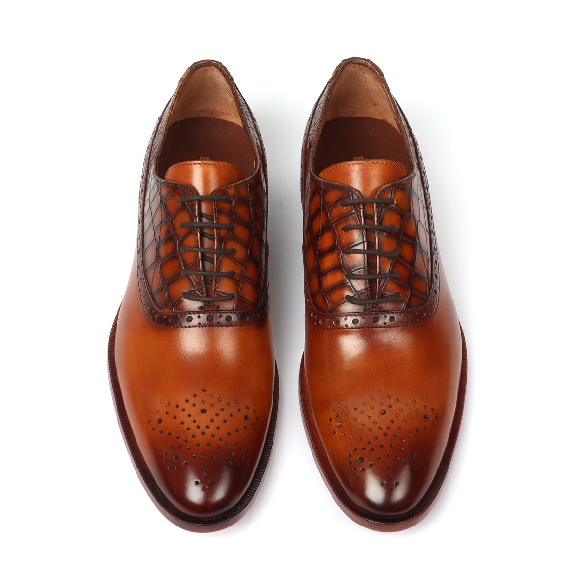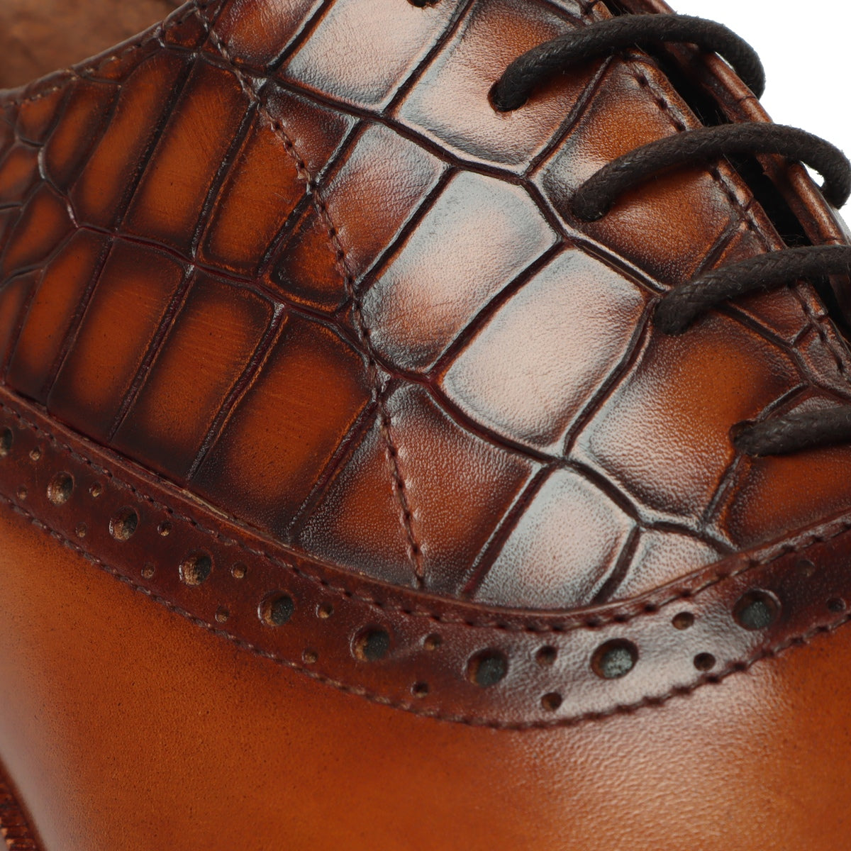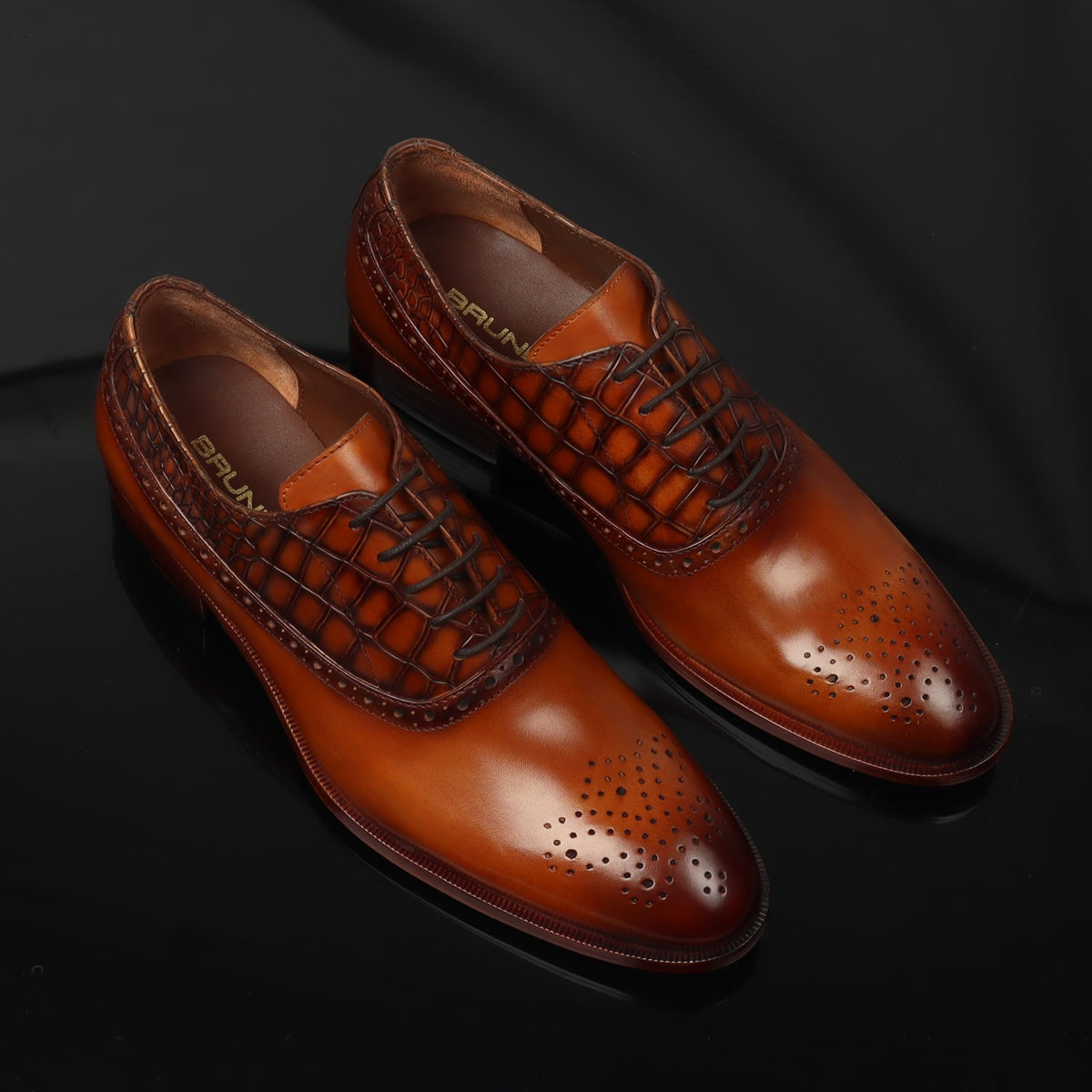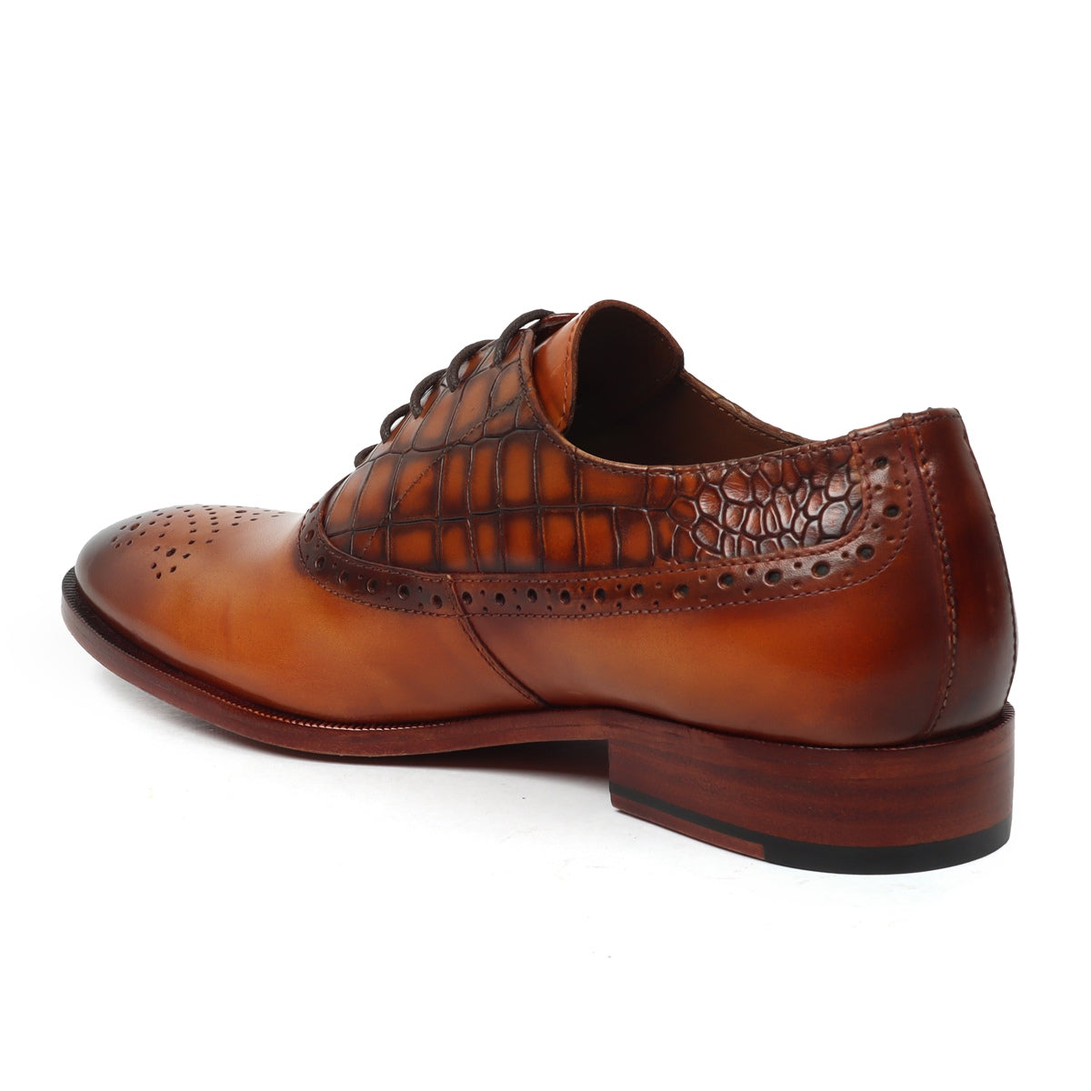 Tan Silhouette Vamp-Quarter Smokey Finish Deep Cut Croco Leather Oxford Shoes by Brune & Bareskin