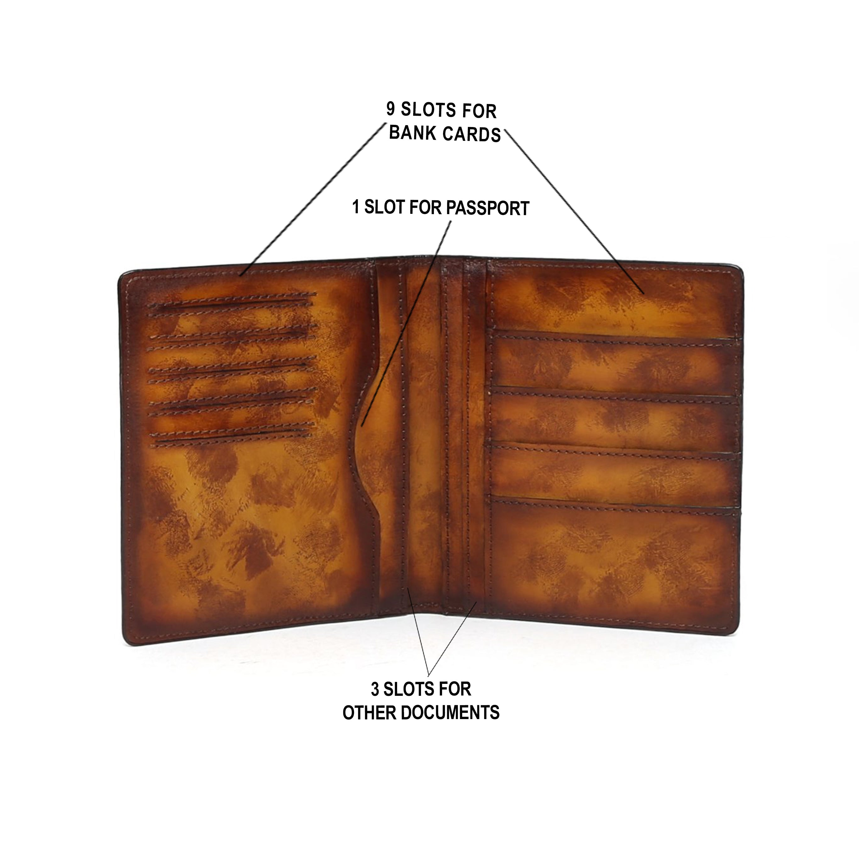 This handcrafted smudged design leather wallet passport holder brings the security and convenience to your traveling. It holds the passport effortlessly in a dedicated secure pocket. It features 5 staircase pockets on one side and 5 horizontally aligned pockets on other end. The two-fold provides the extra ease to use. The genuine leather made with Patina regime makes it a perfect accessory to use it for countless years