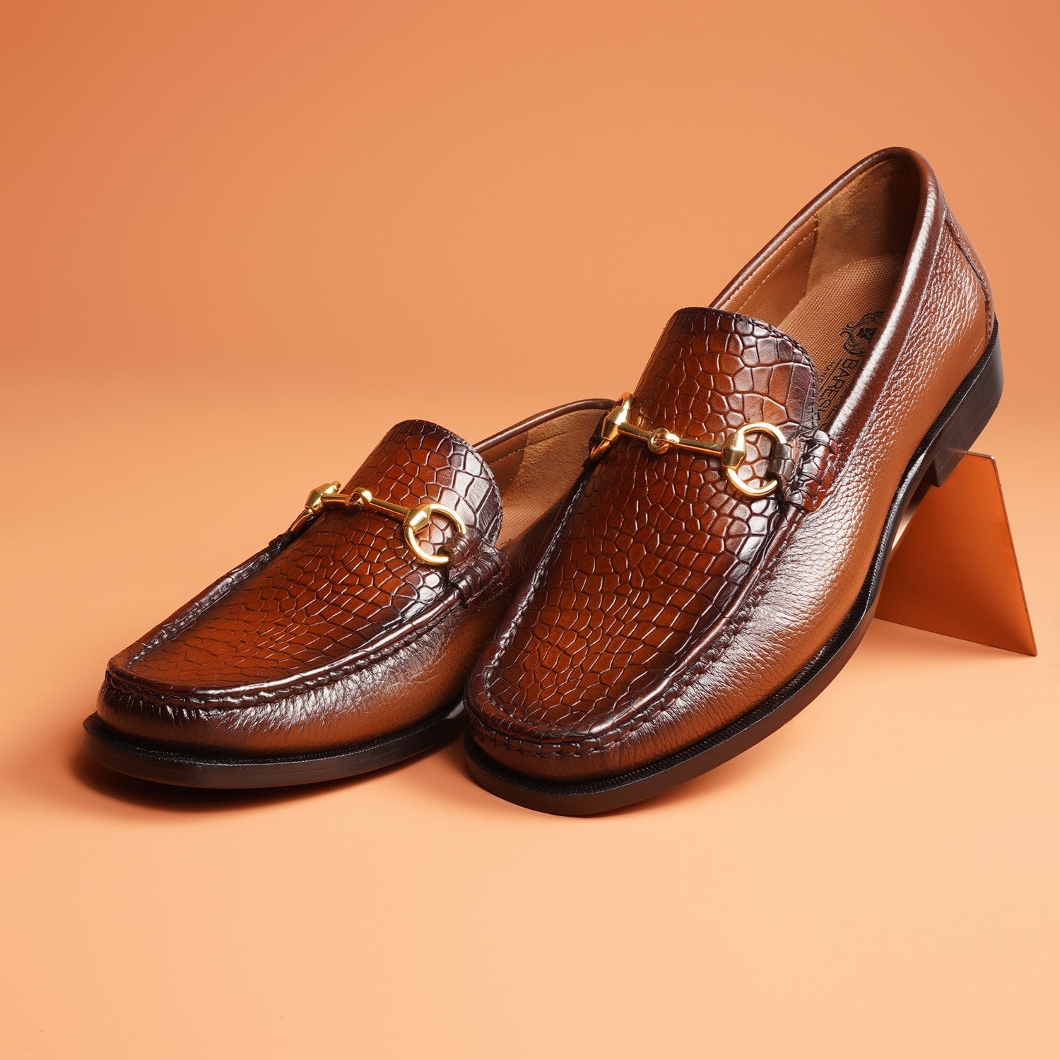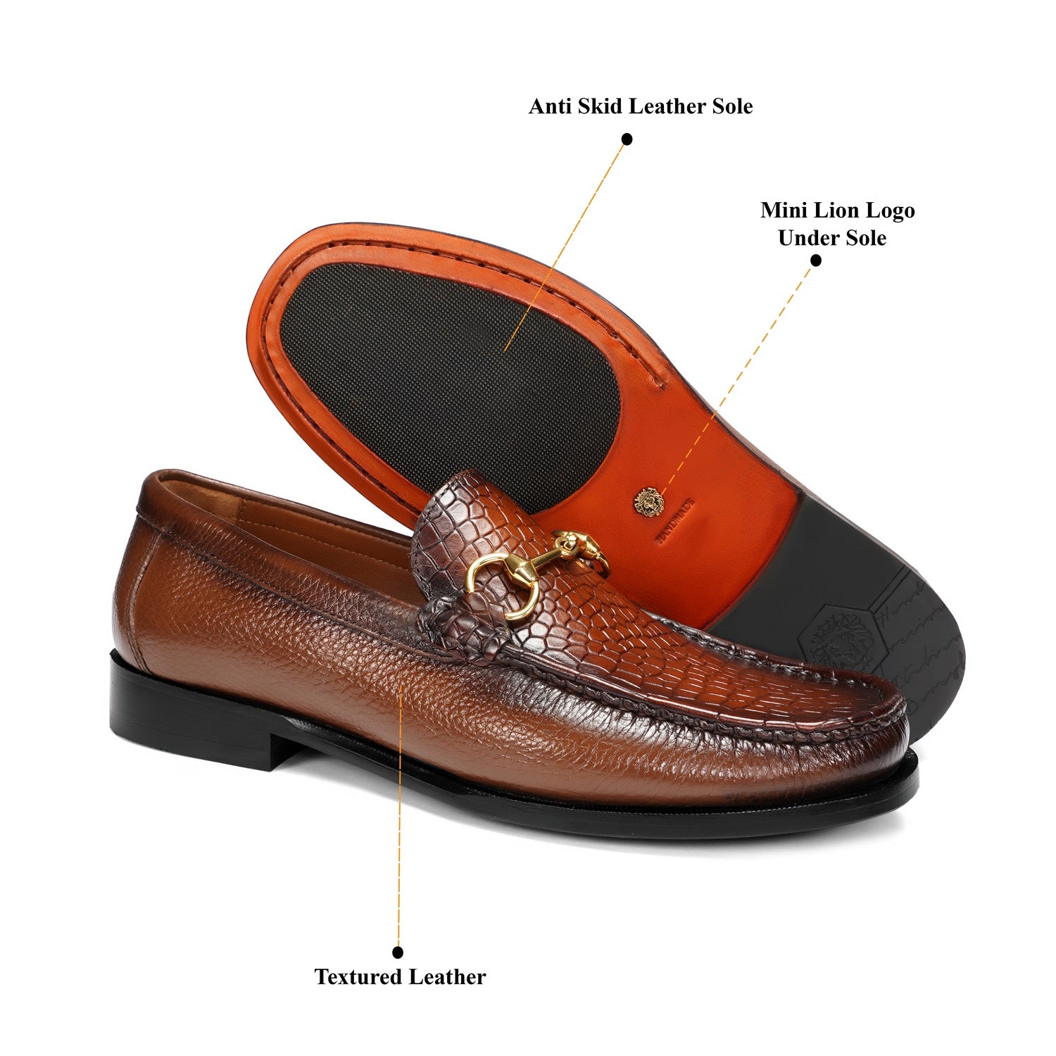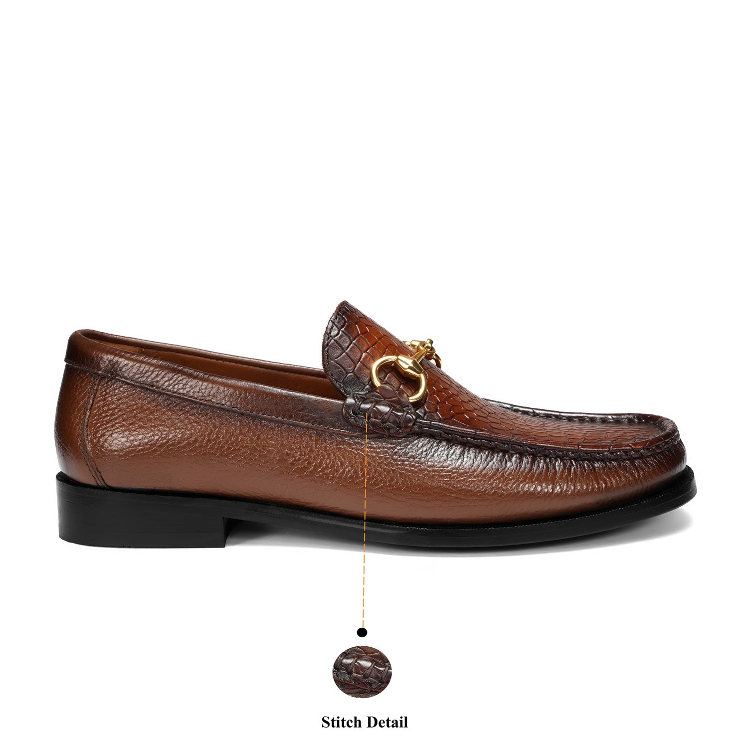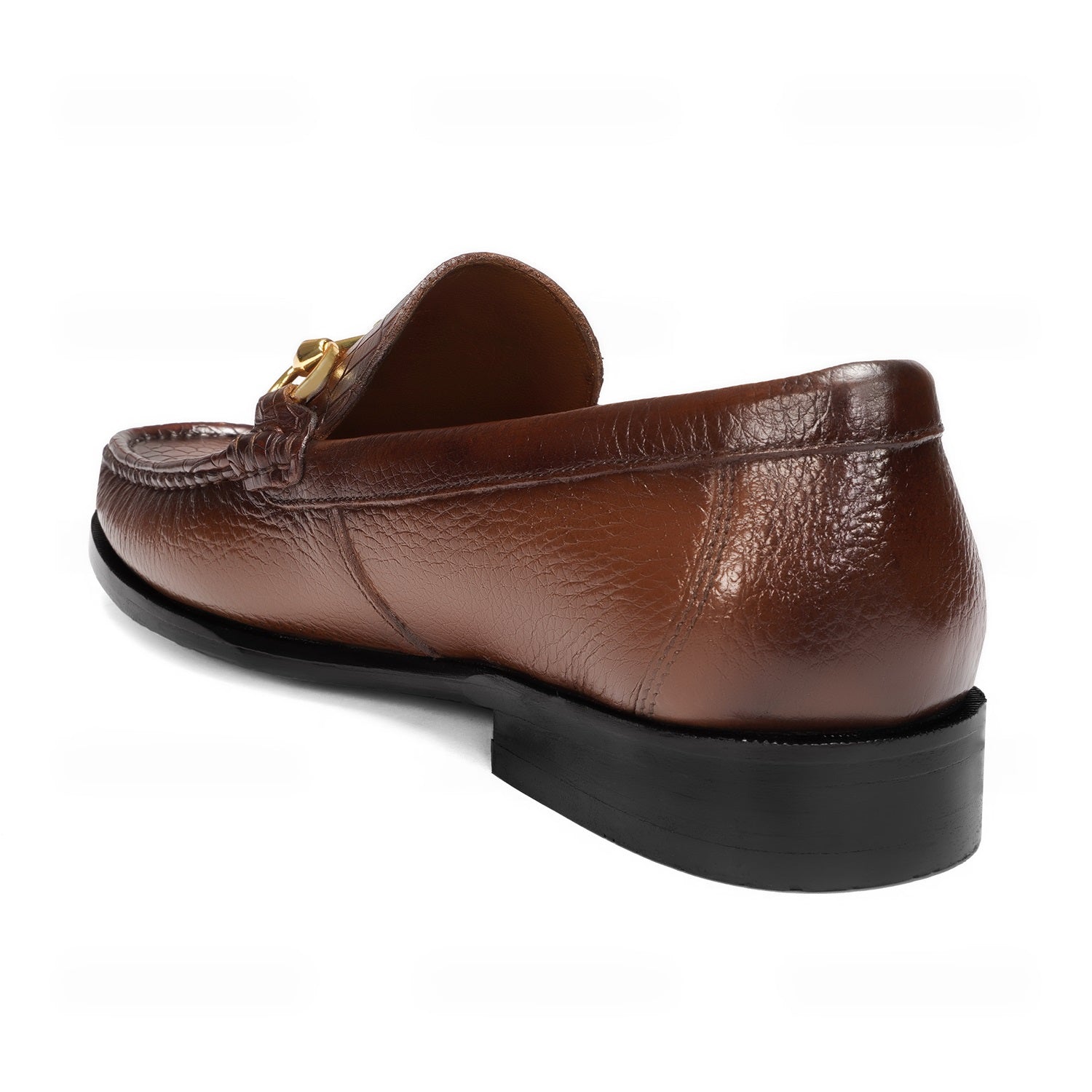Indulge in luxury with our Tan Textured Leather Loafer. Made from premium quality materials, this Leather Loafer boasts a unique golden horsebit detailing.