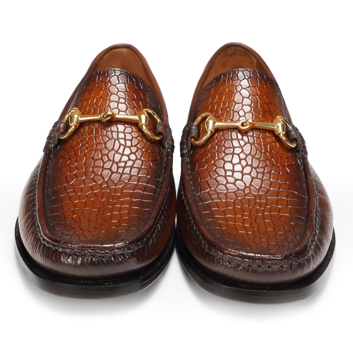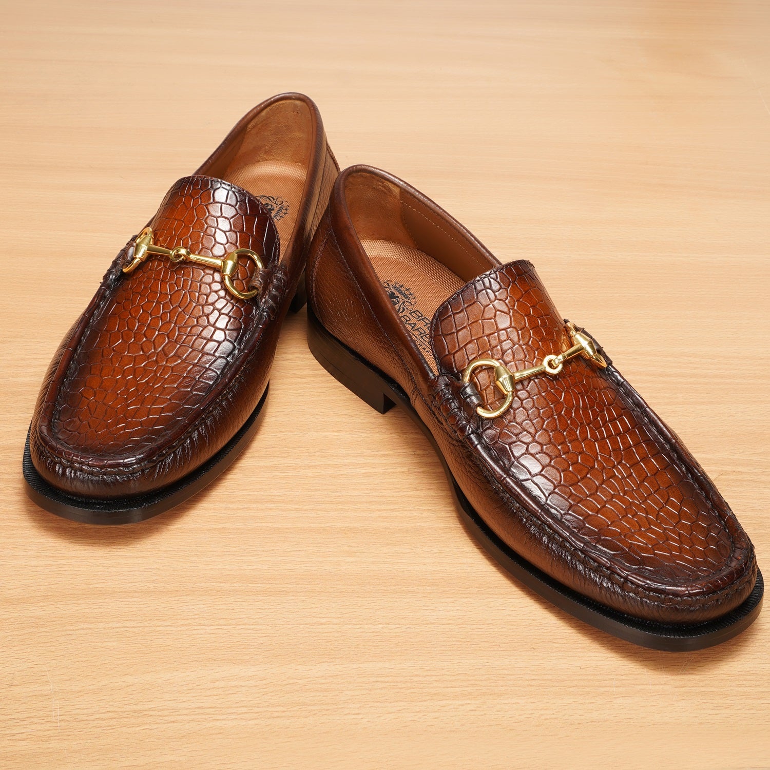 The deep cut croco apron toe and perfect round toe add sophistication, while the hand-crafted horse-bit buckle detailing on the vamp elevates this men's loafer to a work of art. From the renowned brand Brune & Bareskin, this shoe is the epitome of exclusivity and style.