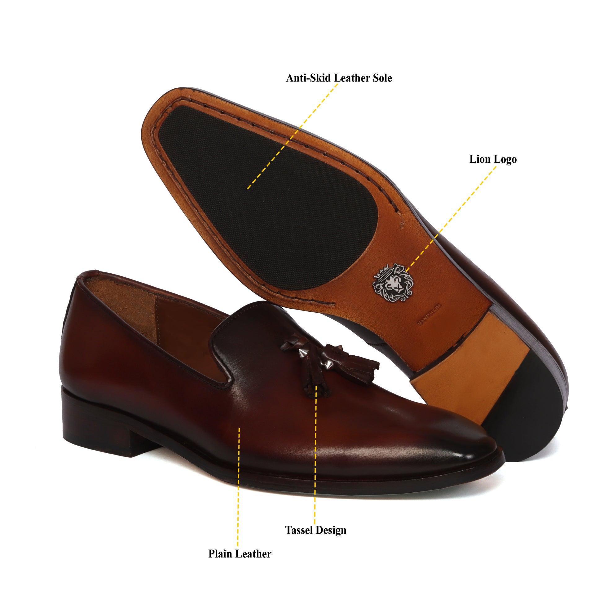 Look your best with these luxurious handcrafted Tassel Italian loafers for Men's with Dark Brown Leather. Expertly crafted from genuine leather, this stylish slip-on loafer features a classic tassel and a golden stud, anti skid leather sole, and a 2 sole construction. With its soft inner sole, dark brown hue, and signature lion logo under the shoe, you're sure to make a lasting impression. Brune & Bareskin brings you the ultimate in style and sophistication. What are you waiting for? You can click on CUSTOMIZE NOW Button (Just above the "ADD TO CART" button) & fill out the form to submit your customization requirements. Or you can reach us by Call, Email, What's App, and DM.