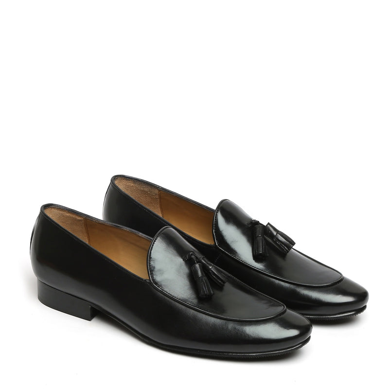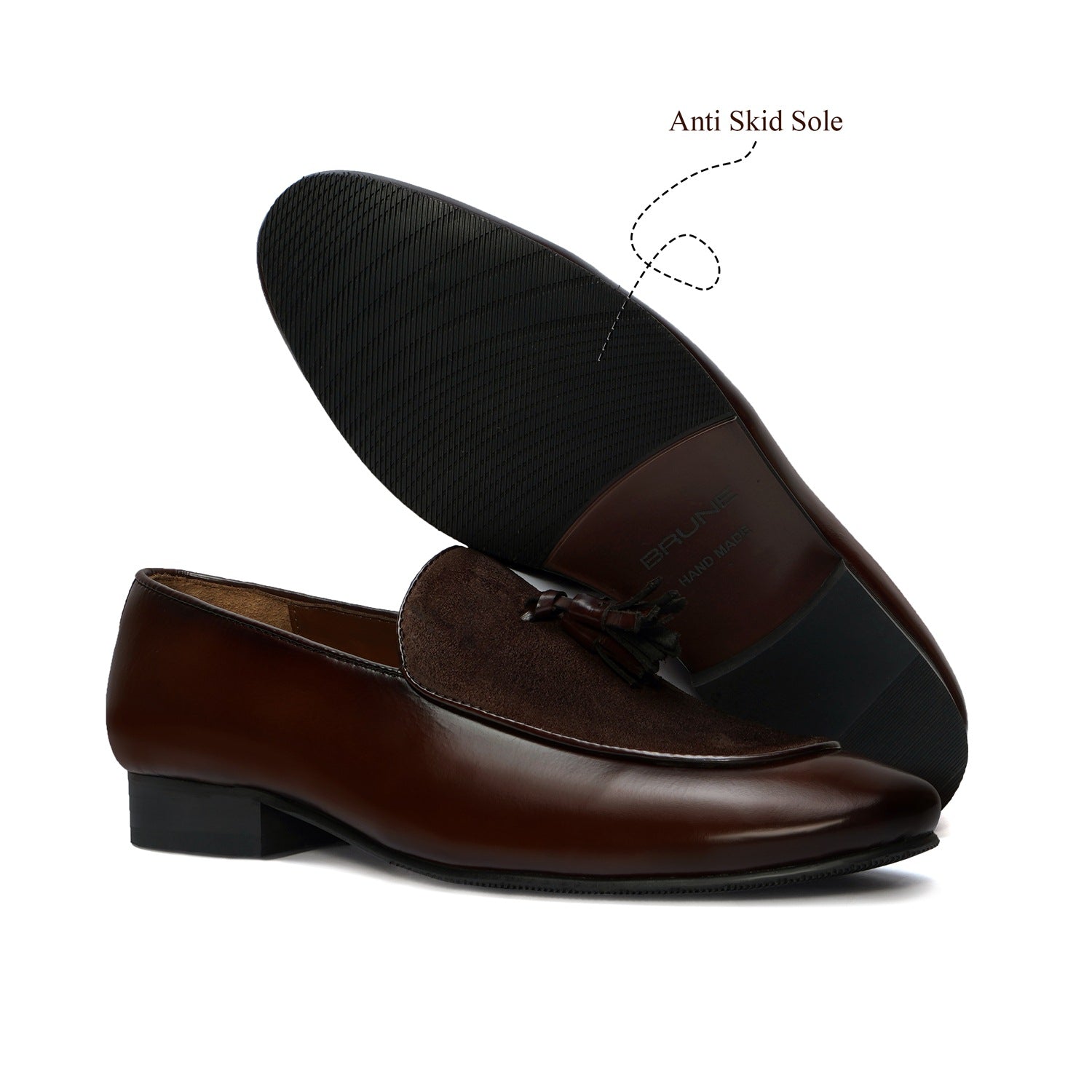 Elevate your formal or semi-formal look with our Tassel Slip-On Shoes from Brune & Bareskin. These handmade shoes feature a unique combination of glossy brush off genuine leather and suede leather, adding both style and durability. With a rubberized sole for better grip, you can confidently stride in comfort all day long. Experience luxury and sophistication with every step.