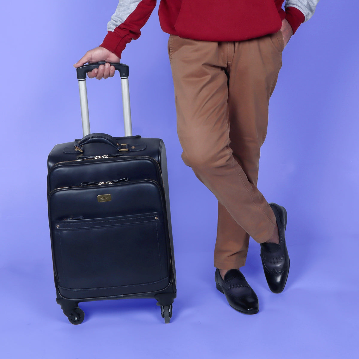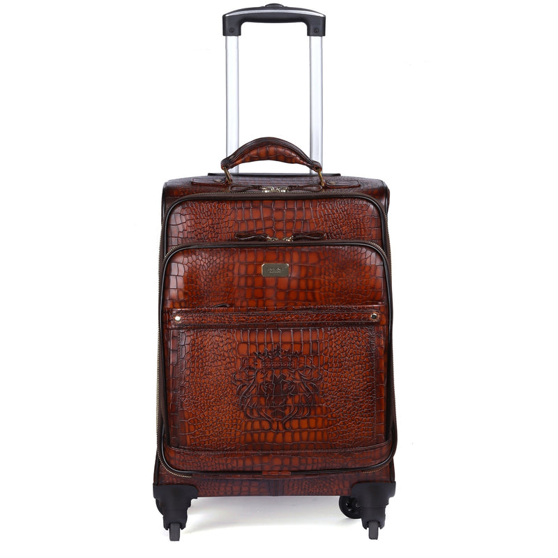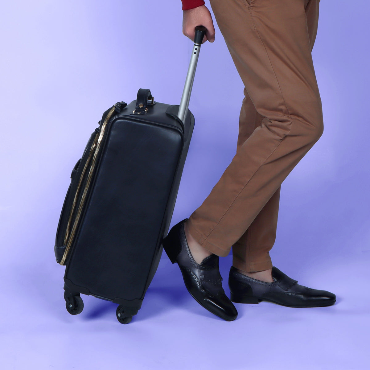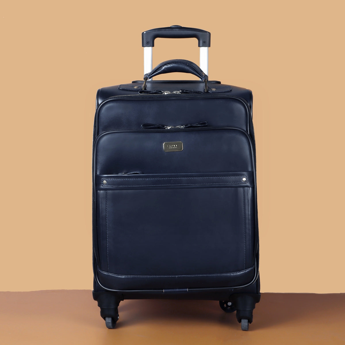 If you're asking about the strolley travel bag, it sounds like a travel bag designed with wheels and a telescopic handle for easy transportation. Brune & Bareskin bag is made of genuine leather, which can provide durability and a stylish appearance. This is handmade bag from the finest quality leather and luxuriously lined with Up to 15" laptop sleeve. The spacious interior which opens with a smooth zipper features pockets and compartments for laptop & iPad and pouches providing extra space for all your travel essentials, whilst the exterior boasts a handy pocket perfect for those last minute airport purchases. The foldaway telescopic handle is tucked away in a neat compartment and the integral quad wheels are discreetly placed at the bottom, which stands the case in all its glory. You can customize this further in your favorite color and also add the name initials.