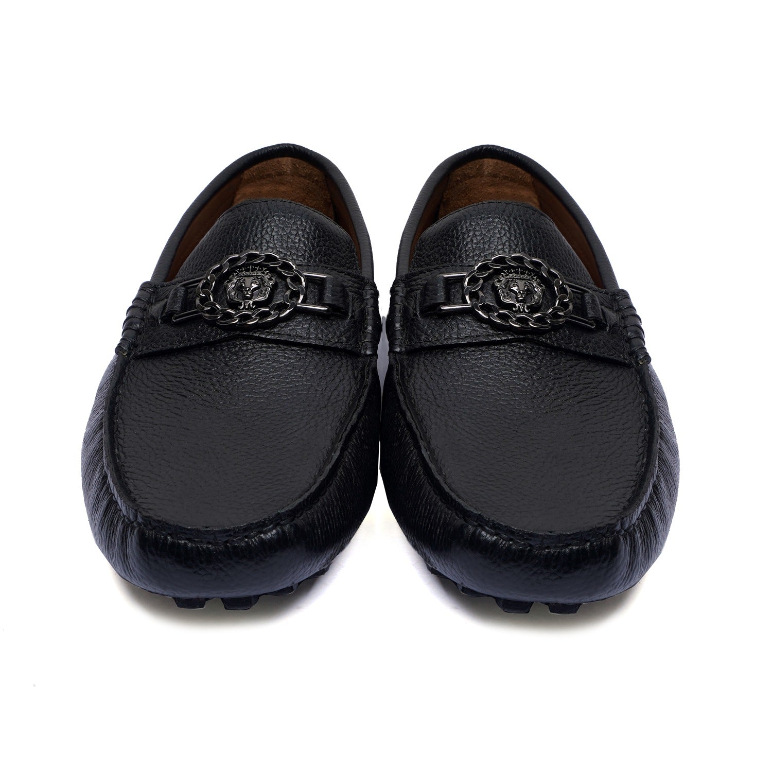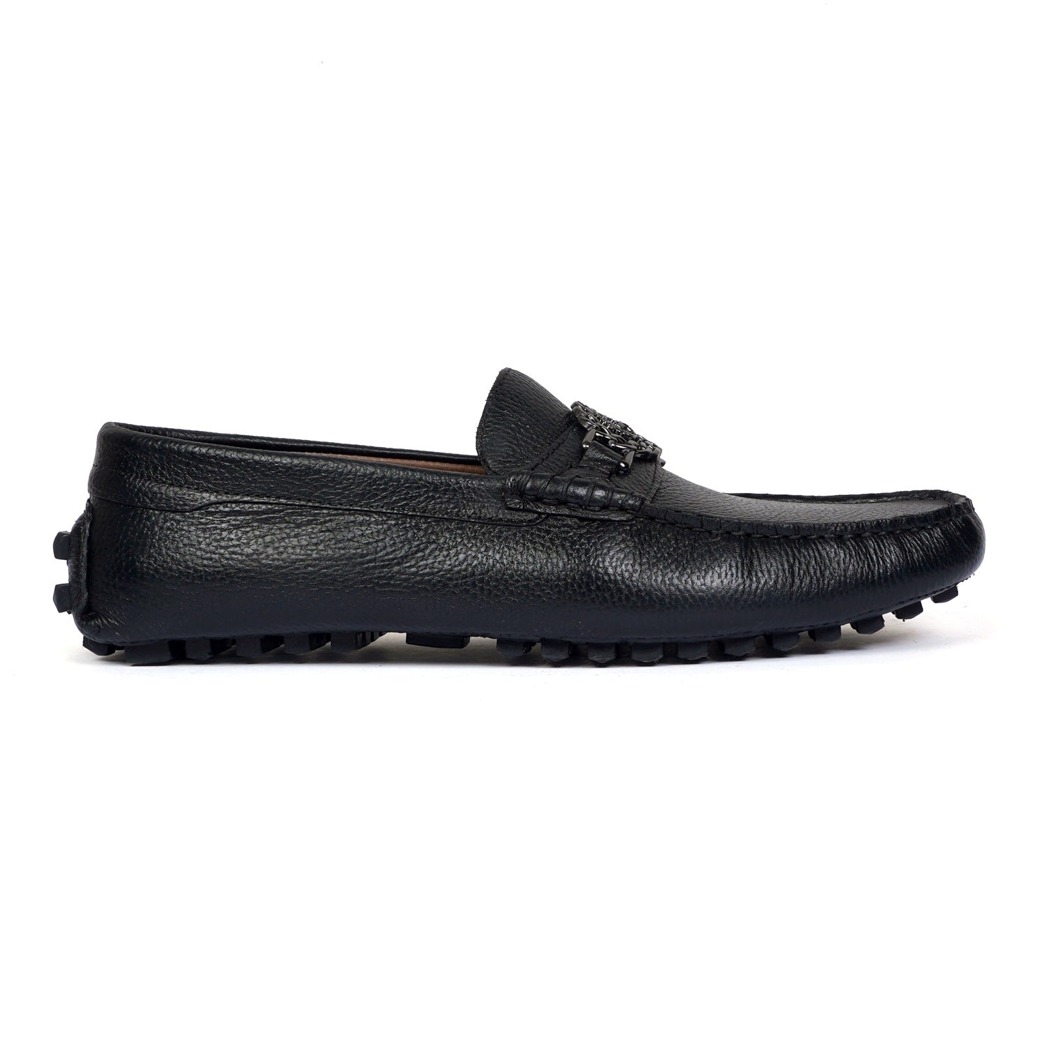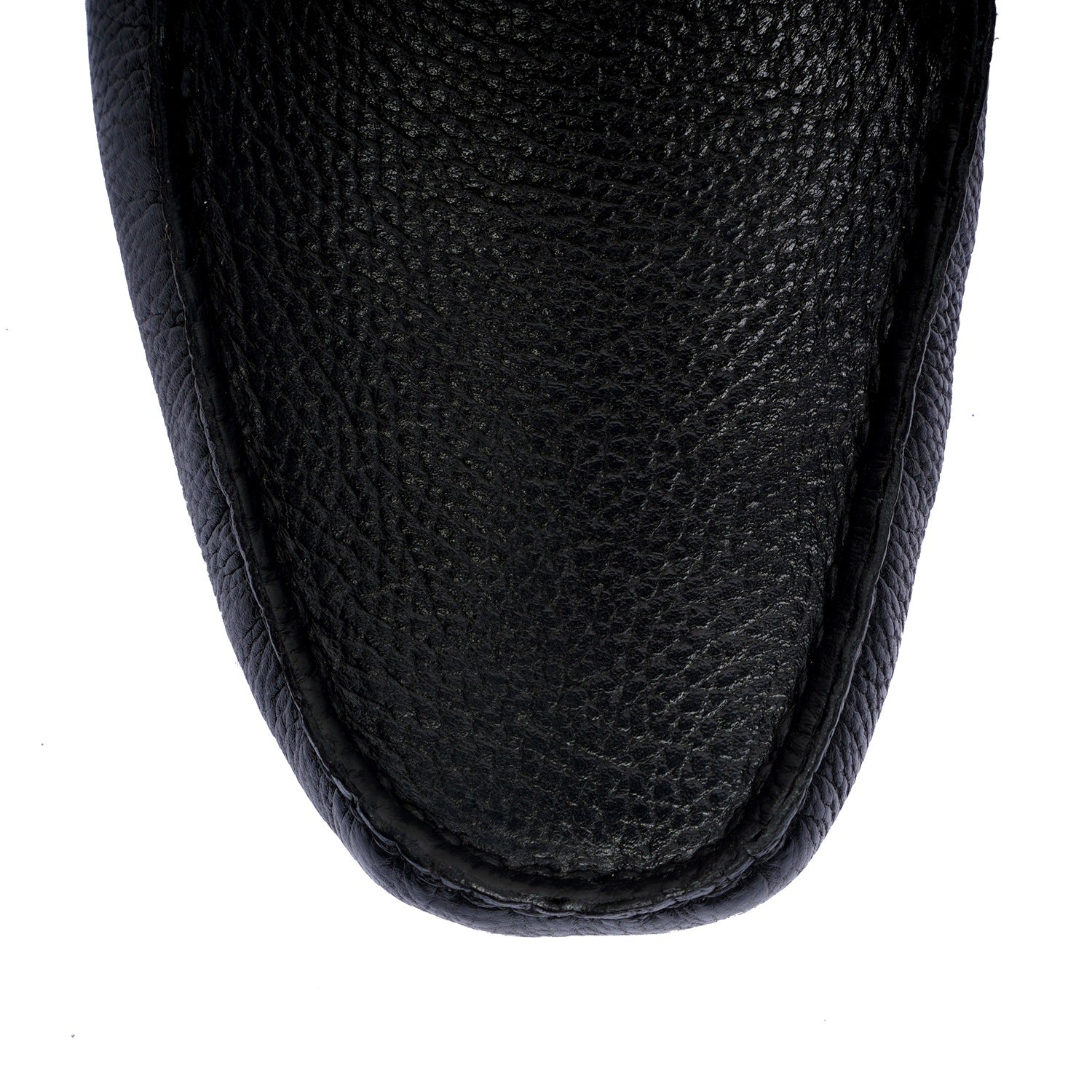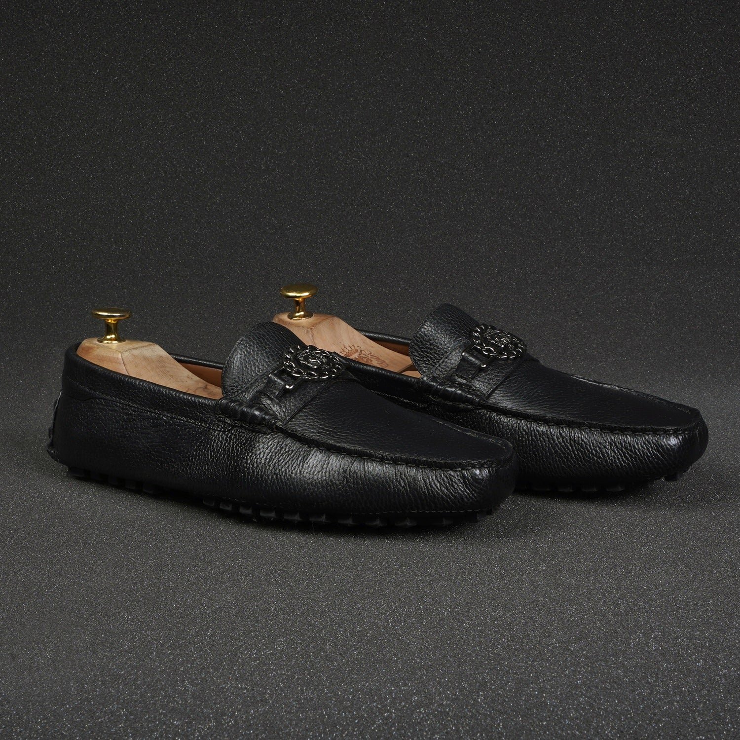 Textured Black Leather Driver Sole Loafers with Gunmetal Accessory