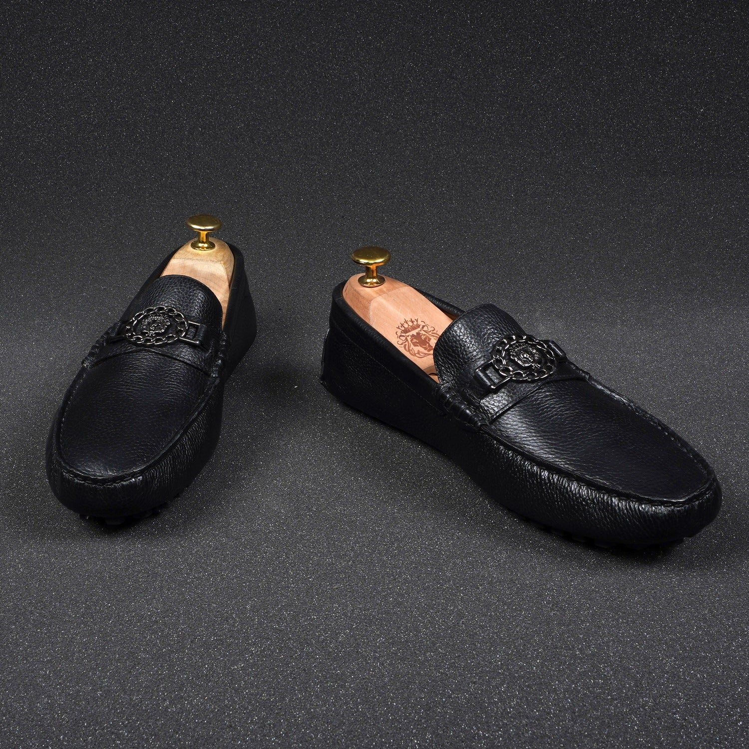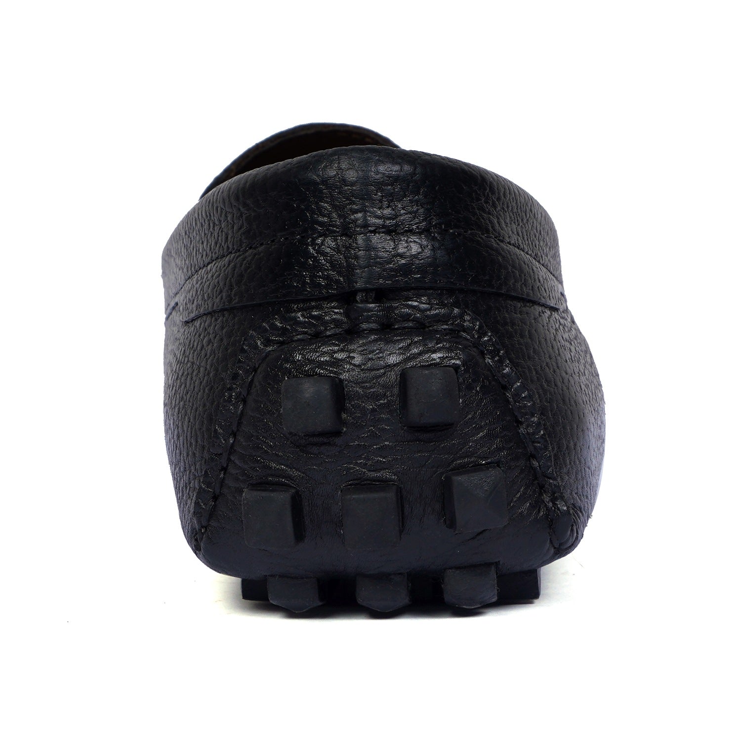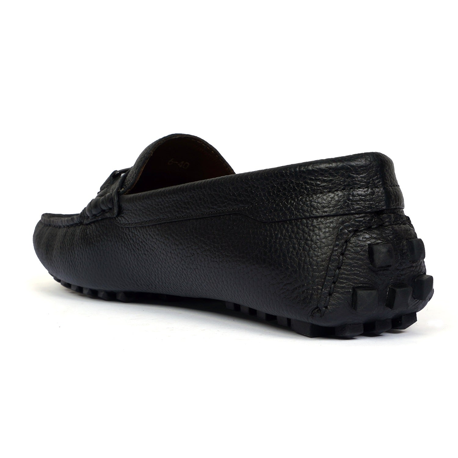 Textured Black Leather Driver Sole Loafers with Gunmetal Accessory
