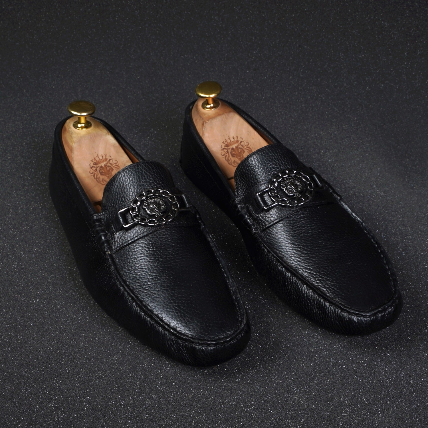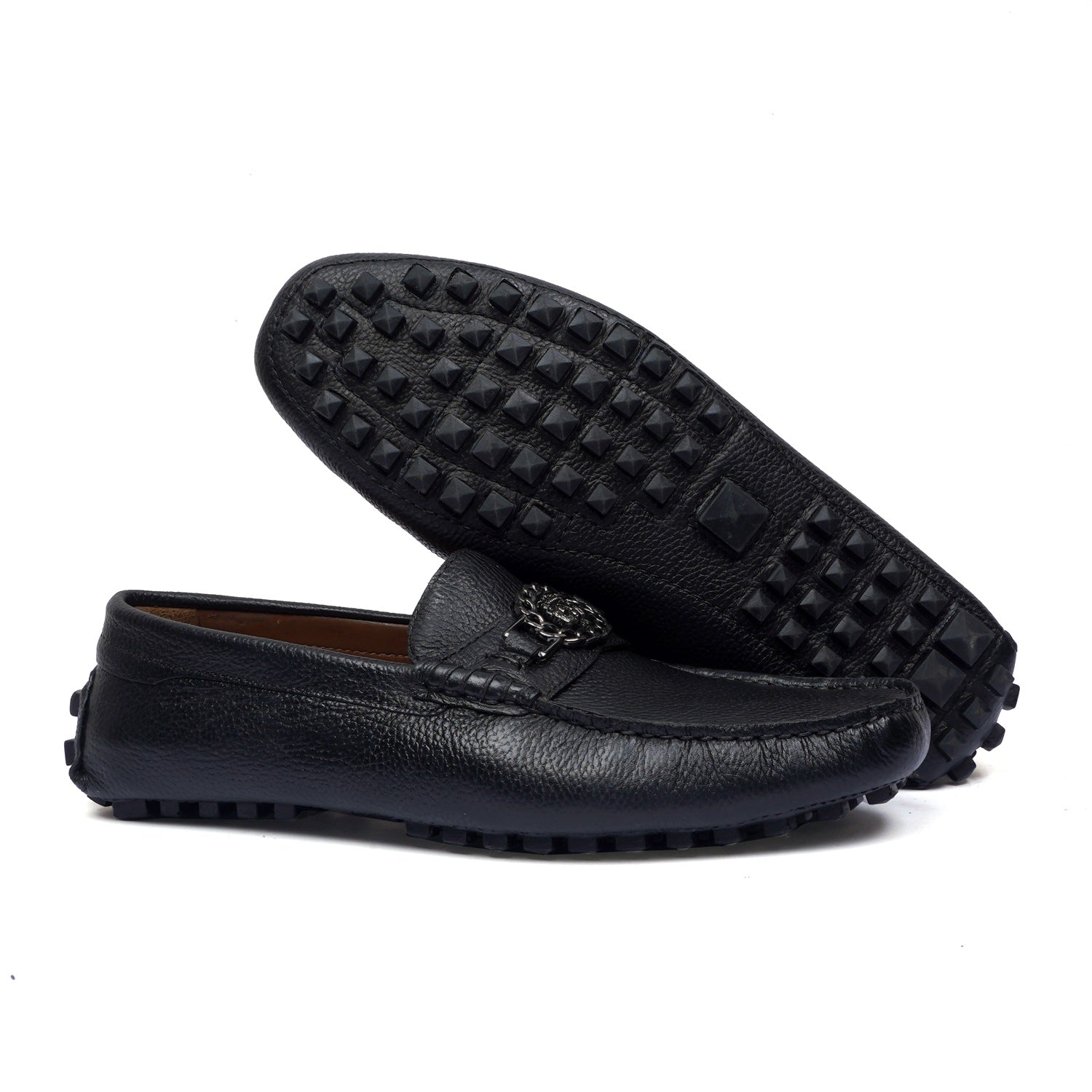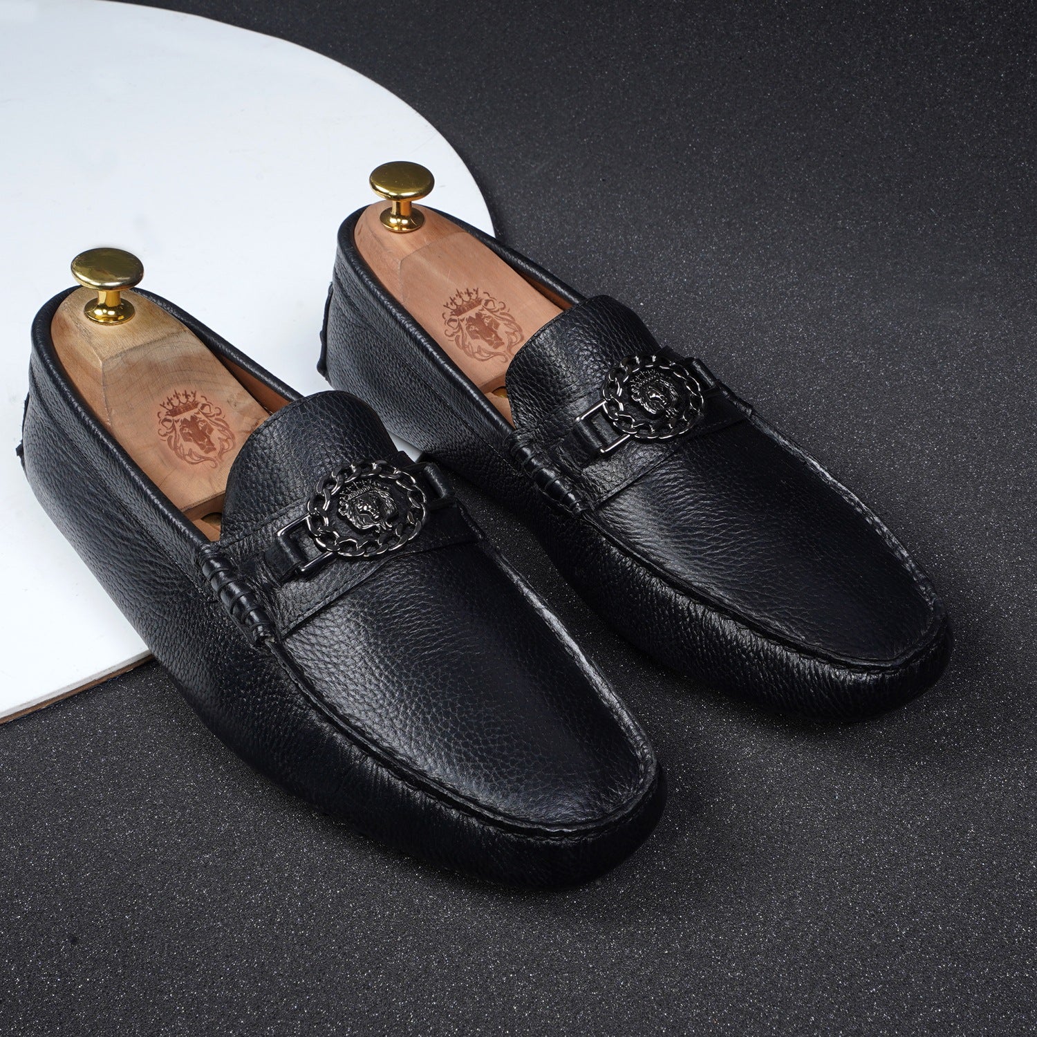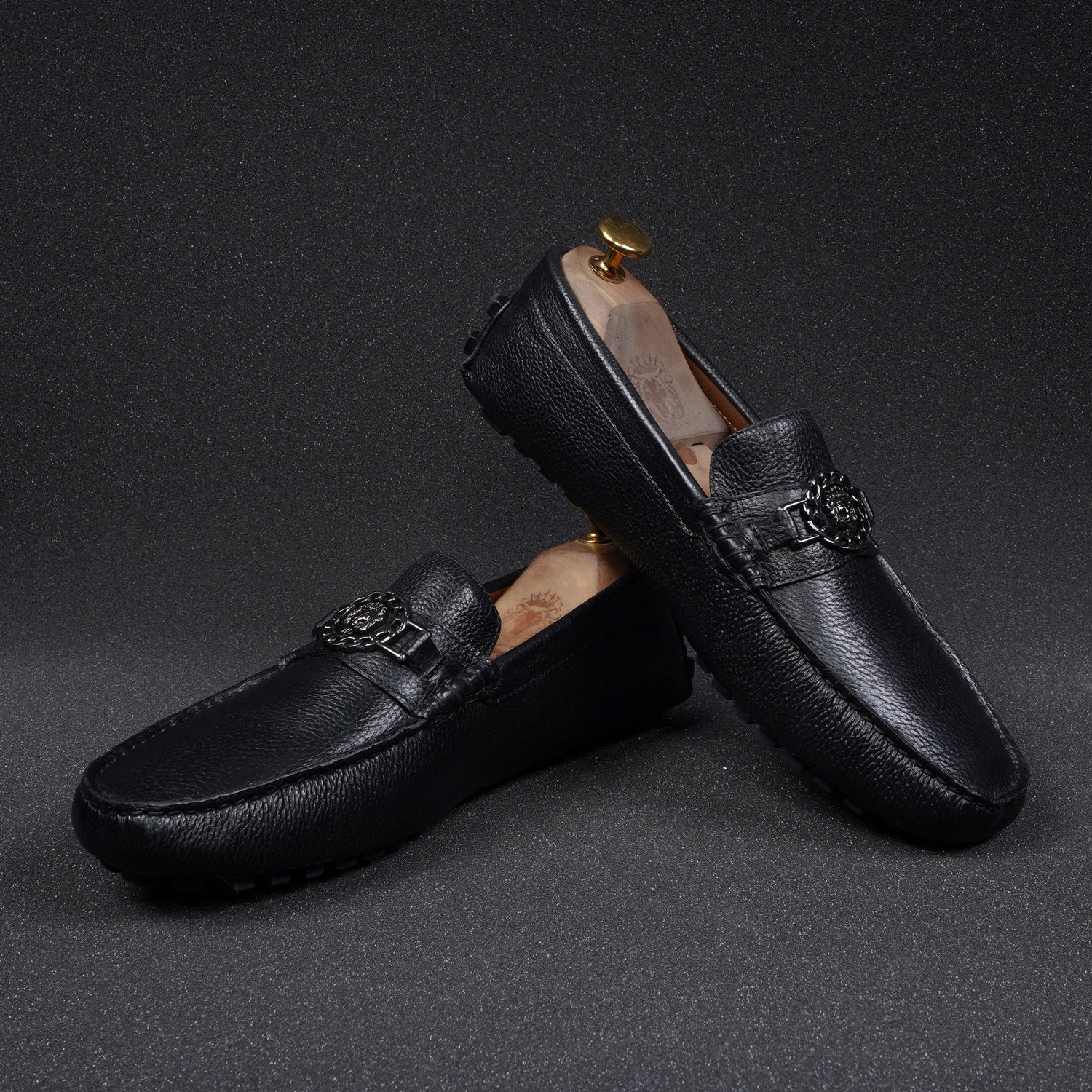 Textured Black Leather Driver Sole Loafers with Gunmetal Accessory