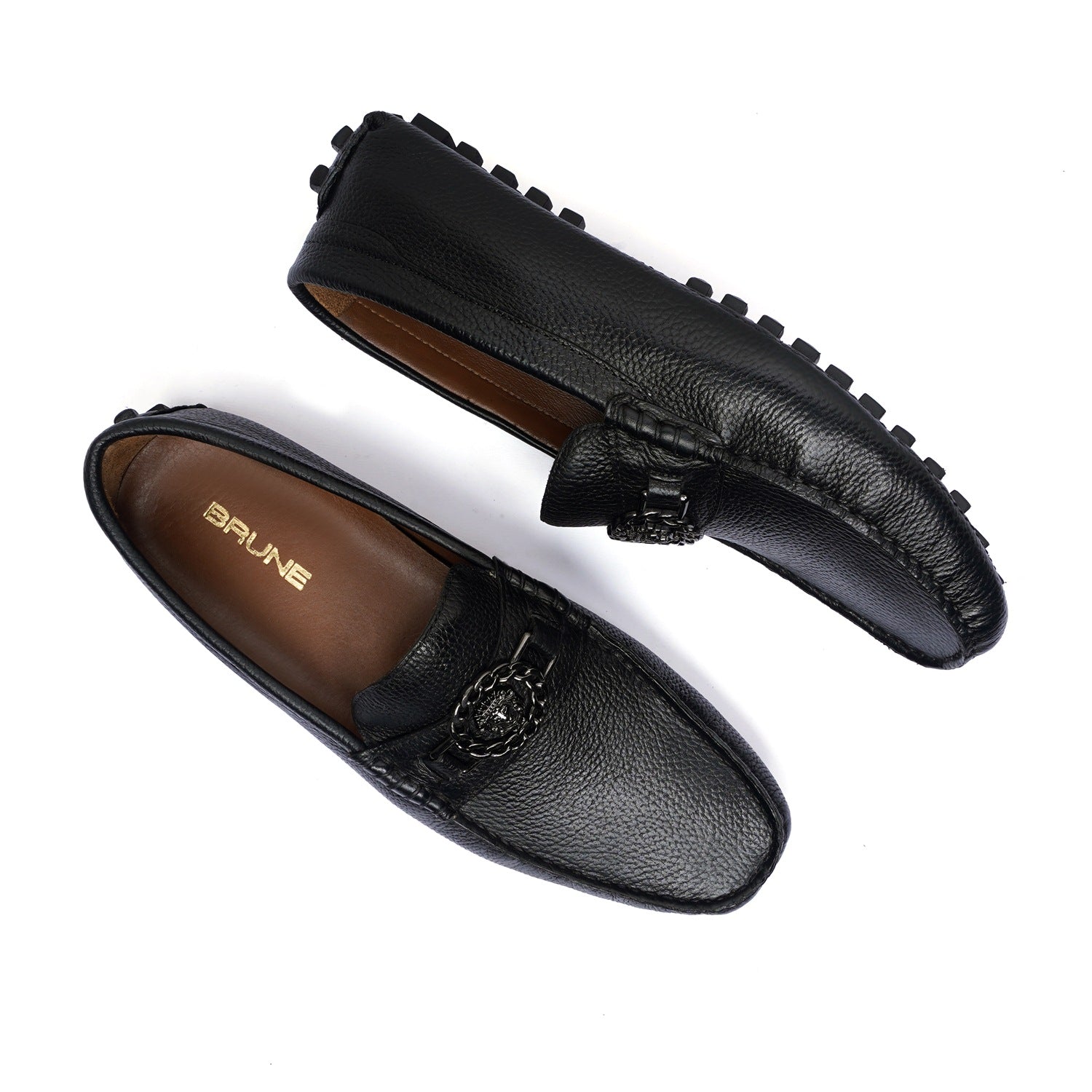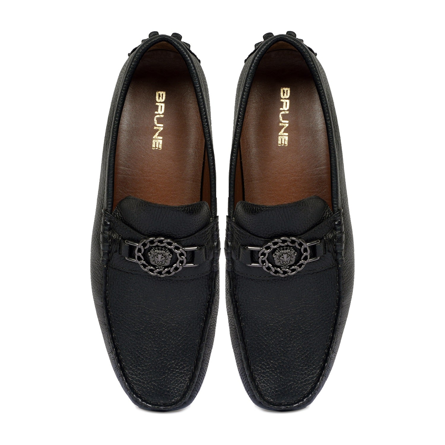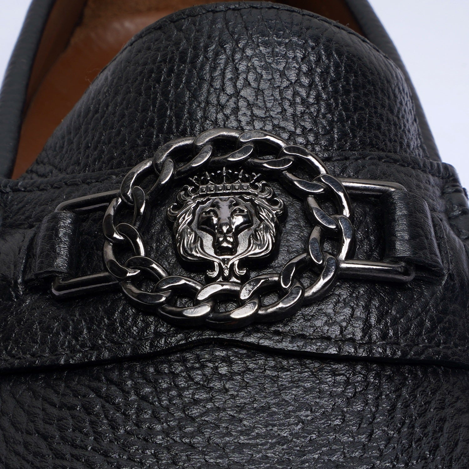 The pinnacle of style and comfort, these handmade Driver Sole Loafers from Brune & Bareskin are perfect for any occasion. Made from luxurious black Textured leather, they feature a gun-metal chain lion logo embellishment on the vamp. The cushioned inner sole and nubs driver sole provide all-day comfort, making them ideal for both formal and casual looks. Step up your shoe game with these men's loafers that add a touch of sophistication to any outfit.