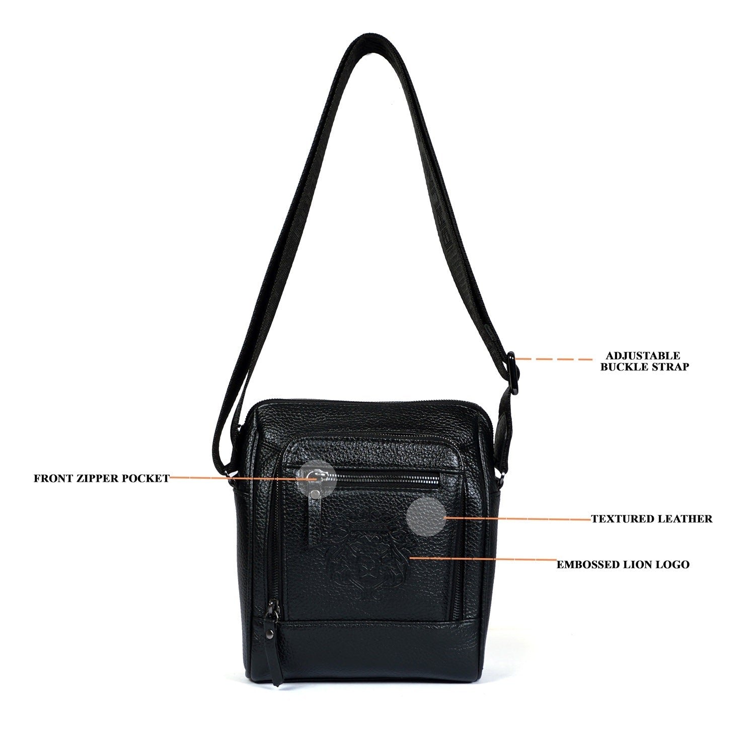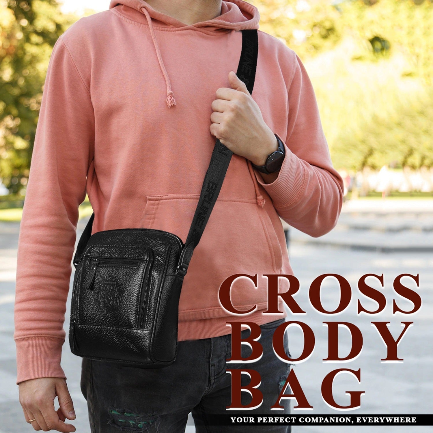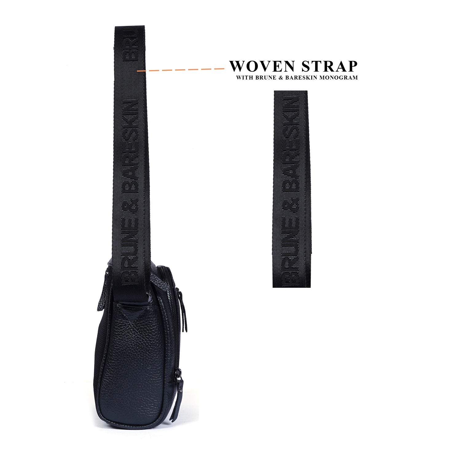 Get ready to turn heads with the Textured Leather Black Crossbody Bag by Brune & Bareskin. Made with premium quality textured leather, this unisex city bag is perfect for traveling. The top zipper compartment, zip pockets, and backside mesh pocket provide ample space for your essentials, while the adjustable shoulder strap with the brand's monogram adds a touch of style. Carry everything you need, from your phone to your air-pods, keys, charger, cash, and more in this classy and sleek crossbody bag.