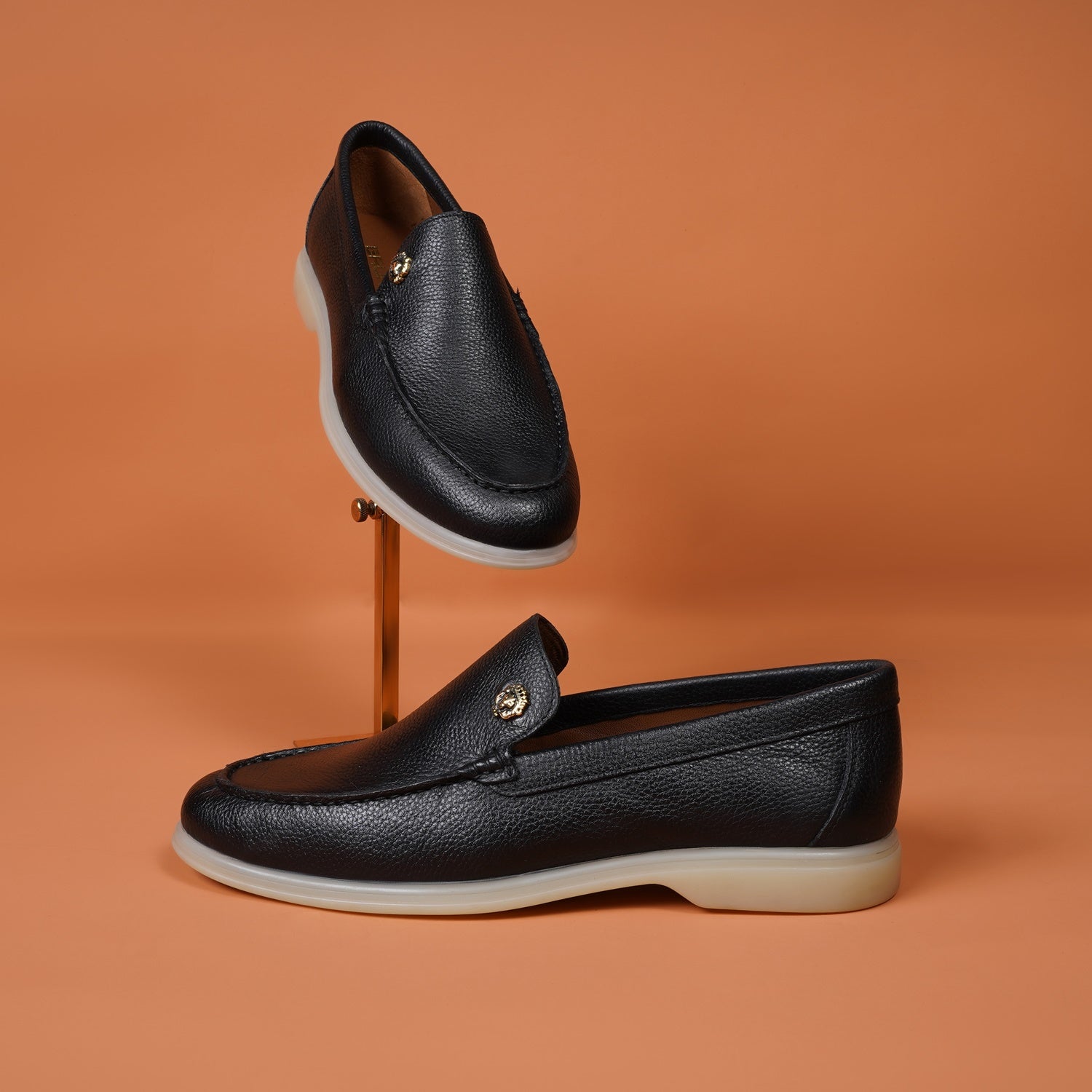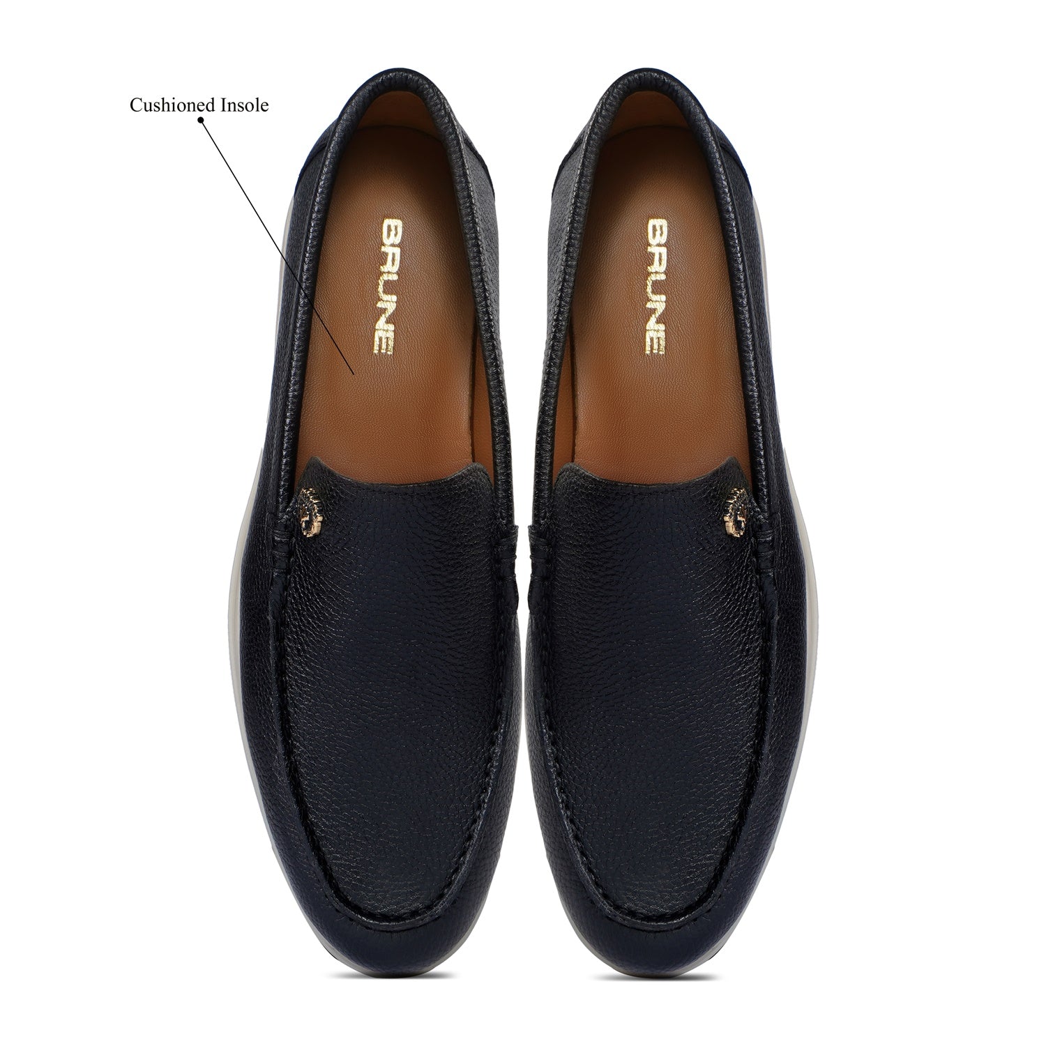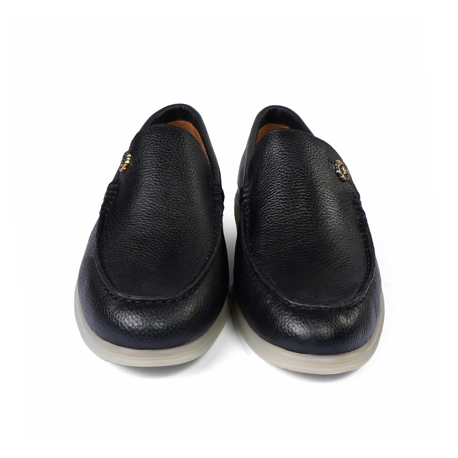 Introducing the perfect summer shoe, the Textured Leather Yacht Slip-On Shoes in Black Color by Brune & Bareskin. Exquisitely hand crafted with premium quality textured leather, these men's loafers provide maximum comfort with their well-designed construction. The rubber sole offers better grip, making them the perfect choice for summer walks. Team them up with Capri's, jeans or any casual outfit for a stylish and comfortable look.