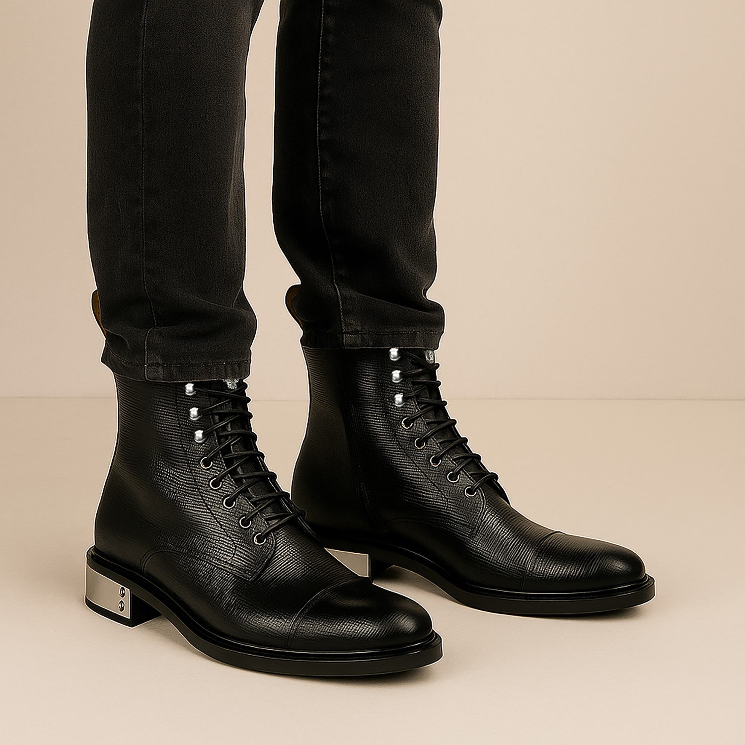 Textured Saffiano Large Metal Heel Plate Black Leather Lace-Up Boots