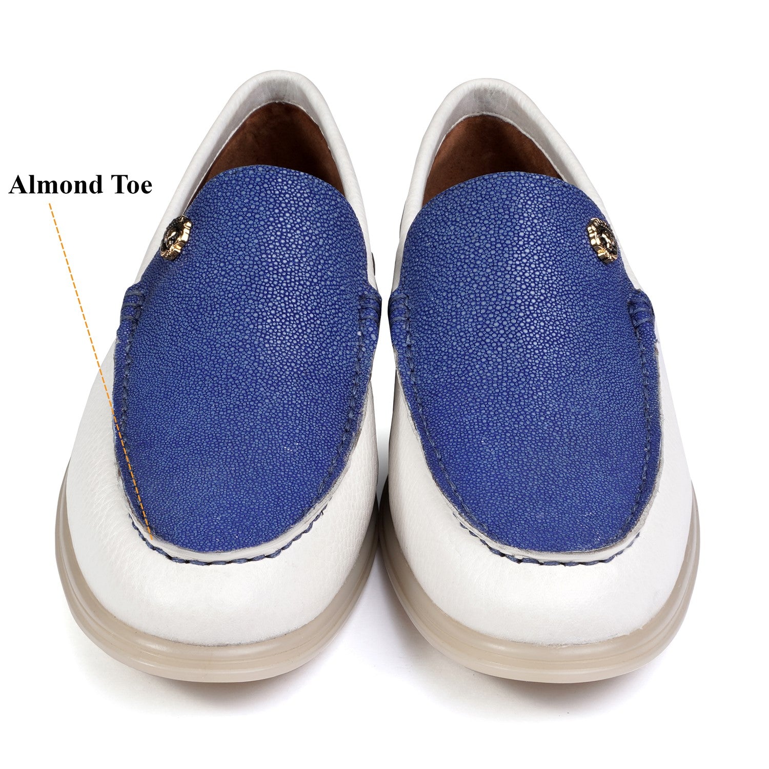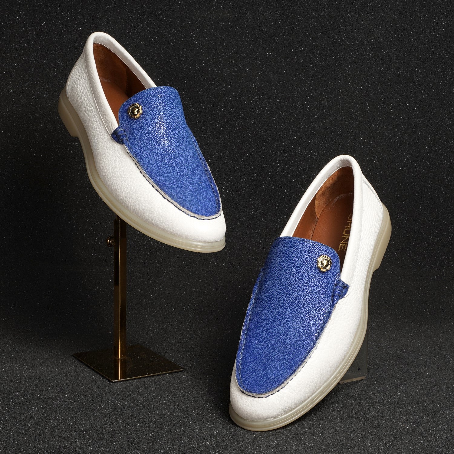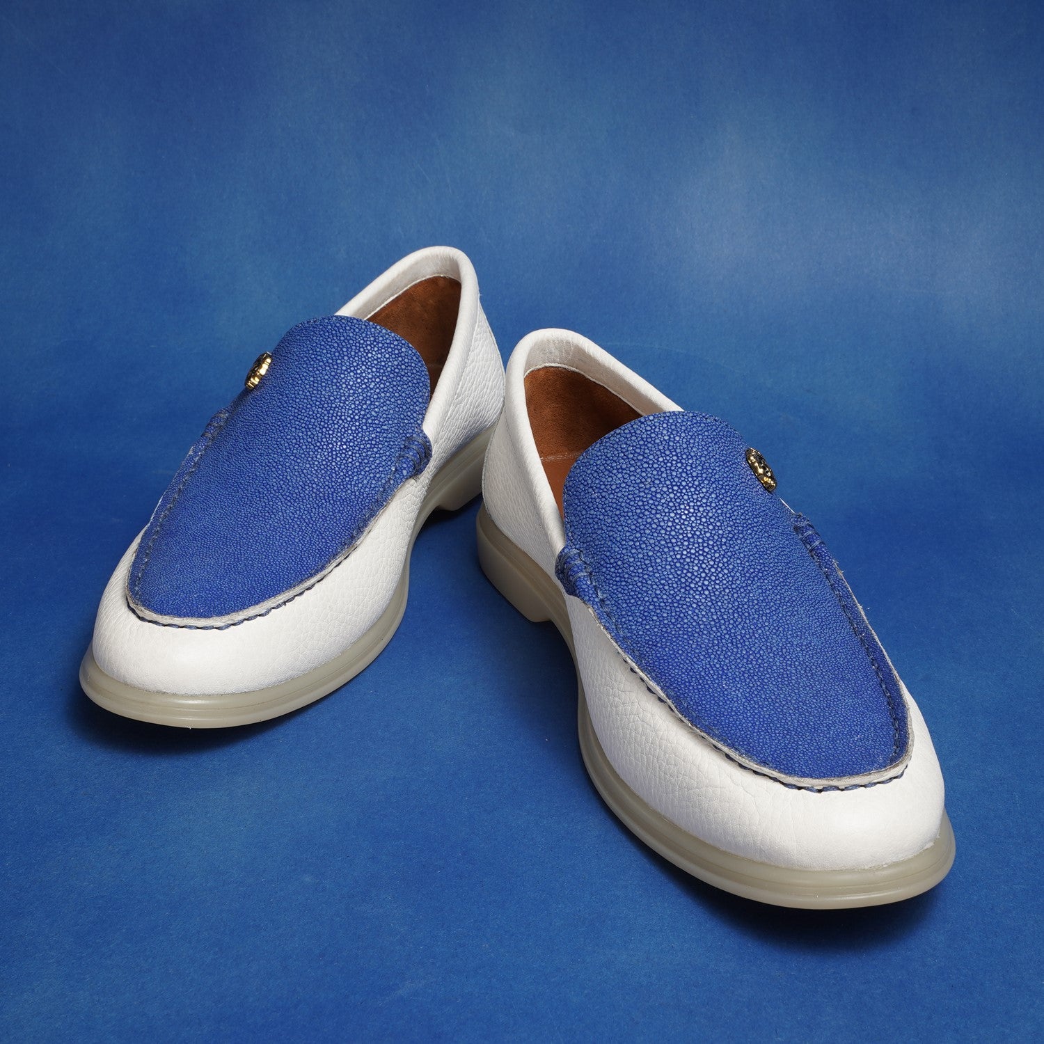 Step into unmatched sophistication with our Textured White Yacht Loafer featuring a bold twist—Blue Stingray Leather on the Vamp. This luxurious footwear is crafted for those who appreciate fine detailing and elevated style. The white base is finished with a subtle textured grain that evokes the breezy elegance of yacht life, while the exotic blue stingray leather on the vamp adds a striking focal point with its naturally pebbled, high-shine surface.