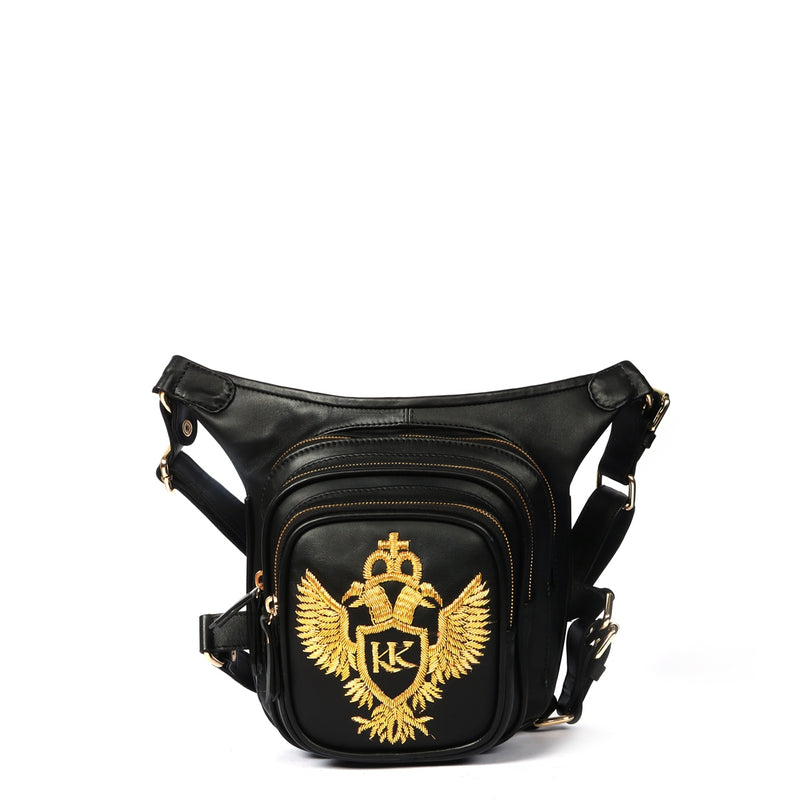 Thigh Pouch Travel Bag with Golden Zardosi In Black Leather
