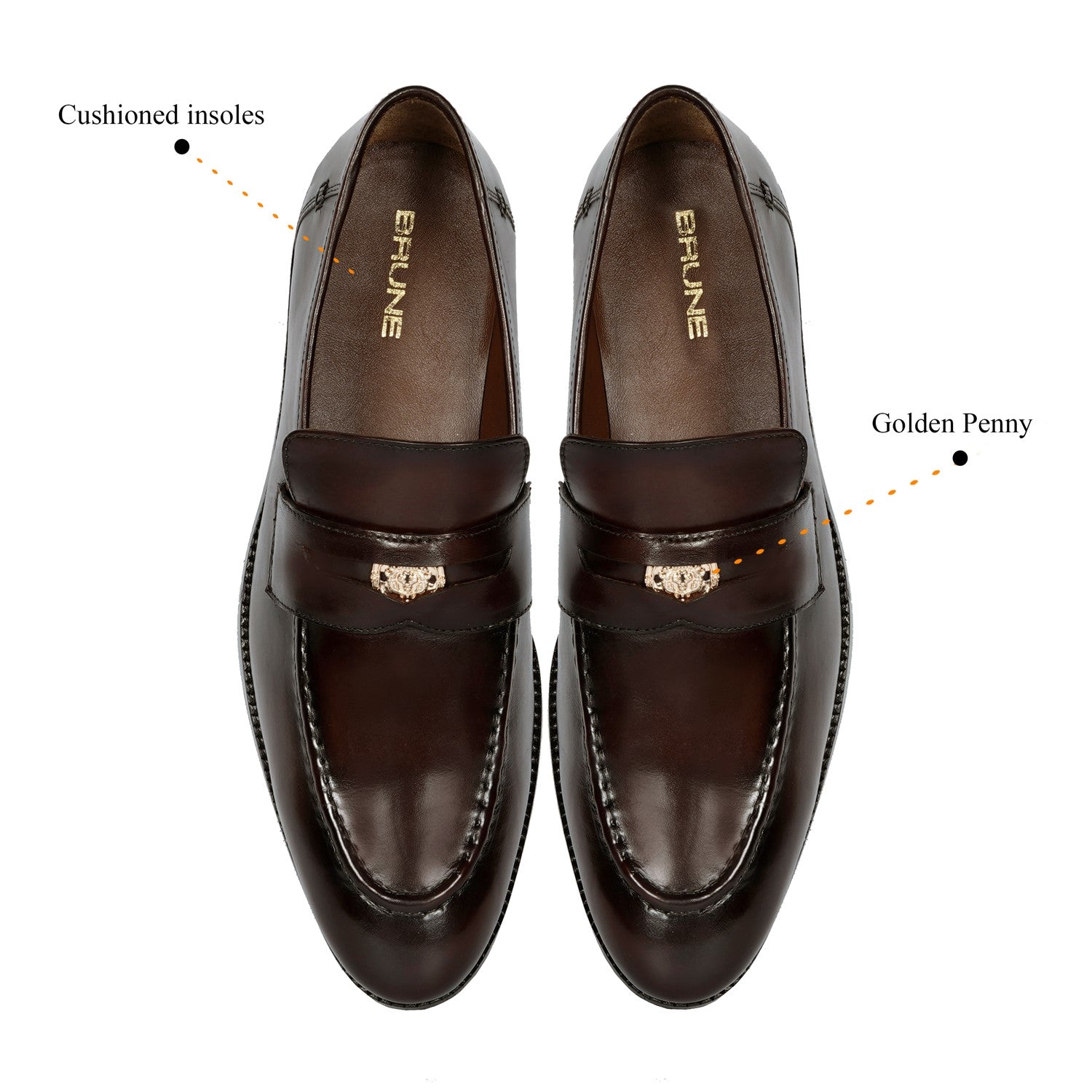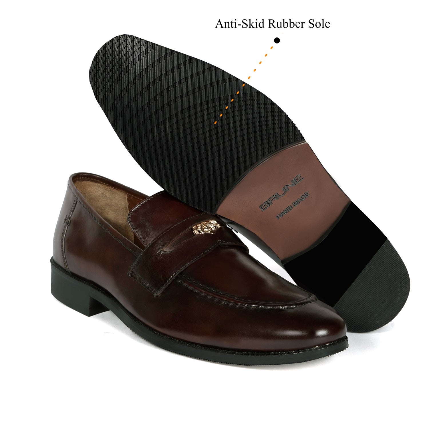 Brune & Bareskin's Loafers are perfect for making a classic and timeless statement. These stylish Dark Brown Penny Loafers by Brune & Bareskin will add a touch of sophistication to any outfit. Handmade from Genuine Leather, the iconic style, formal slip-on shoes feature a cut out with the trademark "Brune & Bareskin" lion logo embedded in a front slot. The extra-padded insole and rubber sole provide a comfortable and secure feel.