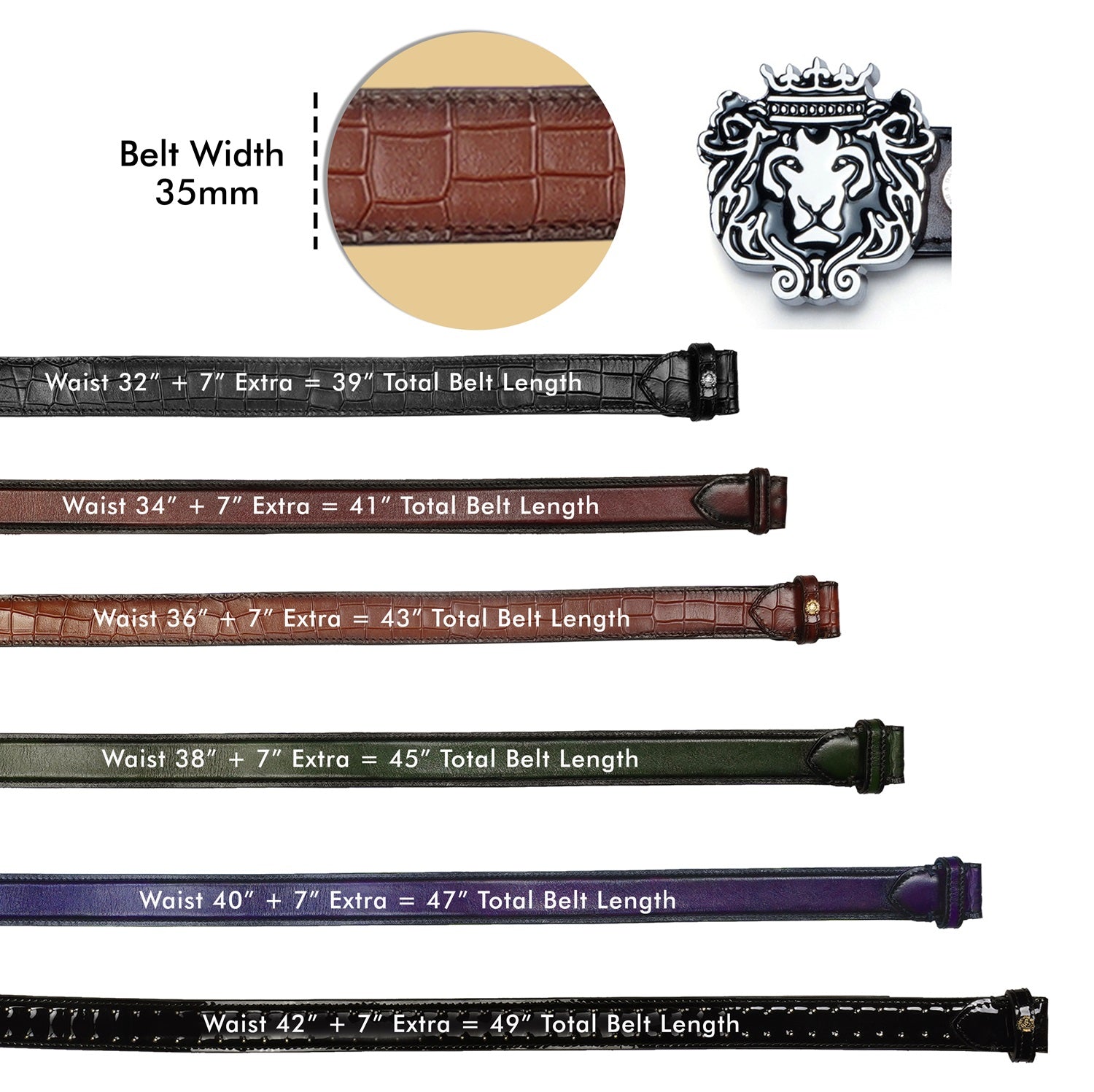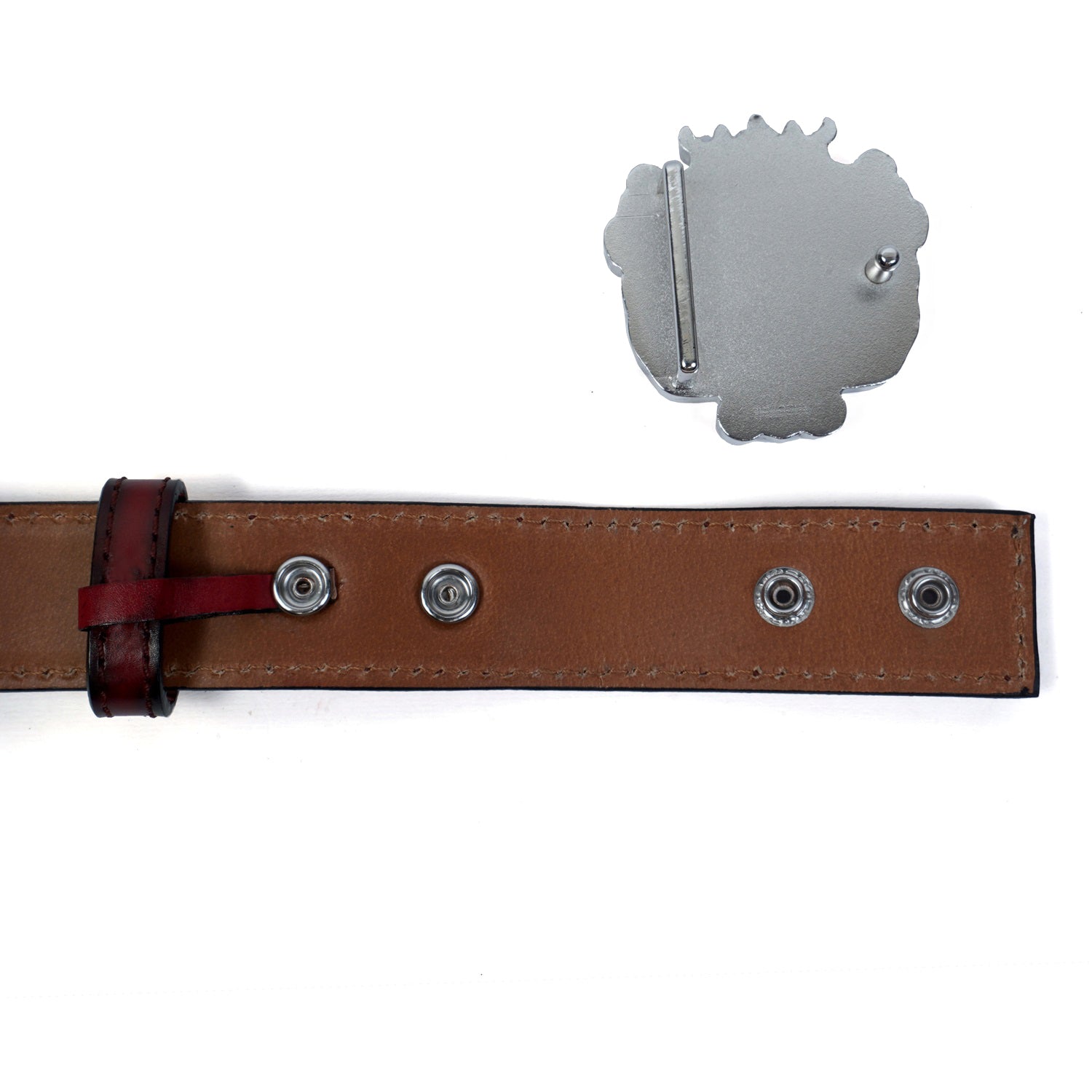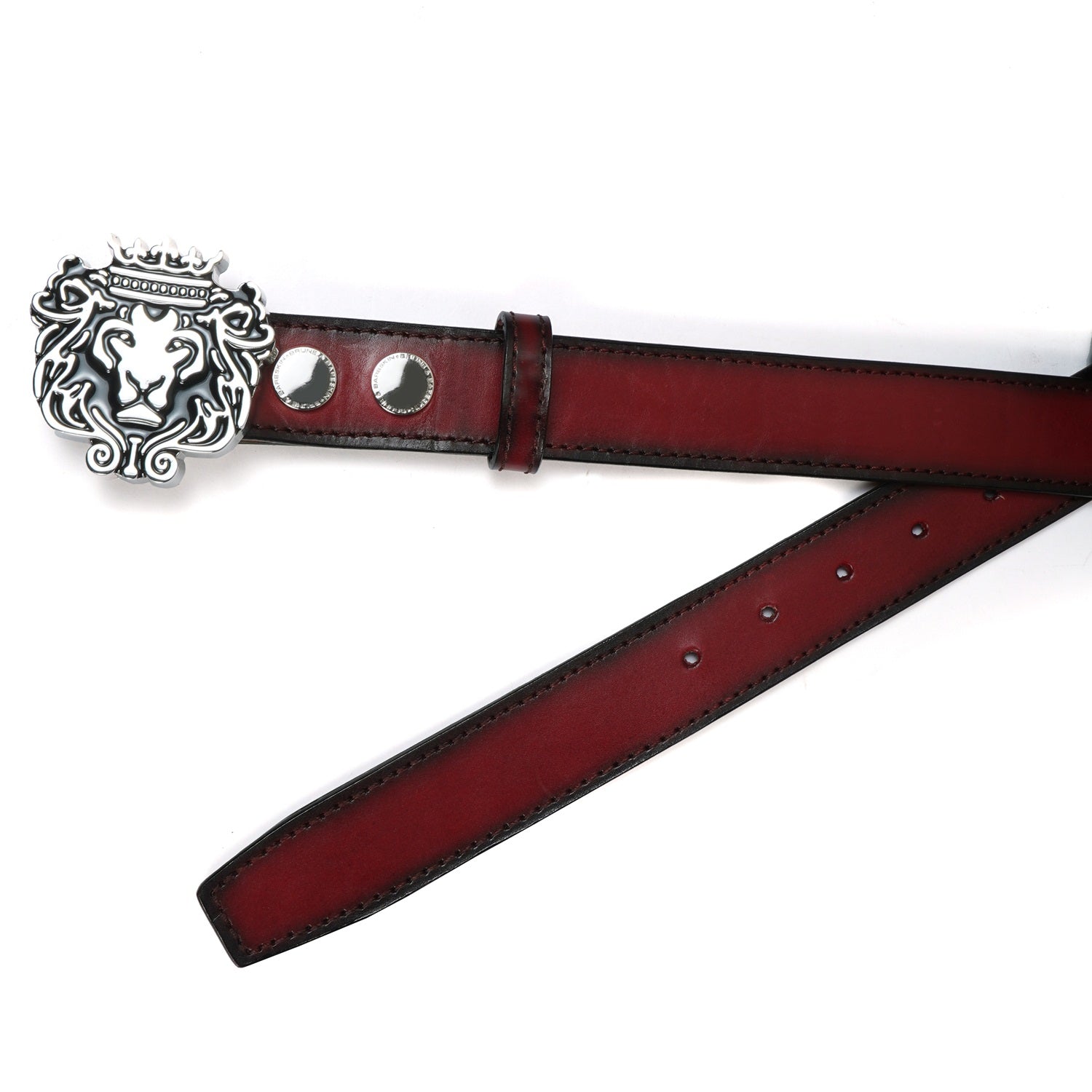 Add a touch of luxury to your look with the Trademark Logo Buckle Belt in wine genuine leather by Brune & Bareskin. This belt features a signature lion brand logo buckle and premium thick silver metal buckle that adds extra weight and quality. The burnished wine genuine leather strap is removable and can be easily changed to match your outfit, while the convenient snap buttons opening makes this belt both stylish and functional. Elevate your style with this premium quality belt.