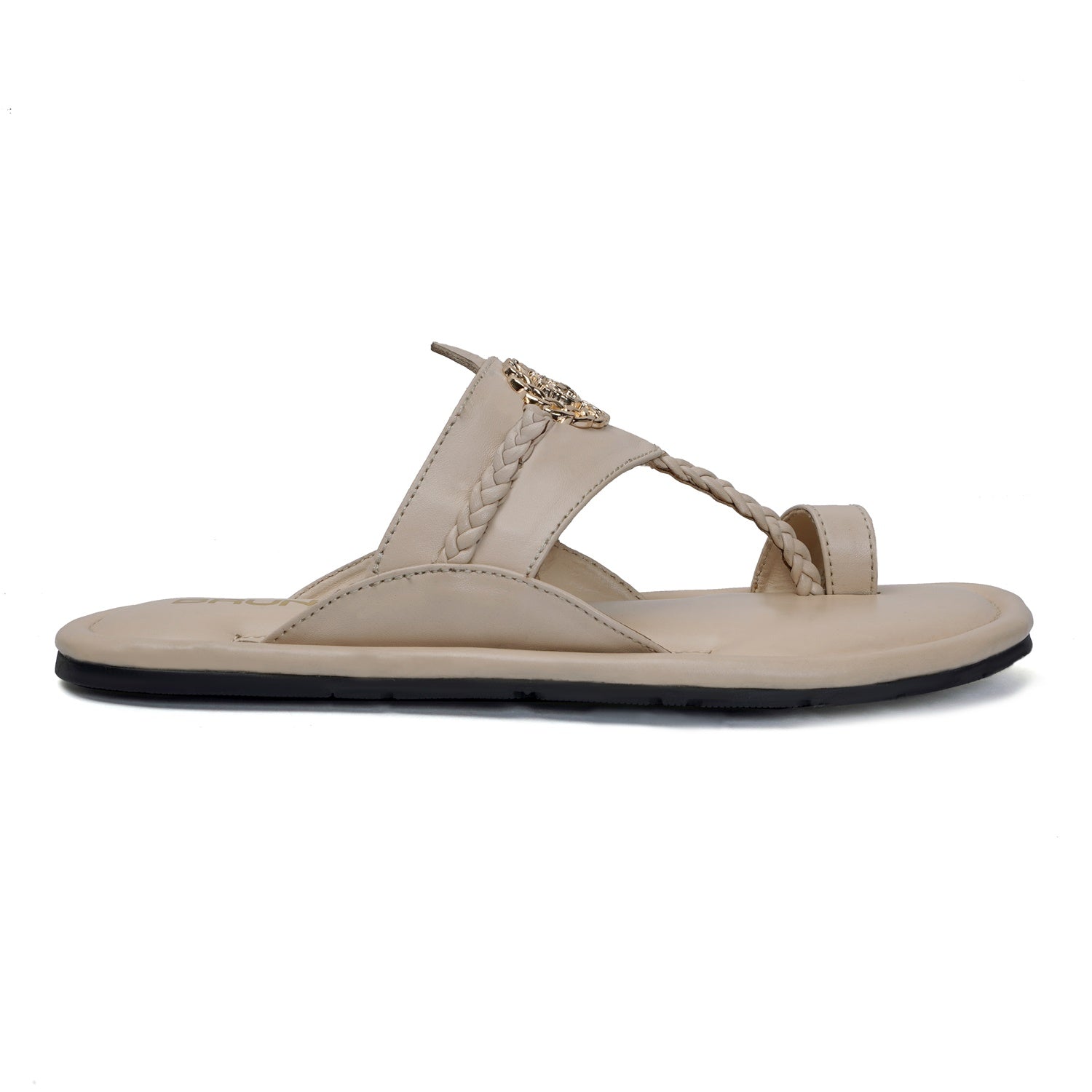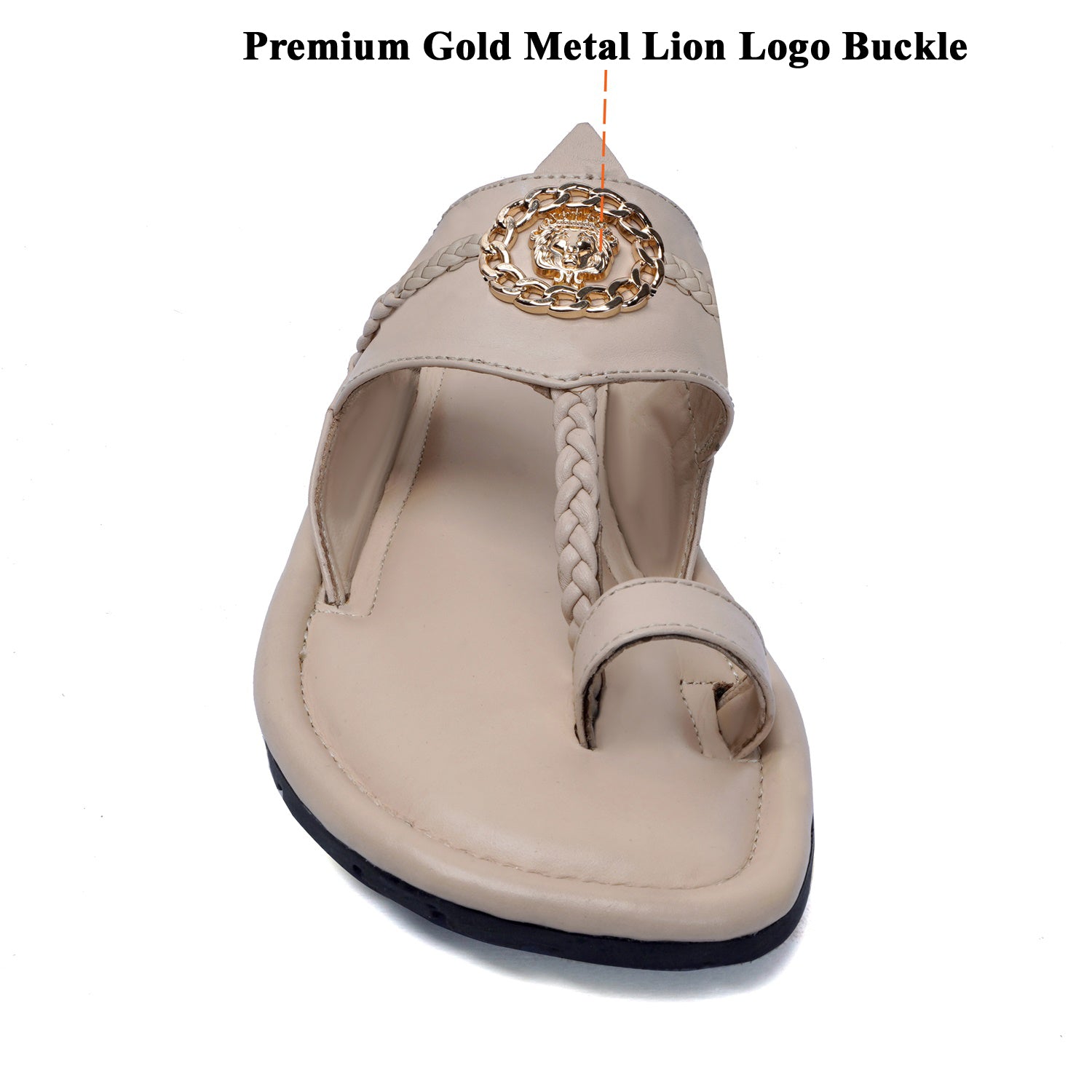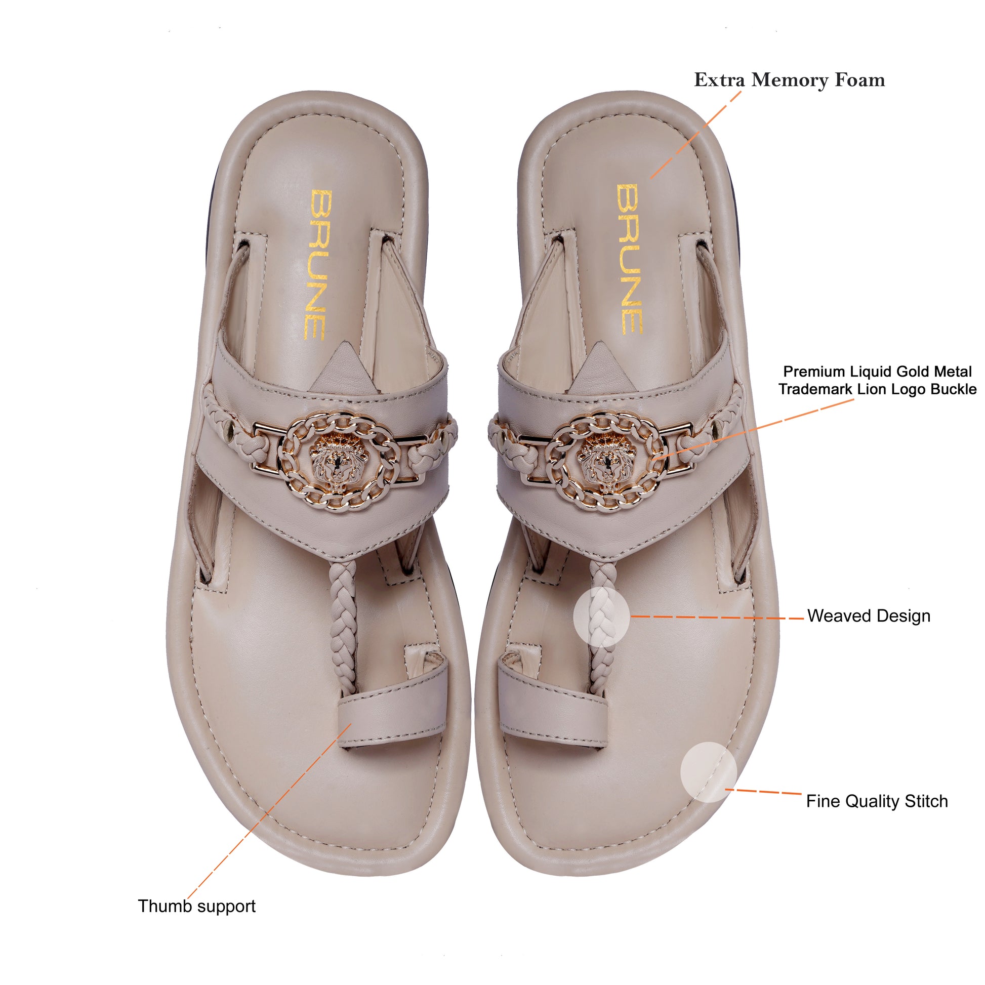 Experience the perfect blend of comfort and style with our Traditional Beige Kolhapuri Slipper. Handcrafted with premium quality genuine leather, this ethnic men's slipper features a T-Bar weaved style strap and a thumb support strap for added support. Its round toe design and super soft insole make it the perfect addition to your summer footwear collection. Complete with a gold finish metal lion buckle and chain embellishment on the vamp, this slipper is both comfortable and stylish. From the brand Brune & Bareskin, this slipper is a must-have for every man's wardrobe.
