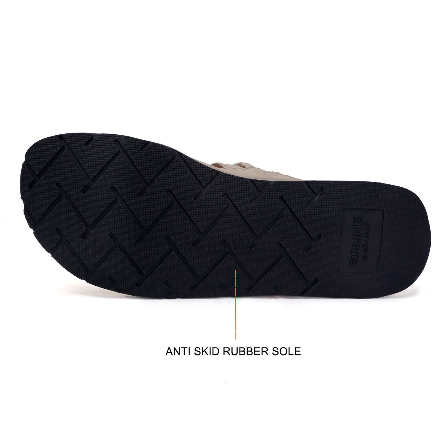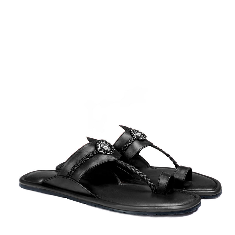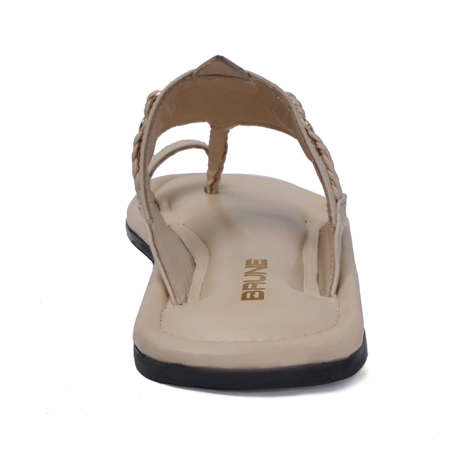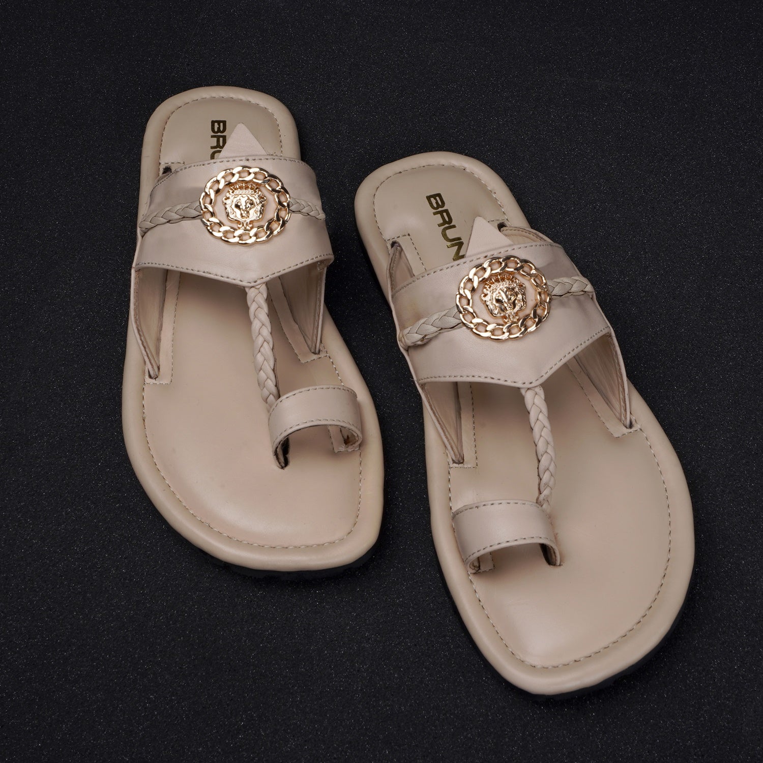 Experience the perfect blend of comfort and style with our Traditional Beige Kolhapuri Slipper. Handcrafted with premium quality genuine leather, this ethnic men's slipper features a T-Bar weaved style strap and a thumb support strap for added support. Its round toe design and super soft insole make it the perfect addition to your summer footwear collection. Complete with a gold finish metal lion buckle and chain embellishment on the vamp, this slipper is both comfortable and stylish. From the brand Brune & Bareskin, this slipper is a must-have for every man's wardrobe.