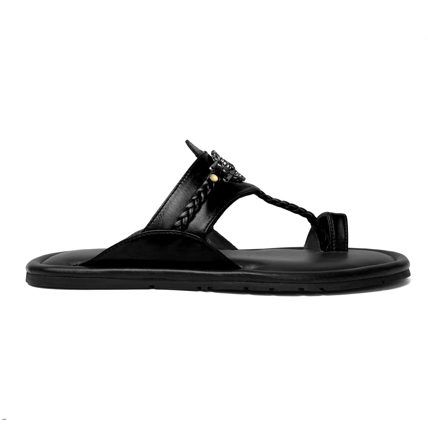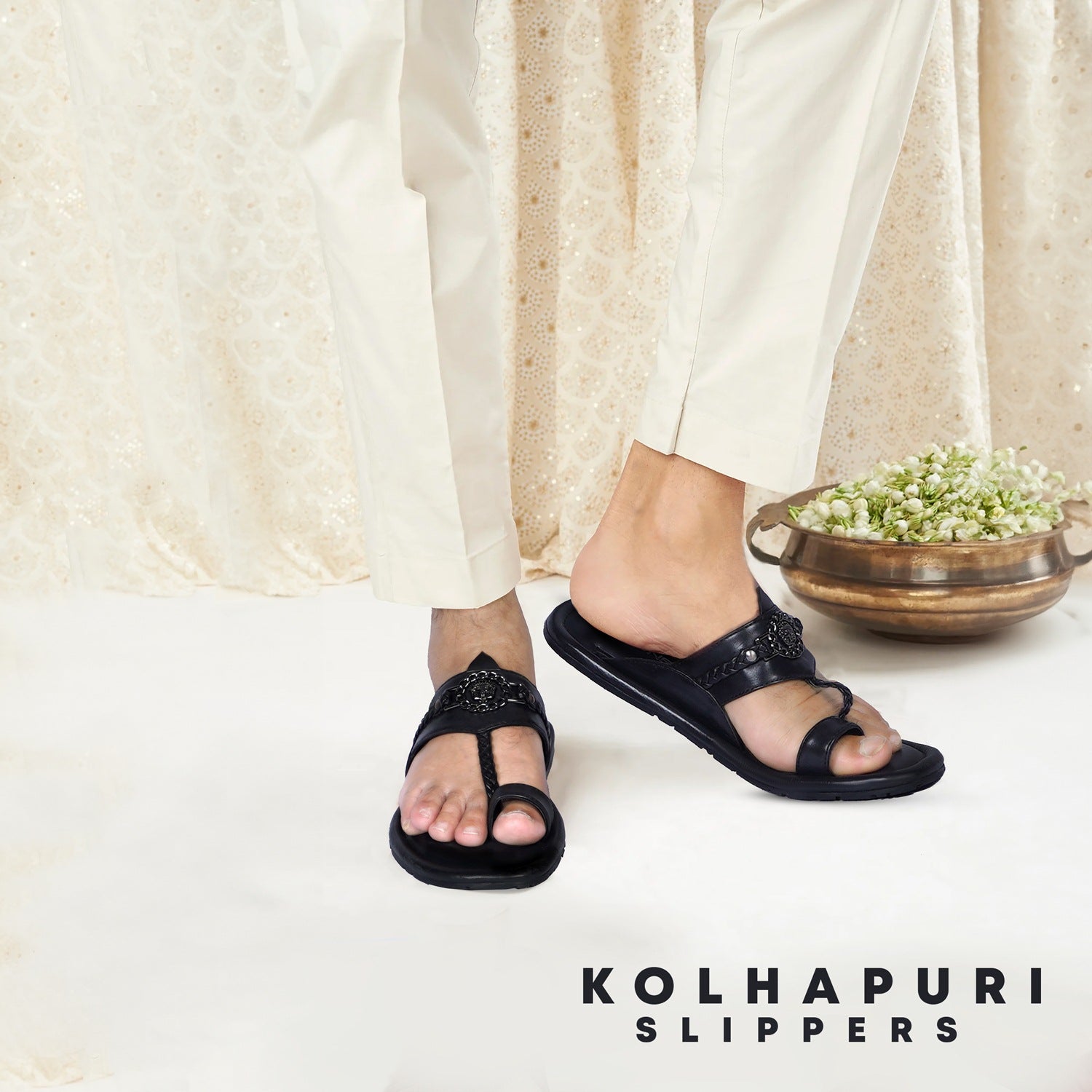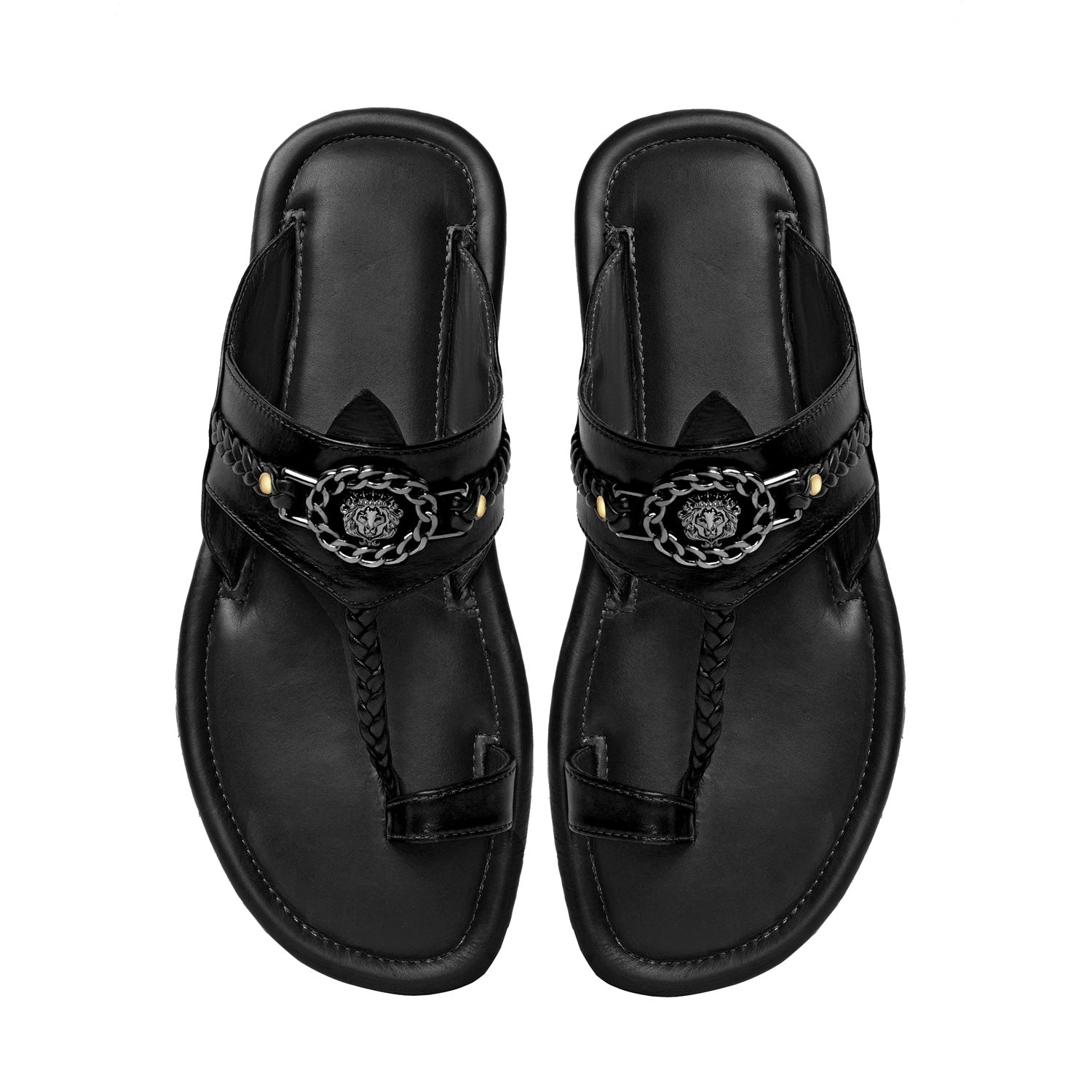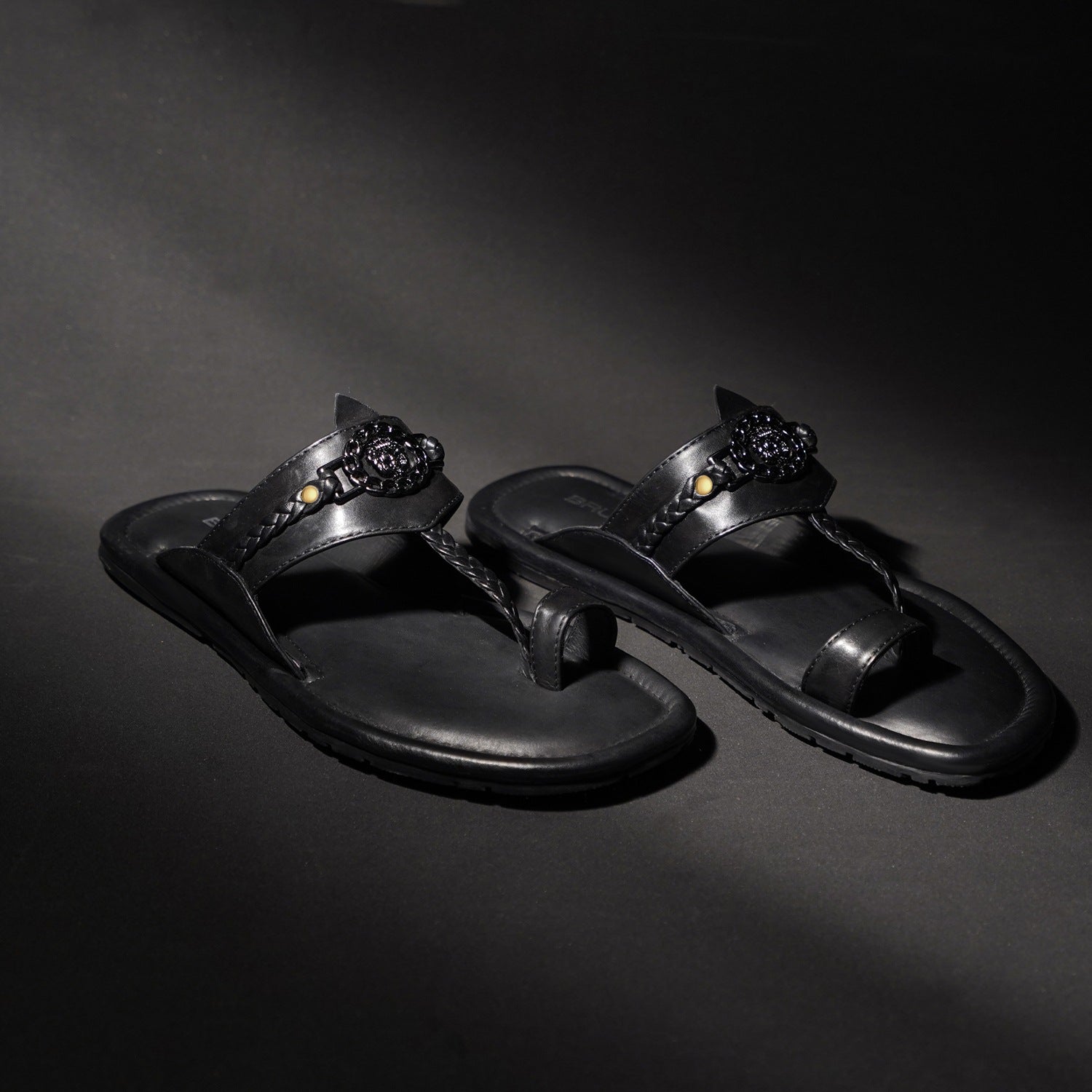 Experience pure comfort and style with the Brune & Bareskin Premium Quality Kolhapuri Slipper. Handcrafted with superior craftsmanship, this black slipper features a T-Bar weaved style strap, perfect for men looking for ethnic and stylish footwear. Constructed with genuine leather and adorned with a gunmetal lion buckle with chain embellishment, this slipper offers a comfortable Square Toe design and anti-skid rubberized sole. Complete your tribal summer footwear collection with this must-have slipper.