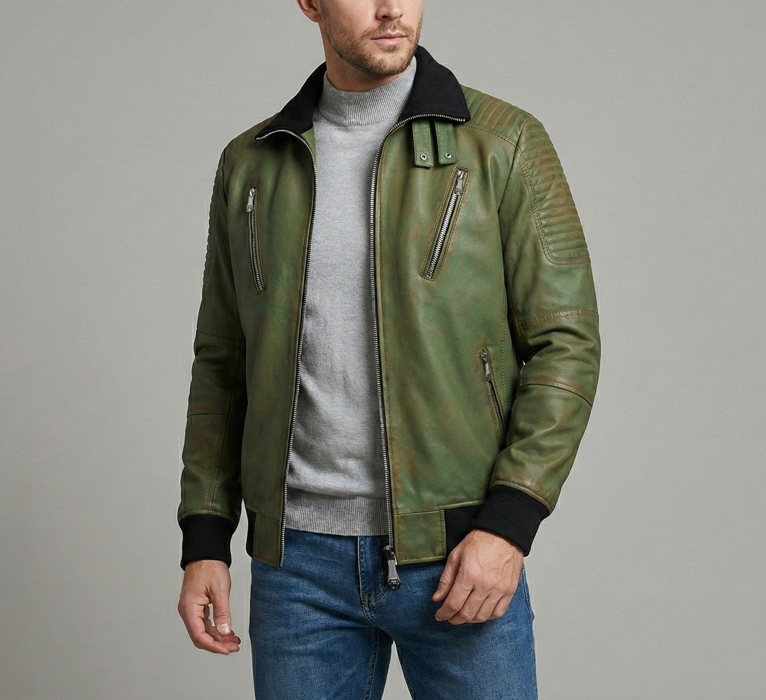 Turtle Ribbed Collar Jacket For Men in Green Rustic Genuine Leather By Brune & Bareskin
