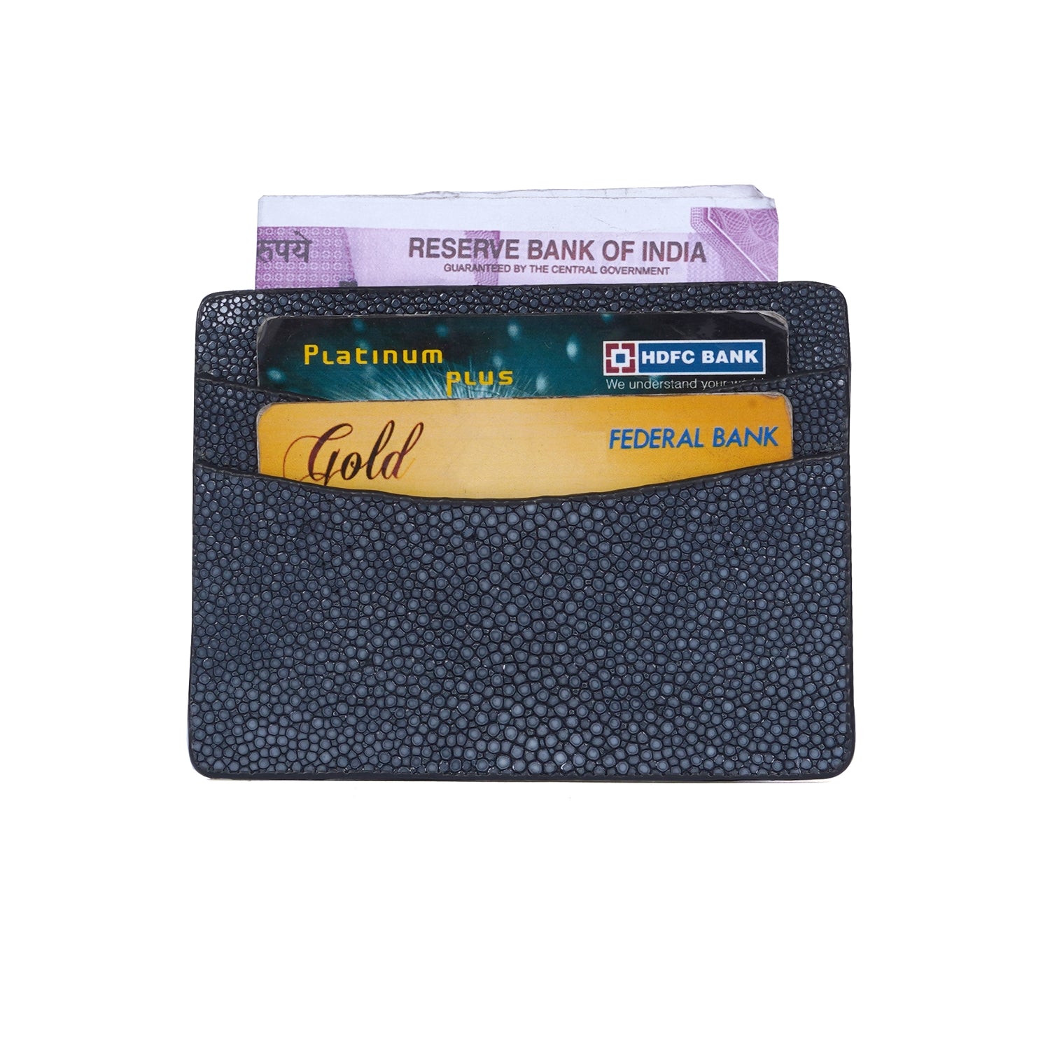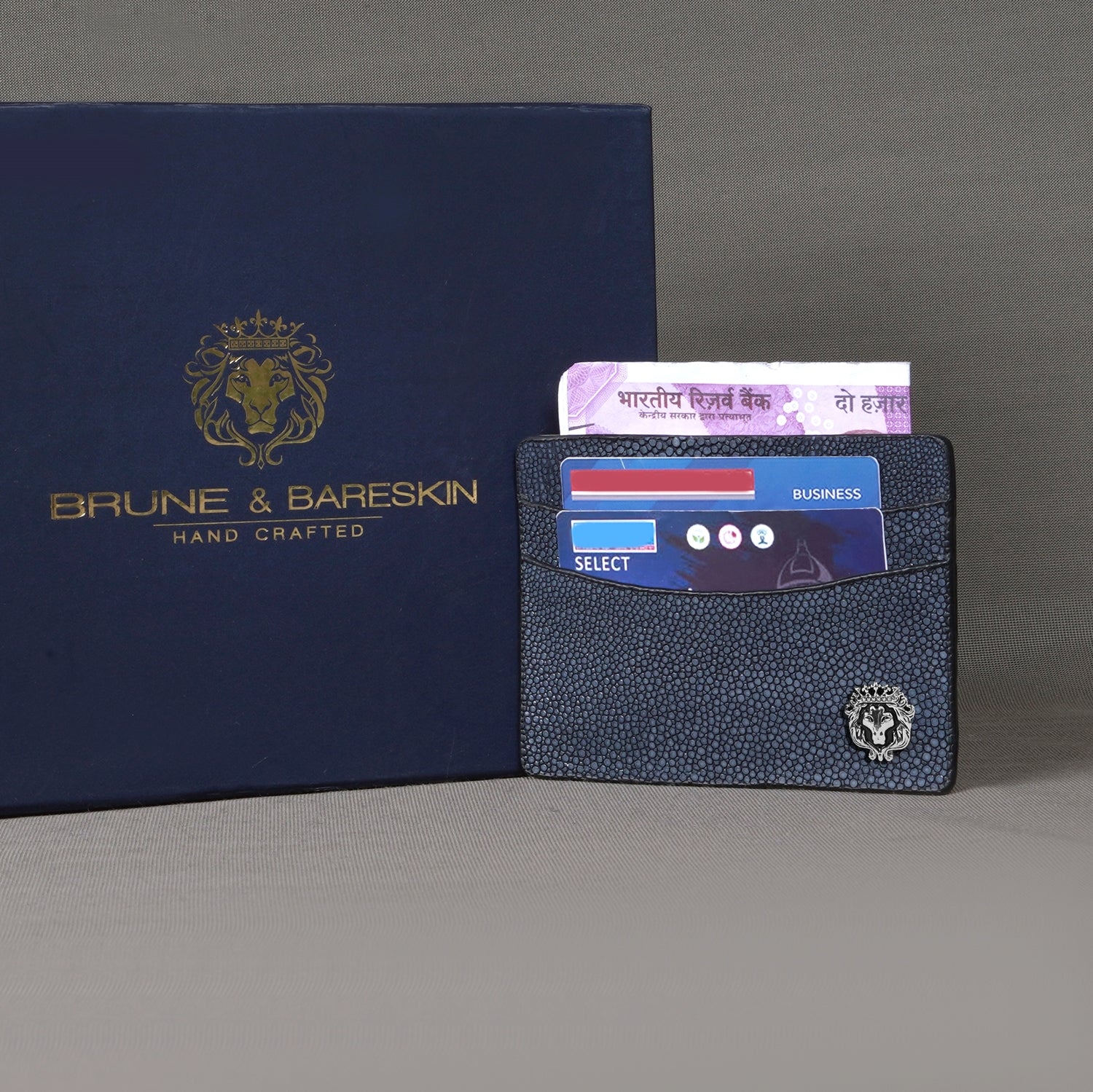 This card holder by Brune & Bareskin is made with genuine Stingray Leather. It has a unique texture which makes it look like pearl beaded. It is carefully handcrafted to slip easily into any pocket. It has a natural shine which only increases with regular usage. This card holder has one pocket in the center & 4 card slots (2 on each side). Due to its ultra-durability & superior quality it can easily last up to 4 decades. It is scratch & water resistant. This leather has a natural shine which only increases with regular usage. Due to its superior quality & ultra durability it can last for 4 decades easily. It is water & scratch resistant.