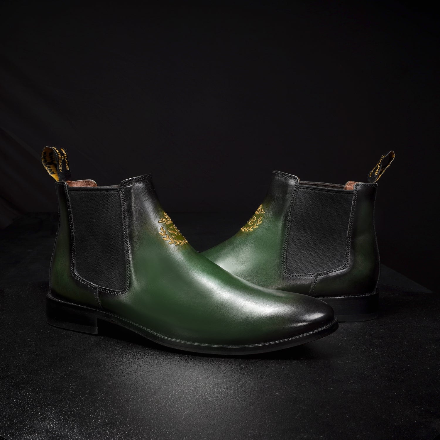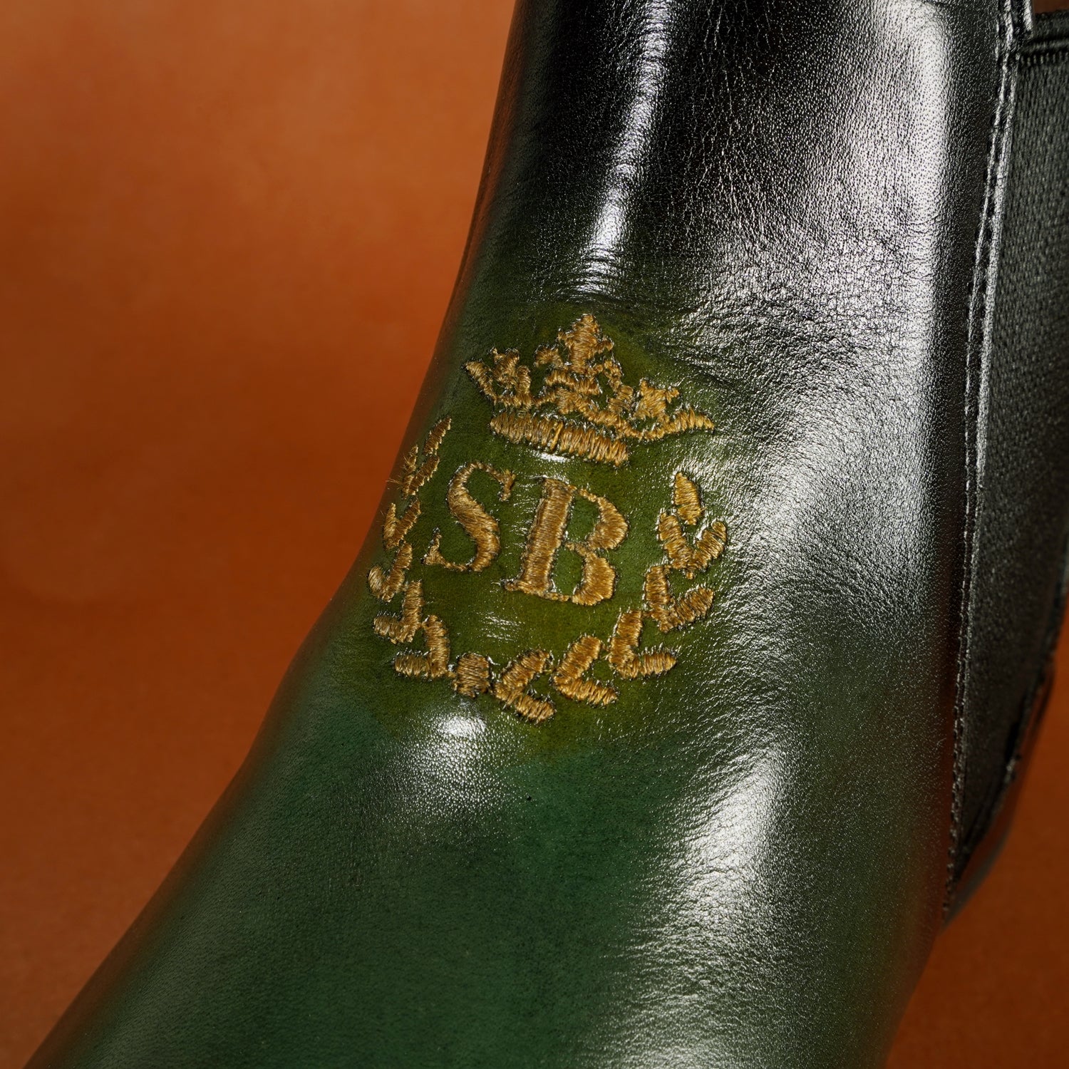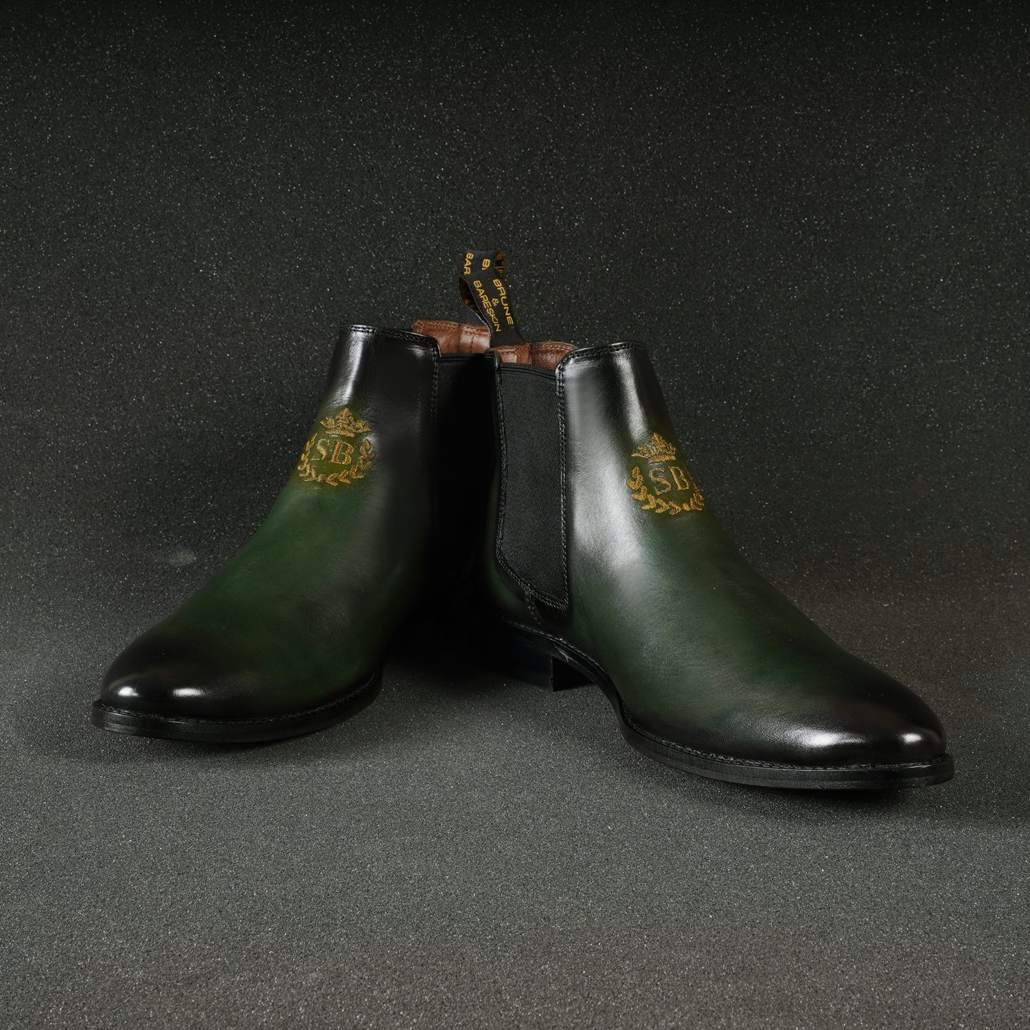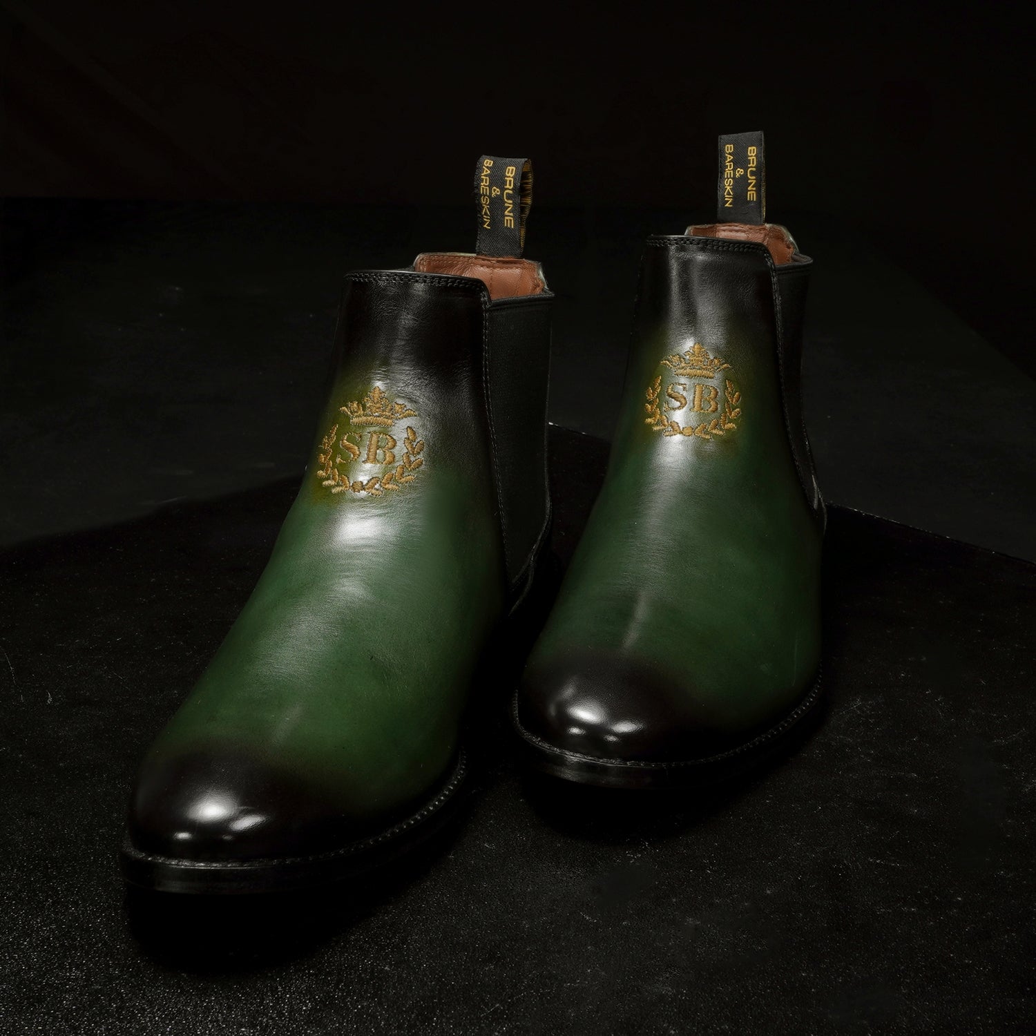 We are introducing the great opportunity for our customers to write their names and initials on the products. The Initials can be done with the Coloring technique, Laser and with metal Initials. These high ankle green leather Chelsea boots are made to give you an elite look. The contrasting side elastic enhances the look of this Chelsea Boot. Hand Crafted Embroidery Green Leather Brune & Bareskin Boots are crafted to provide the utmost comfort and next-level style. Tips of these pointed leather shoes are burnished deeper with the color running along the sides of the quarter to the ankles. They are made from Imported Leather with a comfortable foot-bed. The leather sole provides an extra oomph to it. It is a perfect pair to carry on long travels. As Per the Customer Demand "SB" Name initial is done at the Front top of the (Tongue) Chelsea Boot. The hand crafted embroidery initial color choice is done by our customer. The company " Brune & Bareskin" complements the fashion statement in a unique way to help customers cherry-pick from the collection & feel better & look better. You can click on CUSTOMIZE NOW Button (Just above "ADD TO CART" button) & fill the form to submit your customization requirements. Or you can reach us by Call, Email, WhatsApp and DM.
