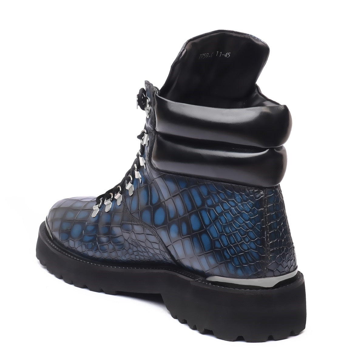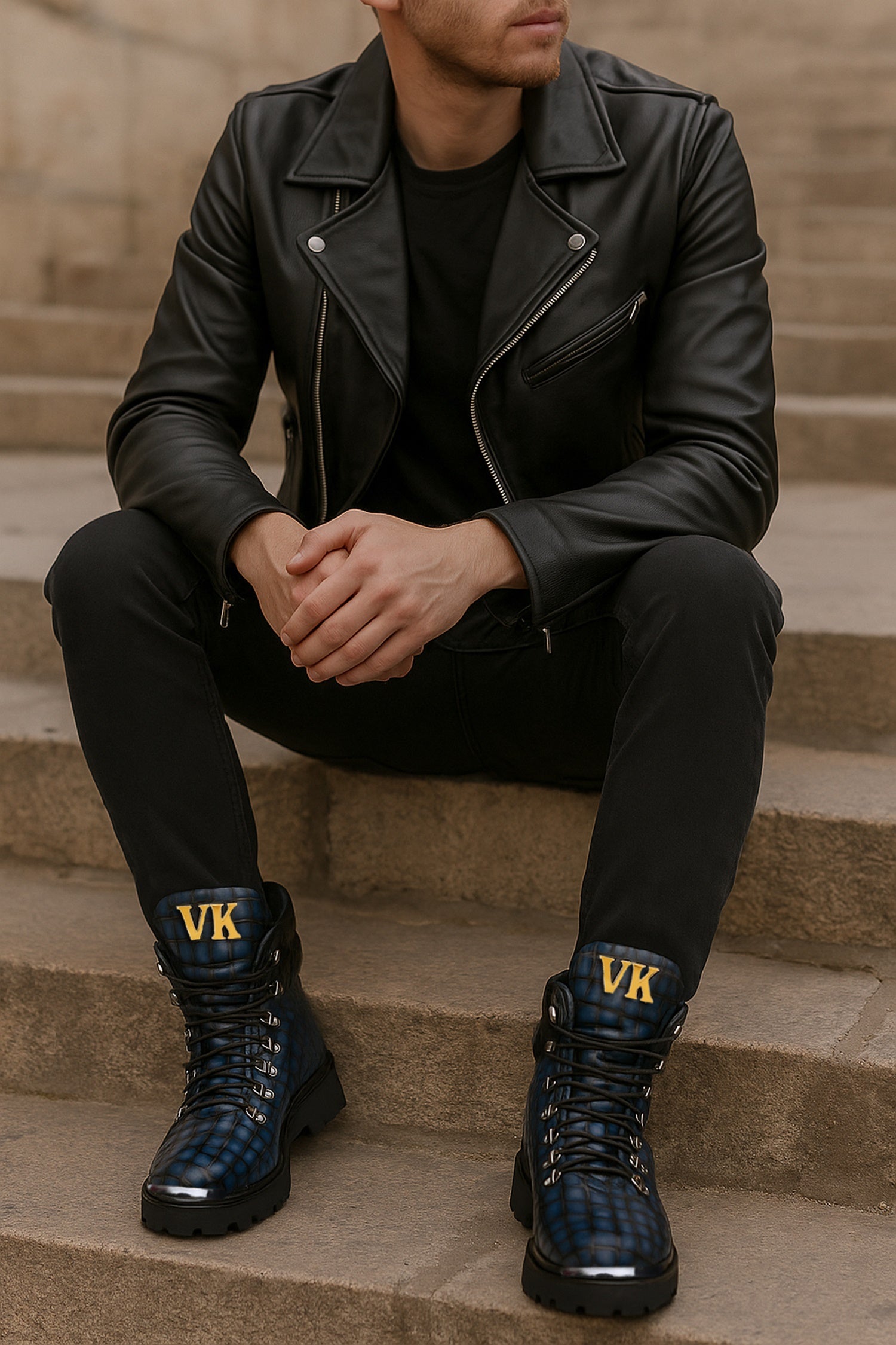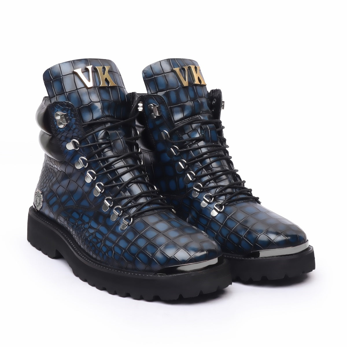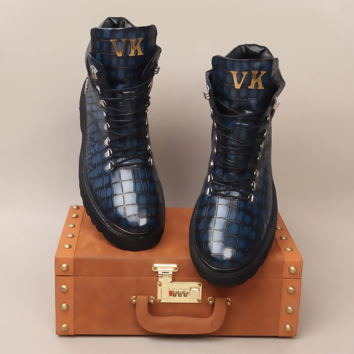 Bespoke "VK" Initial Blue Deep Cut Croco Leather Biker Boots For Men By Brune & Bareskin