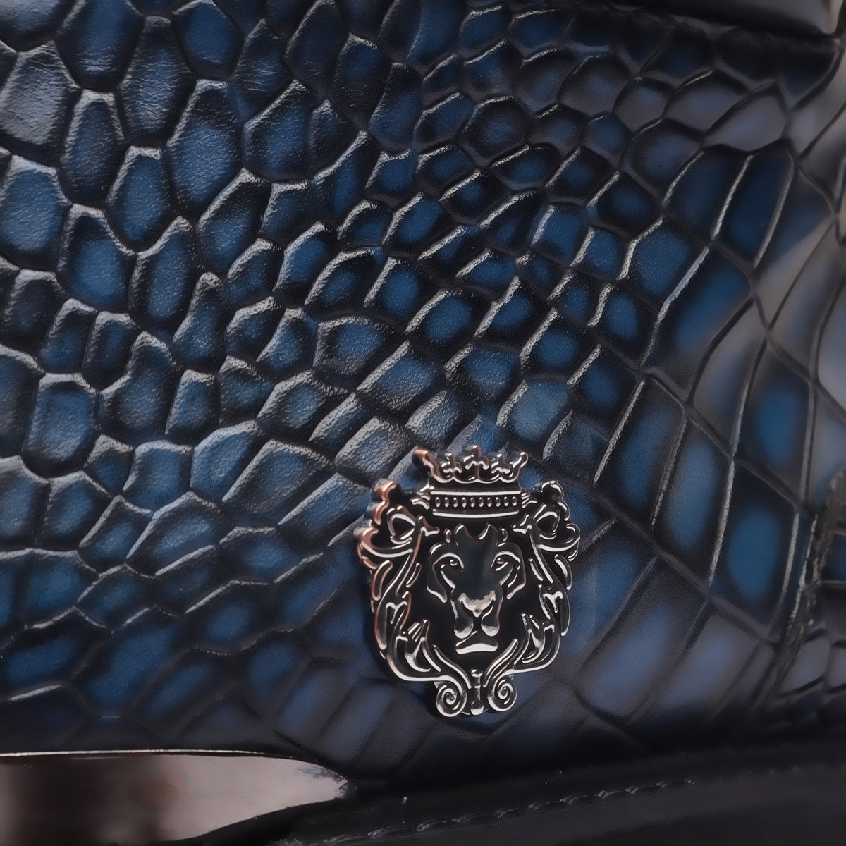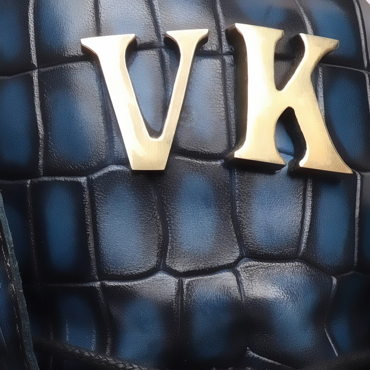 We are introducing the great opportunity for our customers to write their names and initials on the products. The Initials can be done with the Coloring technique, Laser and with metal Initials. Hand-Painted Blue Finish Deep Cut Croco Leather Brune & Bareskin Boots are crafted to provide the utmost comfort and next-level style. It is a perfect pair to carry on long travels. Smokey Blue Finish Deep Cut Croco shoe looks lavishing with metal shoe eyelets and Brune & Bareskin's signature metal lion logo. The metal plates on the toe and ankle provide more rigidity and oomph to it. As Per the Customer Demand "VK" Metal name initial is done at the Front top of the (Tongue) Croco Boot. The metal initial color choice is done by our customer.