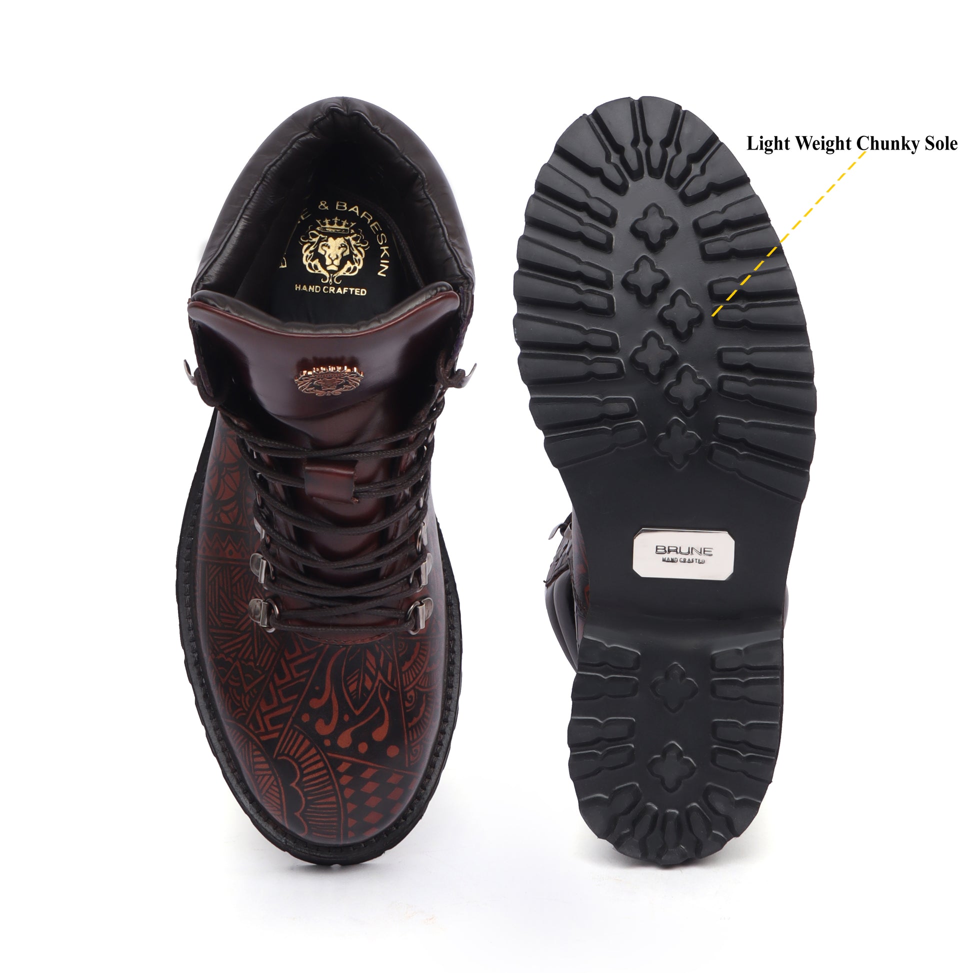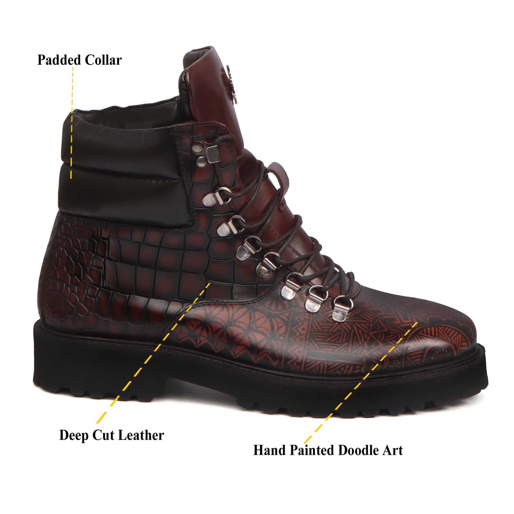 Customized Hand Painted Doodle Art Dark Brown Deep Cut Leather Light Weight Biker Boot by Brune & Bareskin