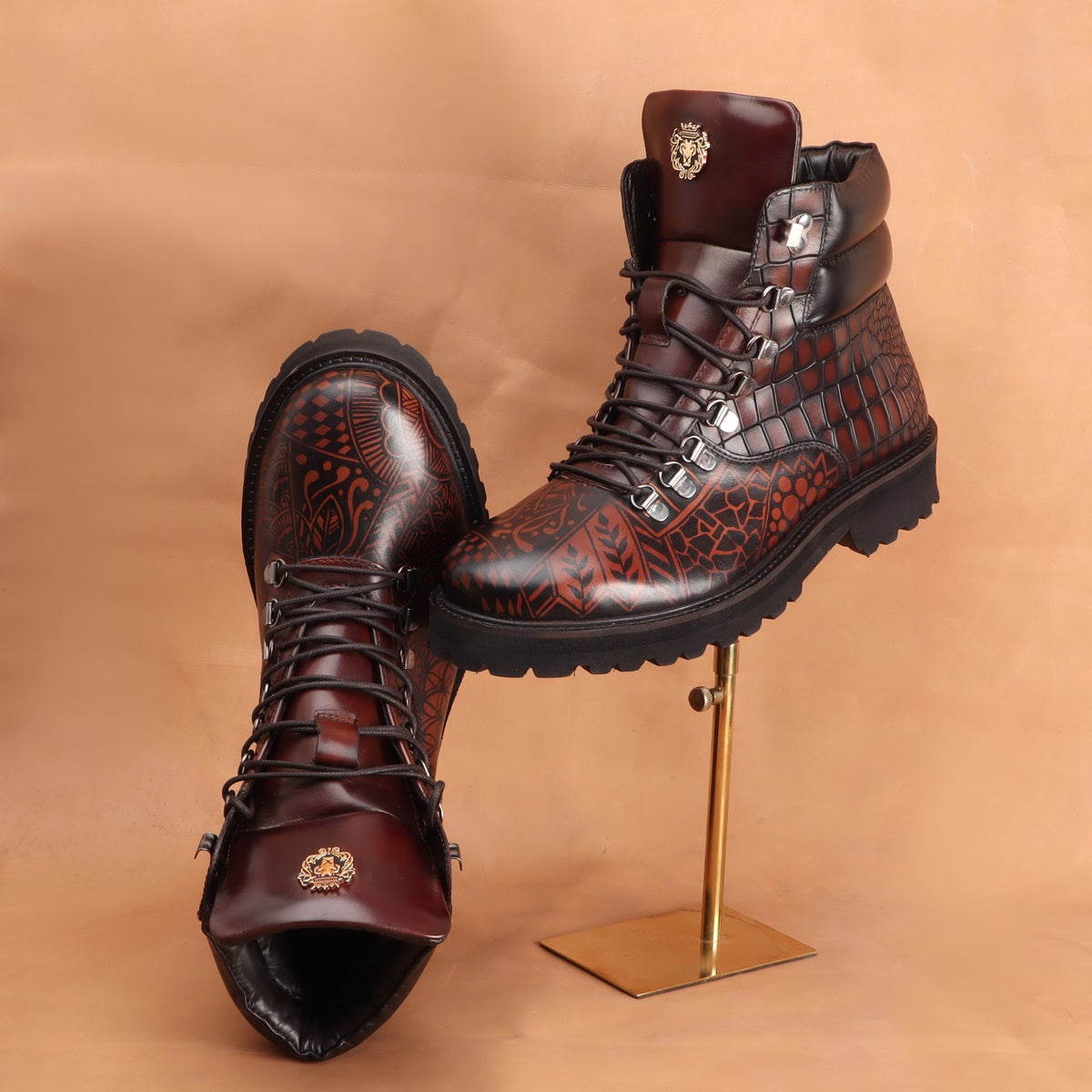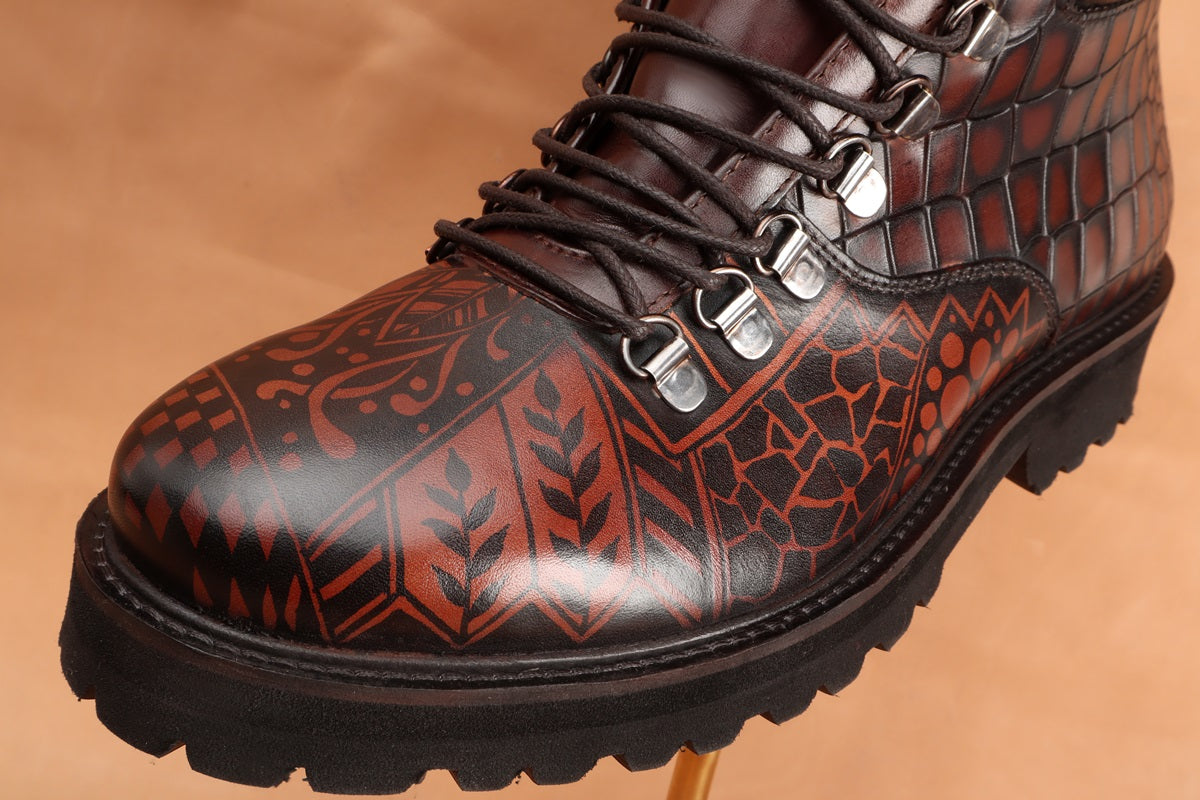 We are introducing the great opportunity for our customers to write their names and initials on the products. The Initials can be done with the Coloring technique, Laser and with metal Initials. Brune & Bareskin boots in deep cut croco Hand Painted leather are a dream come true for many a fashion-aware executives. These ankle-length shoes are fitted shoes that emphasize the size and shape of your feet to perfection. As per Customer demand Dark Brown Finish on Quarter Half Deep Cut Croco Leather and from front toe to quarter specially customized hand-painted Doodle art dark brown leather boot is an art masterpiece. Brune & Bareskin Boots are crafted to provide the utmost comfort and next-level style. It is a perfect pair to carry on long travels. These boots are very light in weight with a full heavy-duty look. The imported tanned genuine leather ensures its longevity for a very long time. The ultra-lightweight sole makes it ideal footwear for all-day-long wear-ability and the thick high lightweight sole complements the comprehensive look. You can make a travel combo with a matching Leather bag and jacket and Accessories. The company " Brune & Bareskin" complements the fashion statement in a unique way to help customers cherry-pick from the collection & feel better & look better. You can click on CUSTOMIZE NOW Button (Just above "ADD TO CART" button) & fill the form to submit your customization requirements. Or you can reach us by Call, Email, Whats-app and DM.