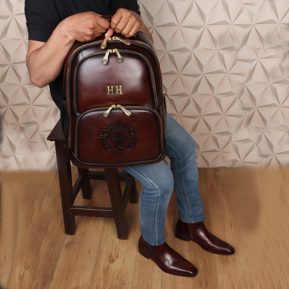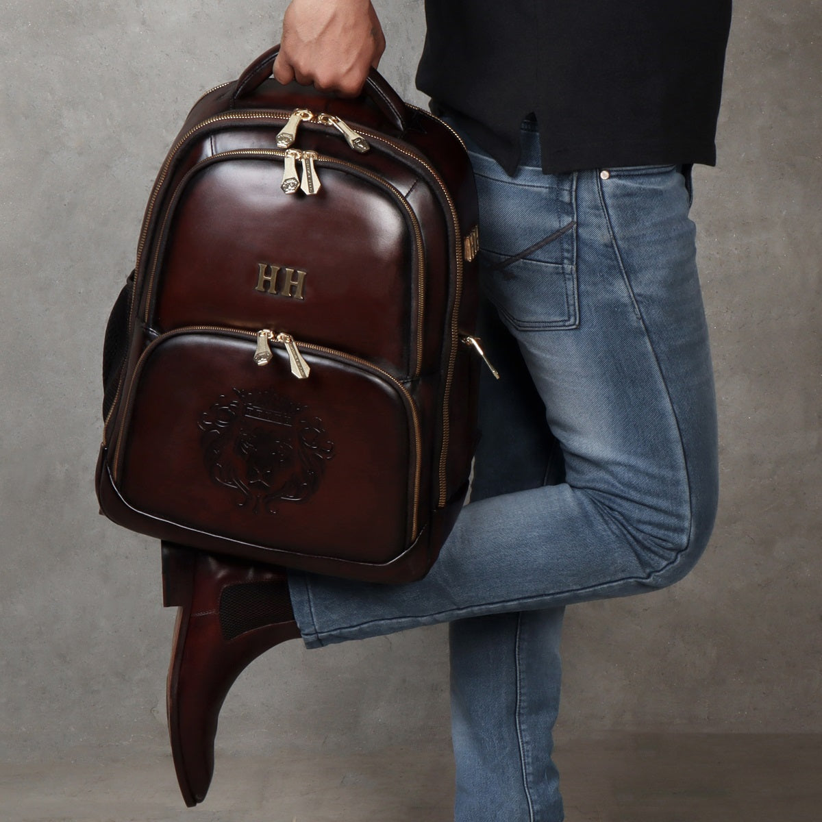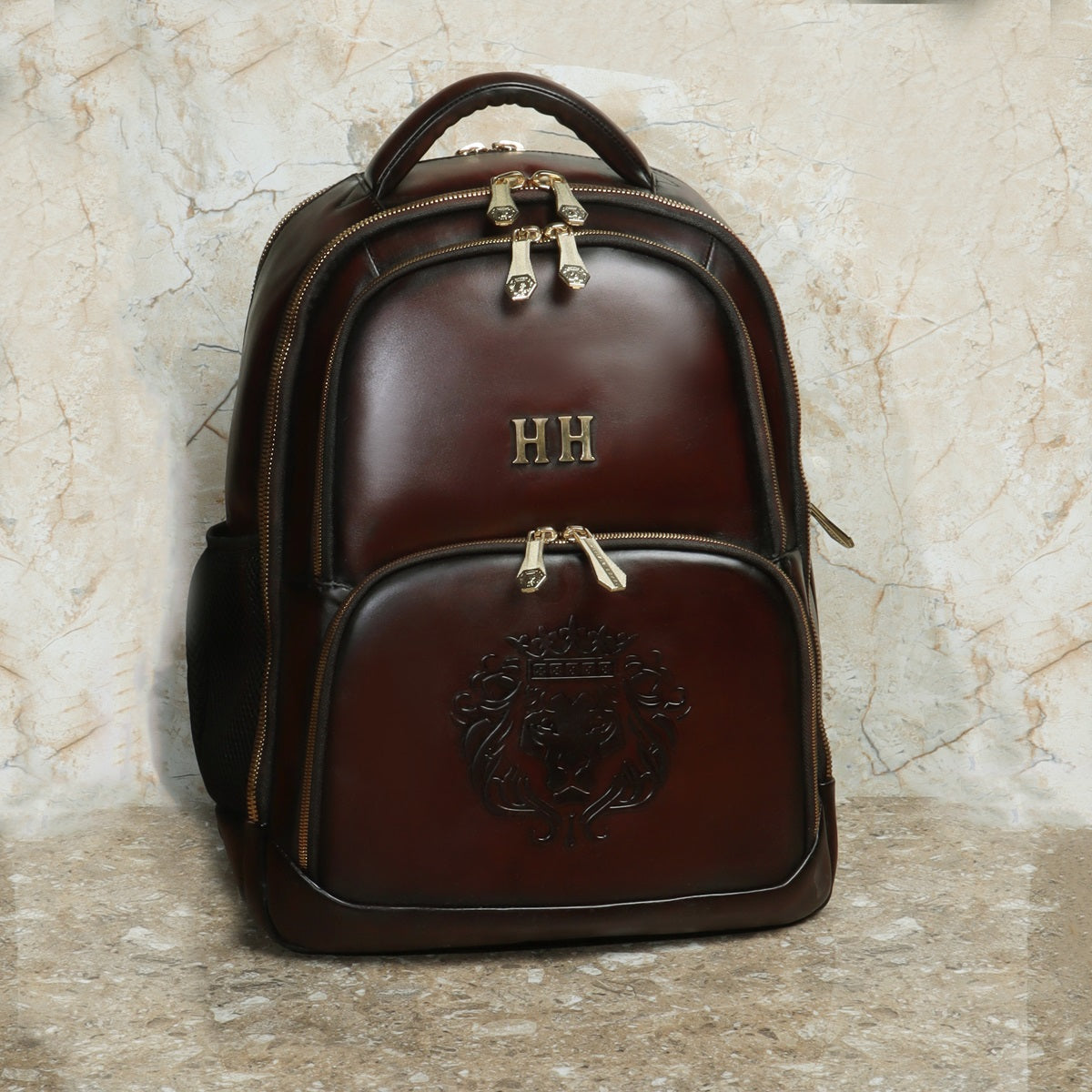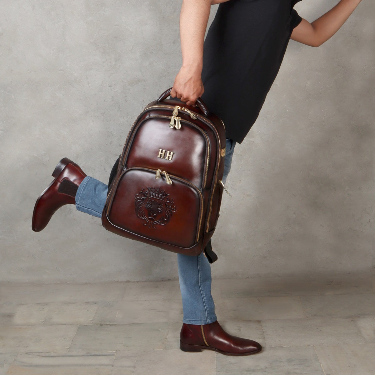 Colors in Leathers are rare to see, but we are here to ask "What is your choice of color in Leather?" It's a Dark Brown Genuine Leather Backpack. 2 large zip compartments including laptop pocket & suitcase opening to carry clothes and 2 small pockets to carry documents or any other your necessity. Its elegant look ensures to keep every eye on you. Specially Customized 'HH' metal name Initials crafted on the front of the bag as we received a request to place it. This is a perfect accessory for a perfect airport look. Embossed Lion Logo & its unique color is enhancing the royalty of the products. The precisely created size makes it easy to go on flights as a check-in luggage bag. Padded straps and back make it very comfortable while carrying on shoulders. You can write your name Initials on the products too with coloring technique. You can click on CUSTOMIZE NOW Button (Just above the "ADD TO CART" button) & fill out the form to submit your customization requirements. Or you can reach us by Call, Email, WhatsApp, and DM.