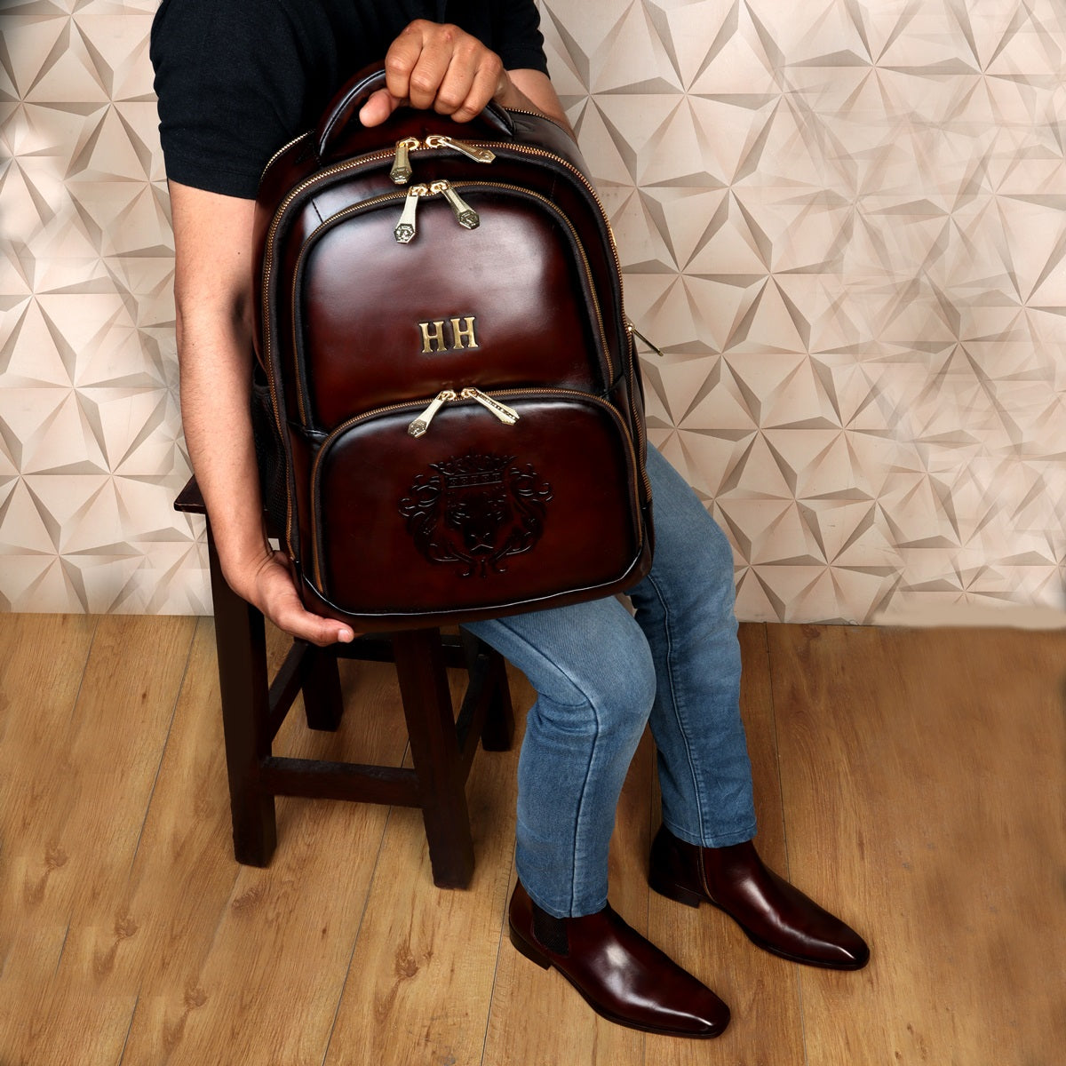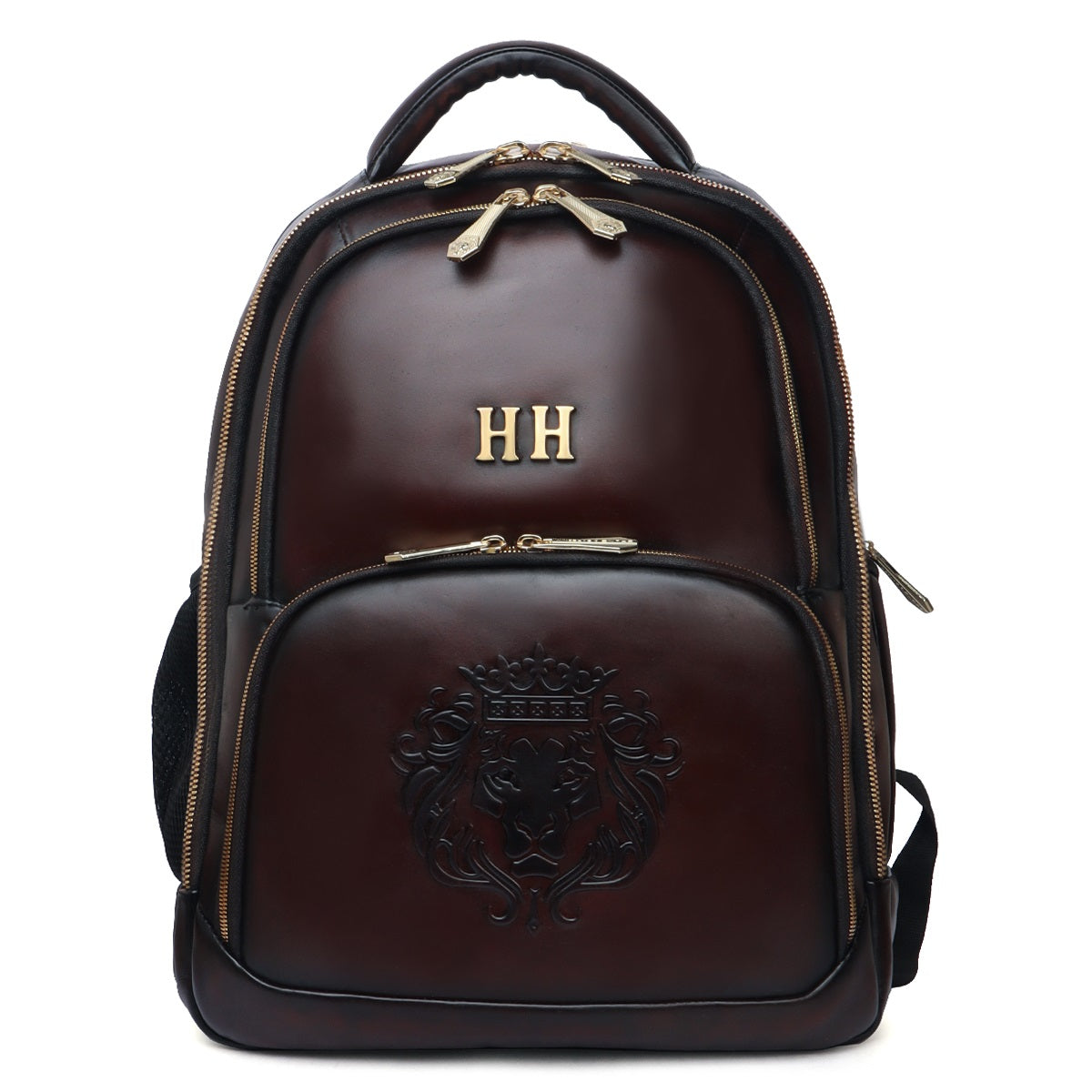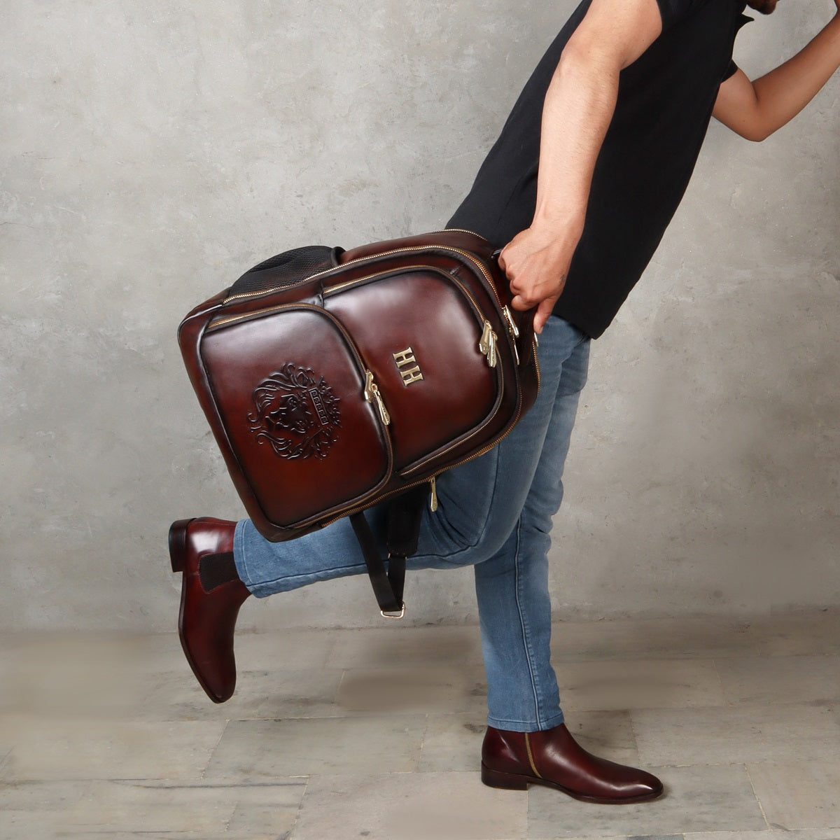 Colors in Leathers are rare to see, but we are here to ask "What is your choice of color in Leather?" It's a Dark Brown Genuine Leather Backpack. 2 large zip compartments including laptop pocket & suitcase opening to carry clothes and 2 small pockets to carry documents or any other your necessity. Its elegant look ensures to keep every eye on you. Specially Customized 'HH' metal name Initials crafted on the front of the bag as we received a request to place it. This is a perfect accessory for a perfect airport look. Embossed Lion Logo & its unique color is enhancing the royalty of the products. The precisely created size makes it easy to go on flights as a check-in luggage bag. Padded straps and back make it very comfortable while carrying on shoulders. You can write your name Initials on the products too with coloring technique. You can click on CUSTOMIZE NOW Button (Just above the "ADD TO CART" button) & fill out the form to submit your customization requirements. Or you can reach us by Call, Email, WhatsApp, and DM.