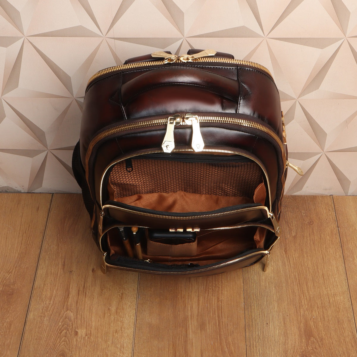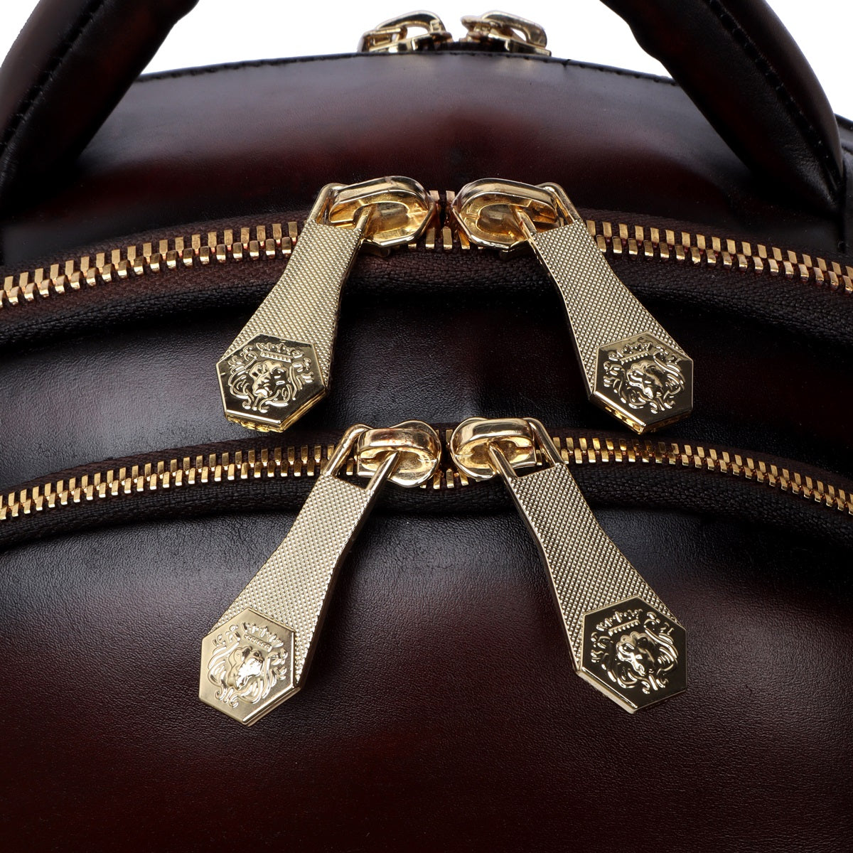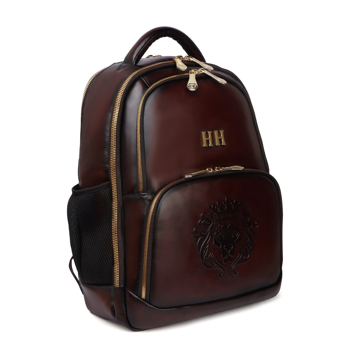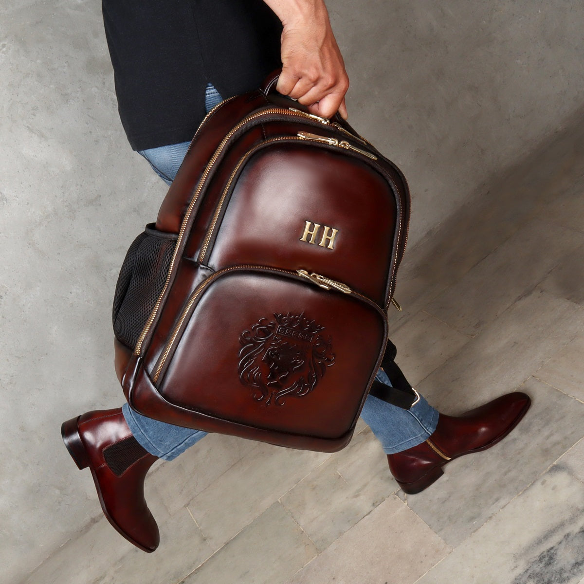 Colors in Leathers are rare to see, but we are here to ask "What is your choice of color in Leather?" It's a Dark Brown Genuine Leather Backpack. 2 large zip compartments including laptop pocket & suitcase opening to carry clothes and 2 small pockets to carry documents or any other your necessity. Its elegant look ensures to keep every eye on you. Specially Customized 'HH' metal name Initials crafted on the front of the bag as we received a request to place it. This is a perfect accessory for a perfect airport look. Embossed Lion Logo & its unique color is enhancing the royalty of the products. The precisely created size makes it easy to go on flights as a check-in luggage bag. Padded straps and back make it very comfortable while carrying on shoulders. You can write your name Initials on the products too with coloring technique. You can click on CUSTOMIZE NOW Button (Just above the "ADD TO CART" button) & fill out the form to submit your customization requirements. Or you can reach us by Call, Email, WhatsApp, and DM.