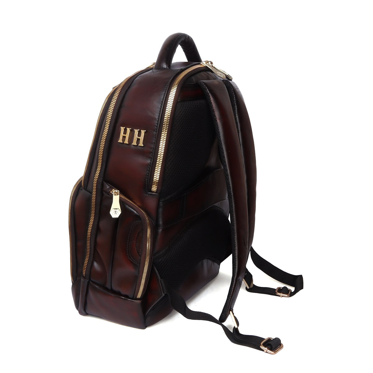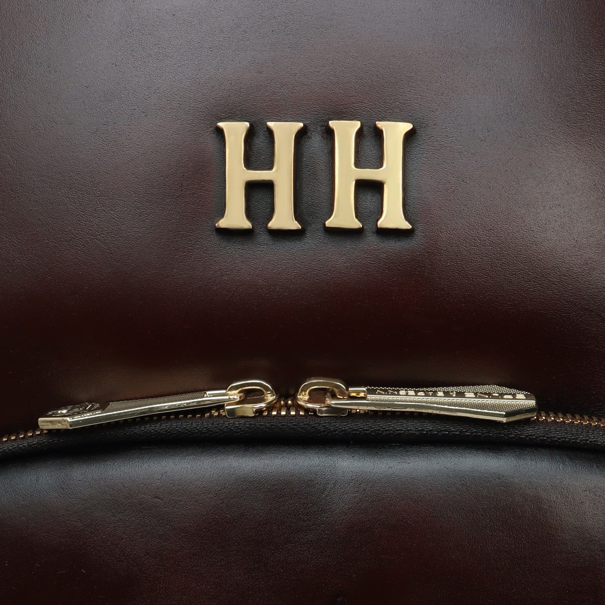Bespoke 'HH' Metal Initials Dark Brown Leather Backpack with Embossed Logo by Brune & Bareskin