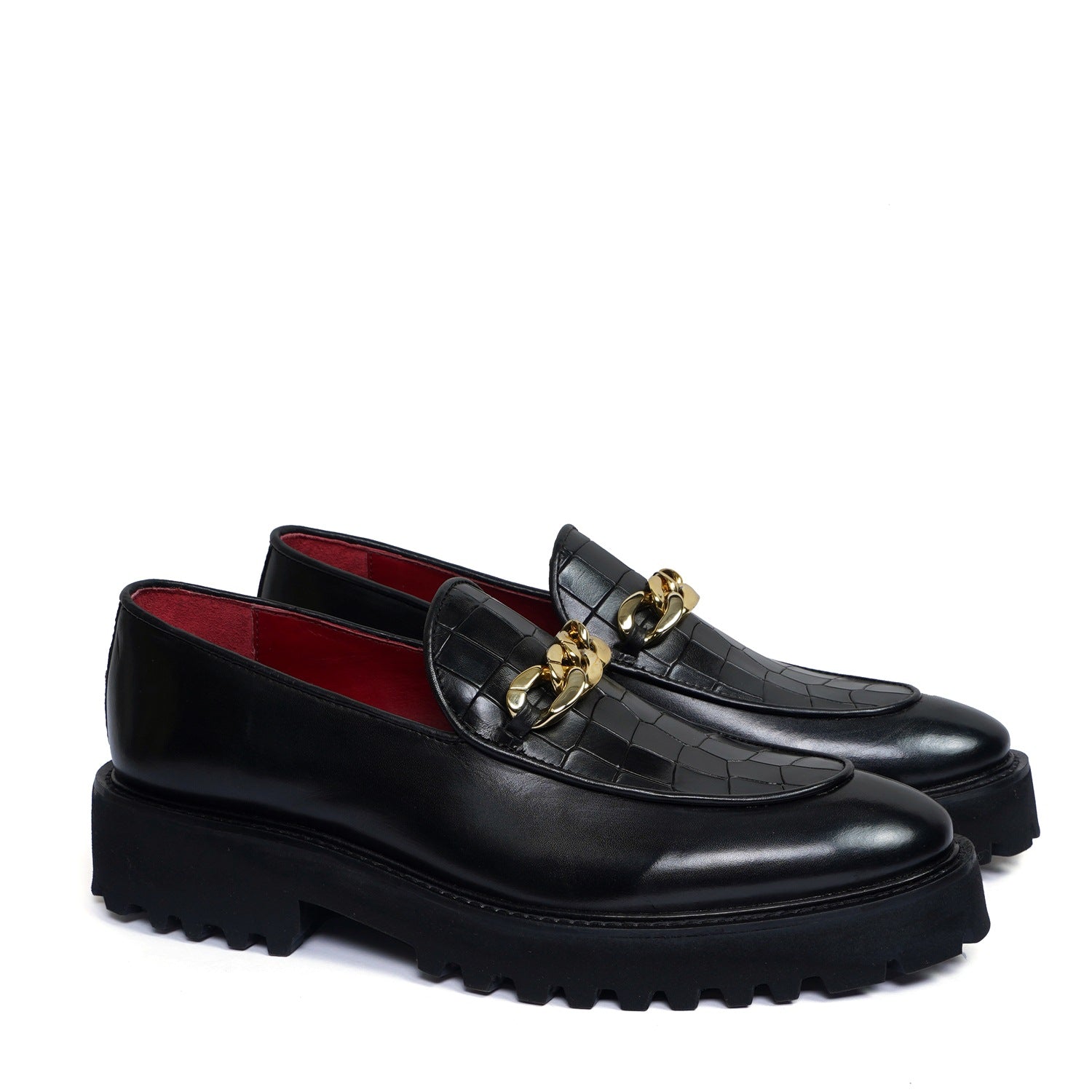 Add height and style to your wardrobe with our Brune & Bareskin Chunky Sole Loafers. The black genuine deep cut croco textured leather paired with the personalized golden chain embellishment on the vamp makes for a sophisticated and fashionable men's statement shoe. The perfectly round apron toe design and comfortable customized sole will have you looking and feeling your best. Top it off with a gold metal finish lion logo on the counter panel for an extra touch of luxury.