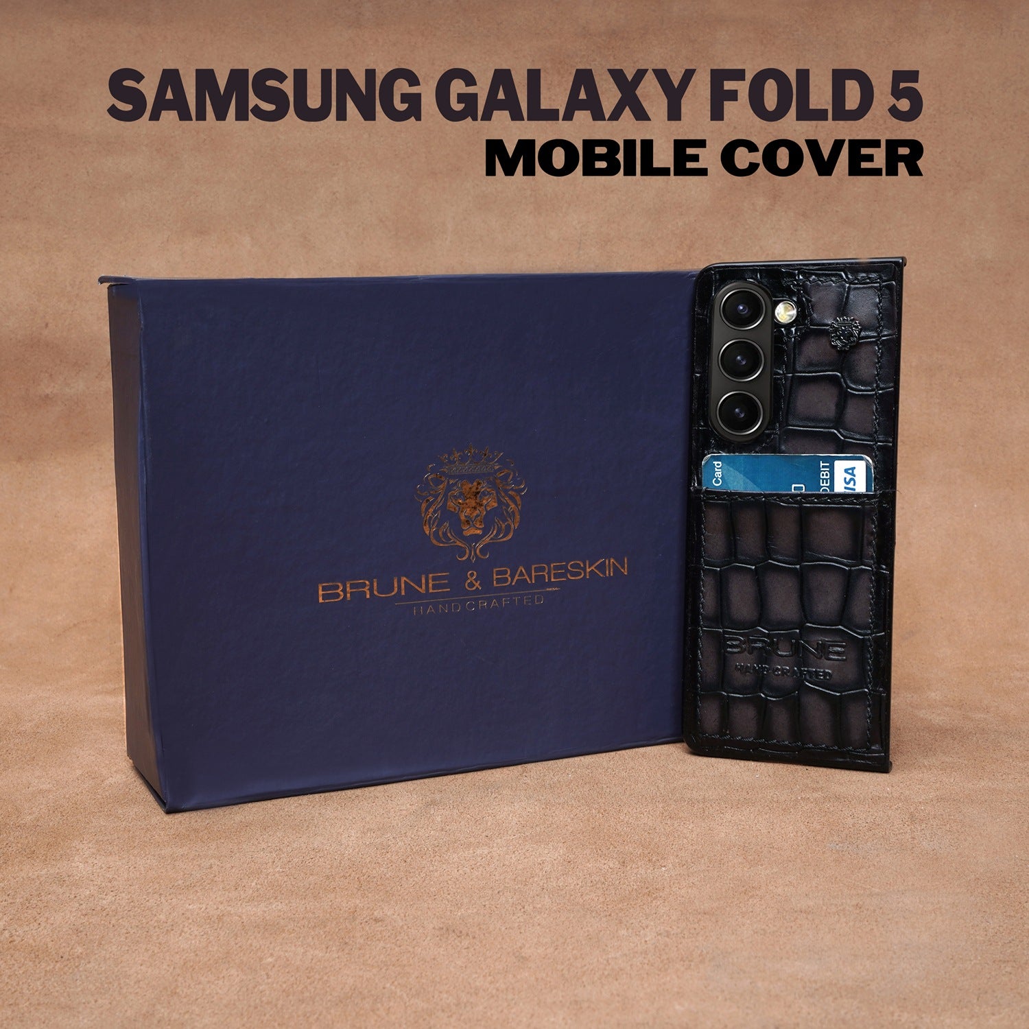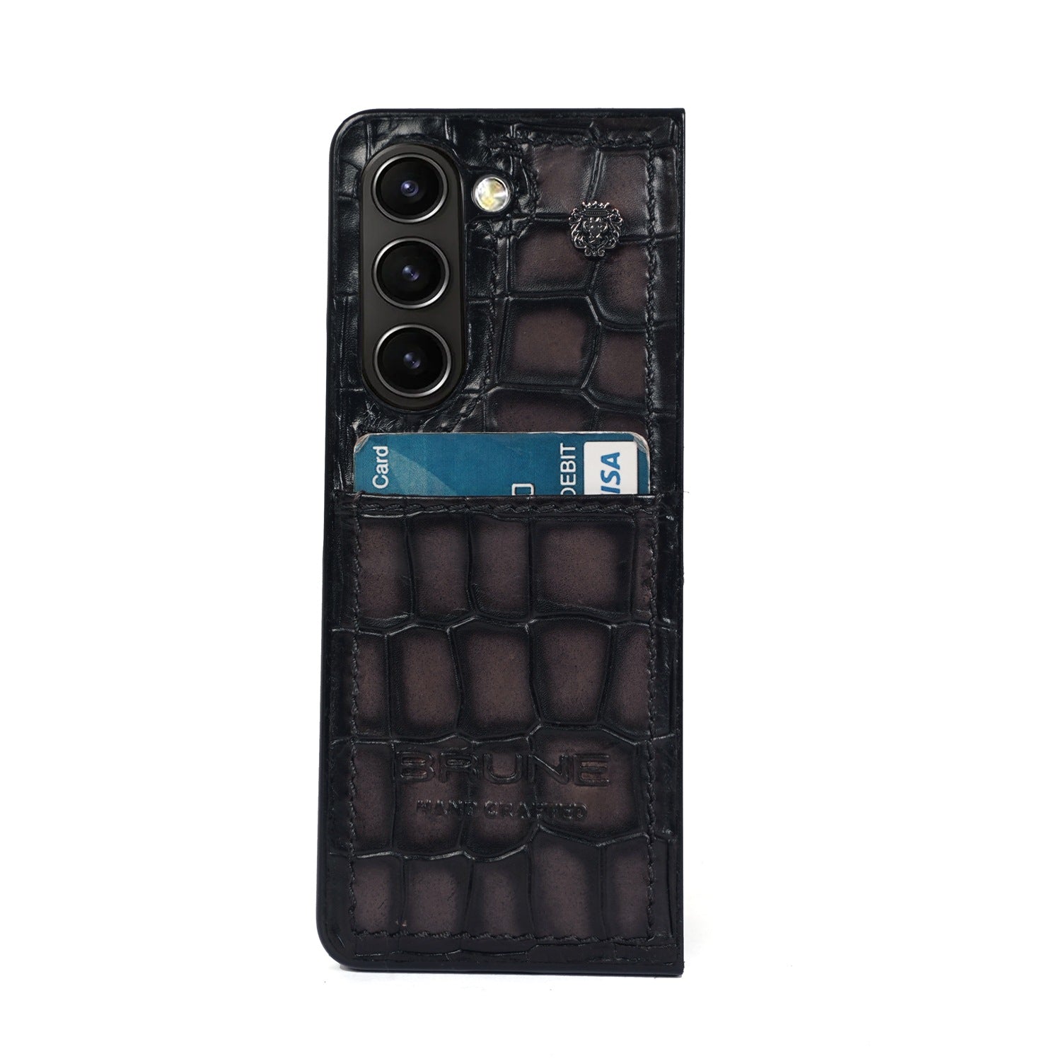 Introducing our luxurious Customized Card Slot Mobile Cover, designed for the Samsung Galaxy Fold 5 Series. Made with premium quality materials, this handmade cover features a deep cut croco textured grey leather, giving your phone a sleek and smokey finish. The backside includes a convenient card slot, perfect for making a fashion statement while protecting your phone. Complete with a mini metal lion logo, this exclusive case is the ultimate accessory for the sophisticated individual.