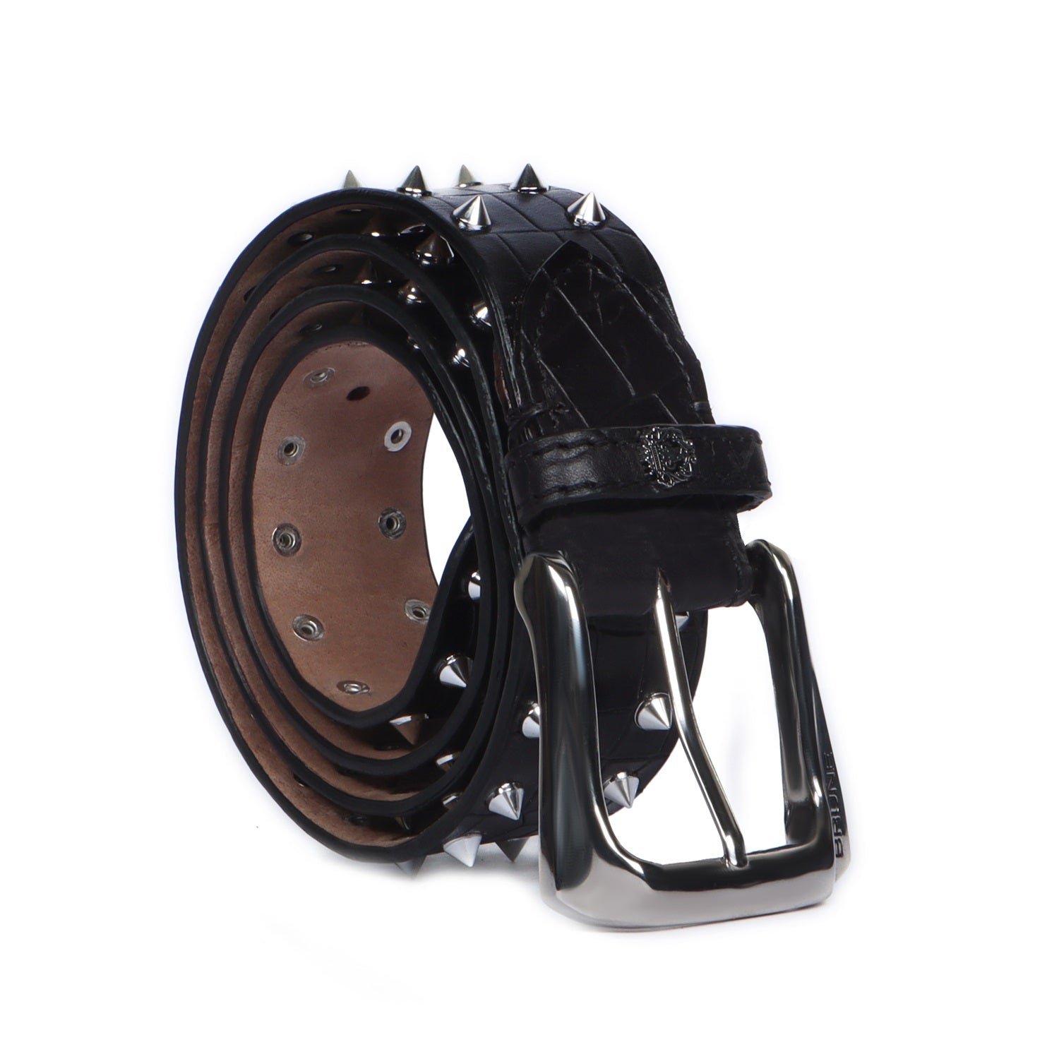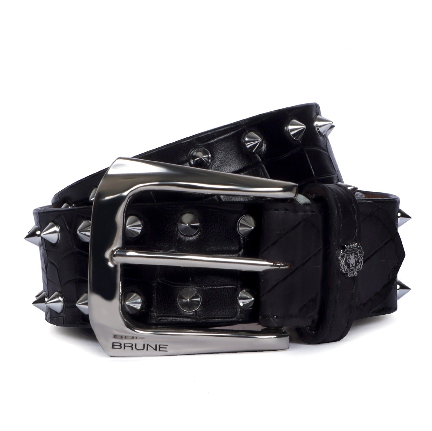 Stud Detailing Black Belt For Men in Croco Textured Leather Silver Finish Slant Shape Buckle By Brune & Bareskin