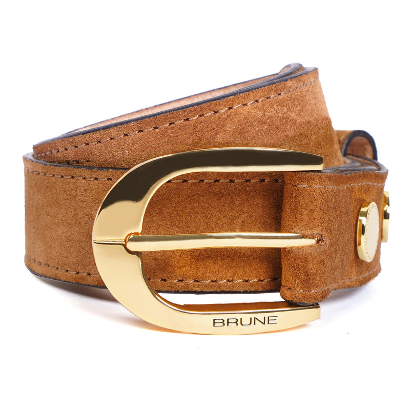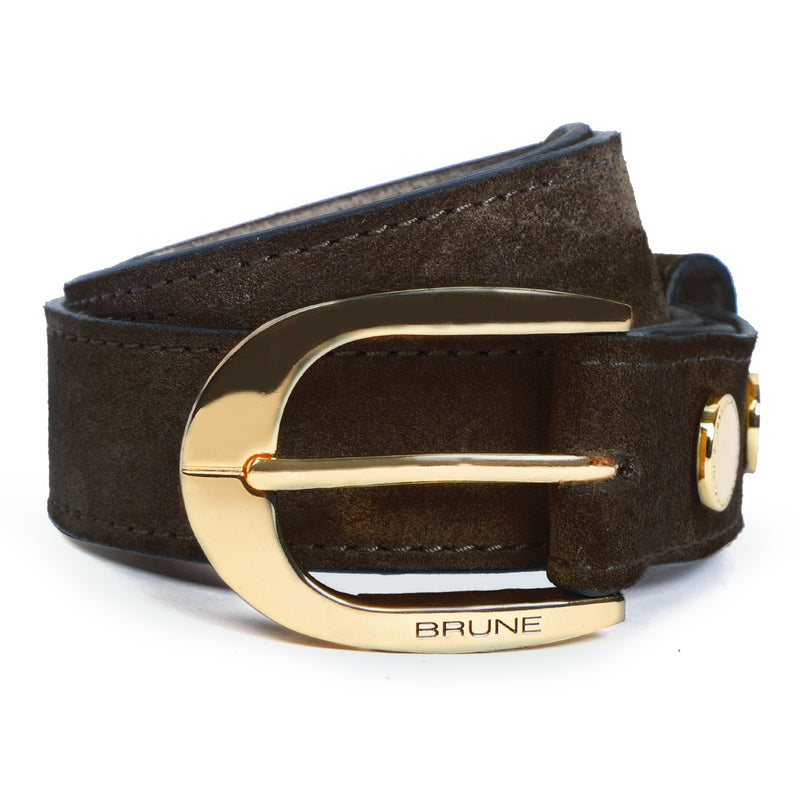 Expertly crafted by Brune & Bareskin, this black suede leather belt is designed for both formal and everyday wear. Hand-stitched and featuring a double snap button closure, it boasts a detachable buckle strap with a luxurious gold finish oval shape metal buckle. Upgrade your style with this versatile and fashionable piece.