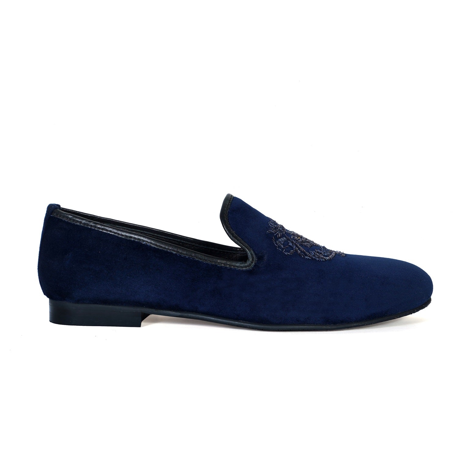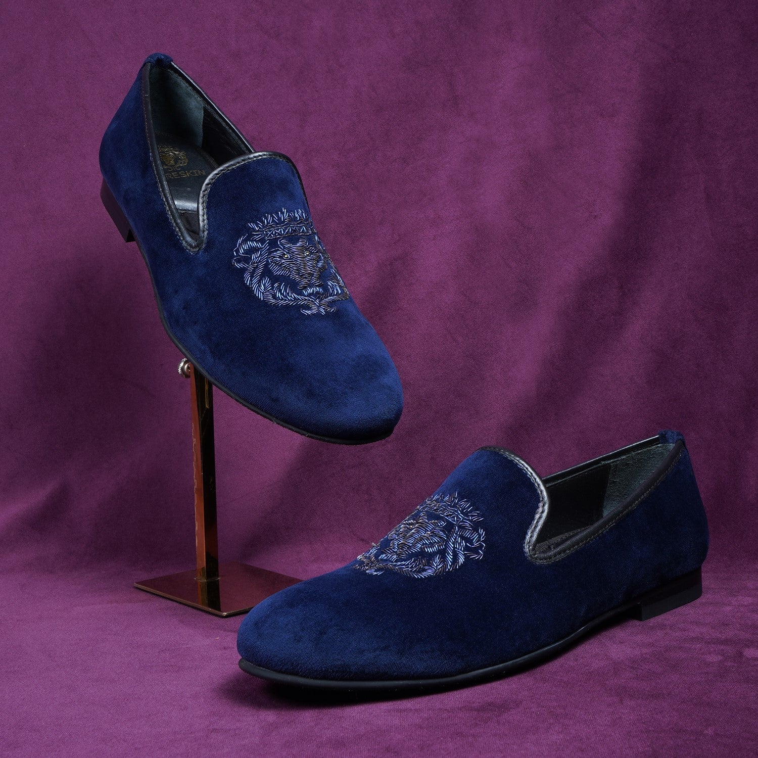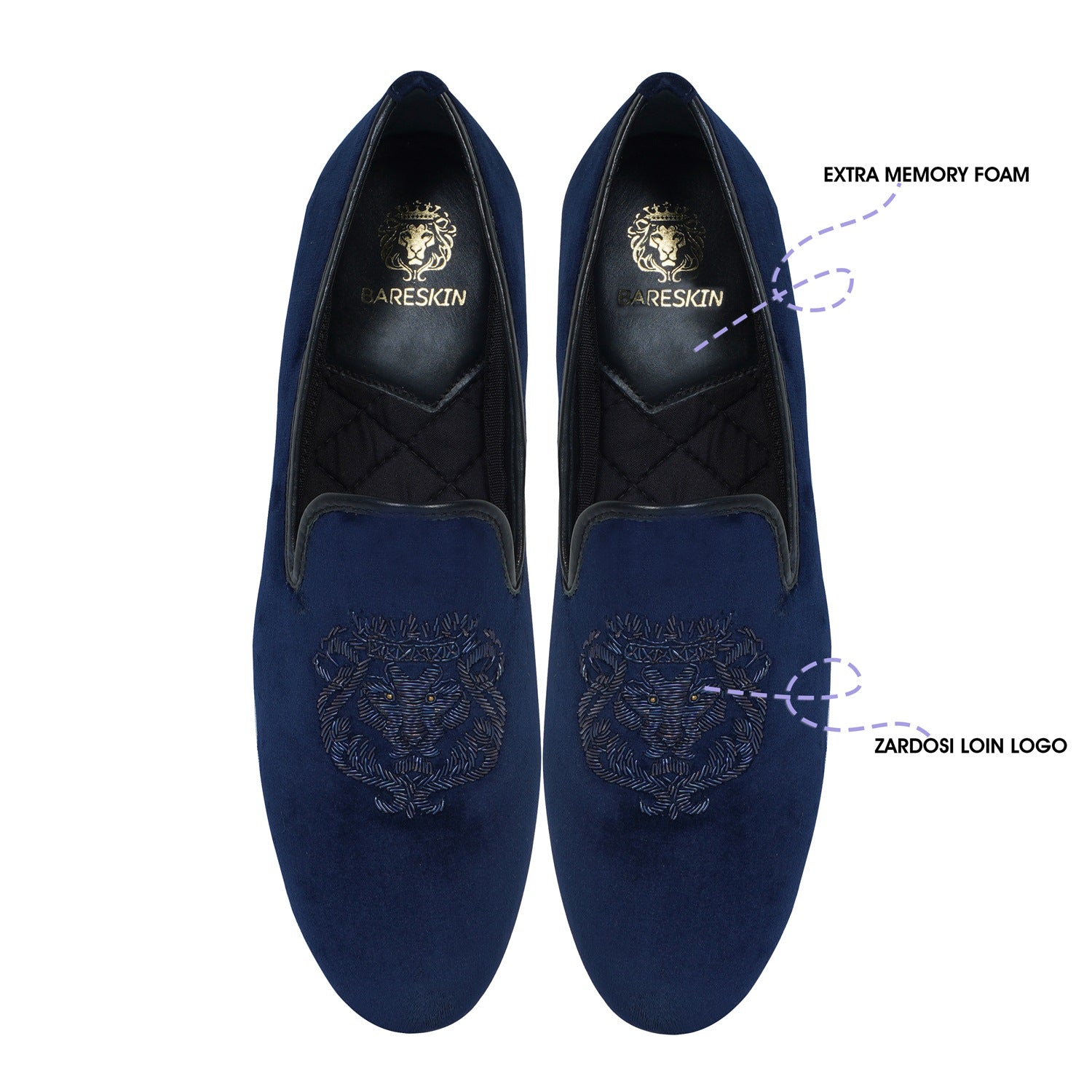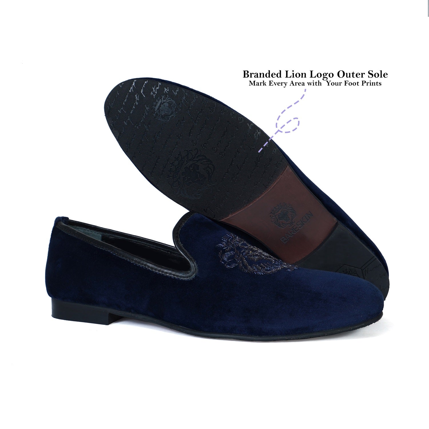 Elevate your style with Brune & Bareskin's Italian Velvet Blue Slip-on Shoes. Hand-crafted with the most experienced zardosi techniques, this elite collection features a Lion logo design with special bead eyes for a unique and eye-catching appearance. The extra memory foam provides comfort for all-day wear, while the branded lion logo laser engraved outer sole adds a touch of luxury. Perfect for weddings and special occasions.