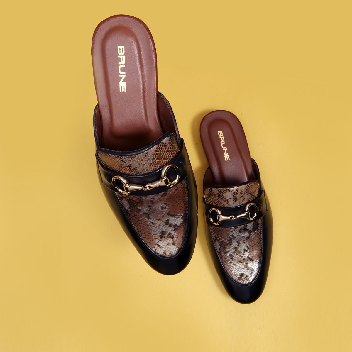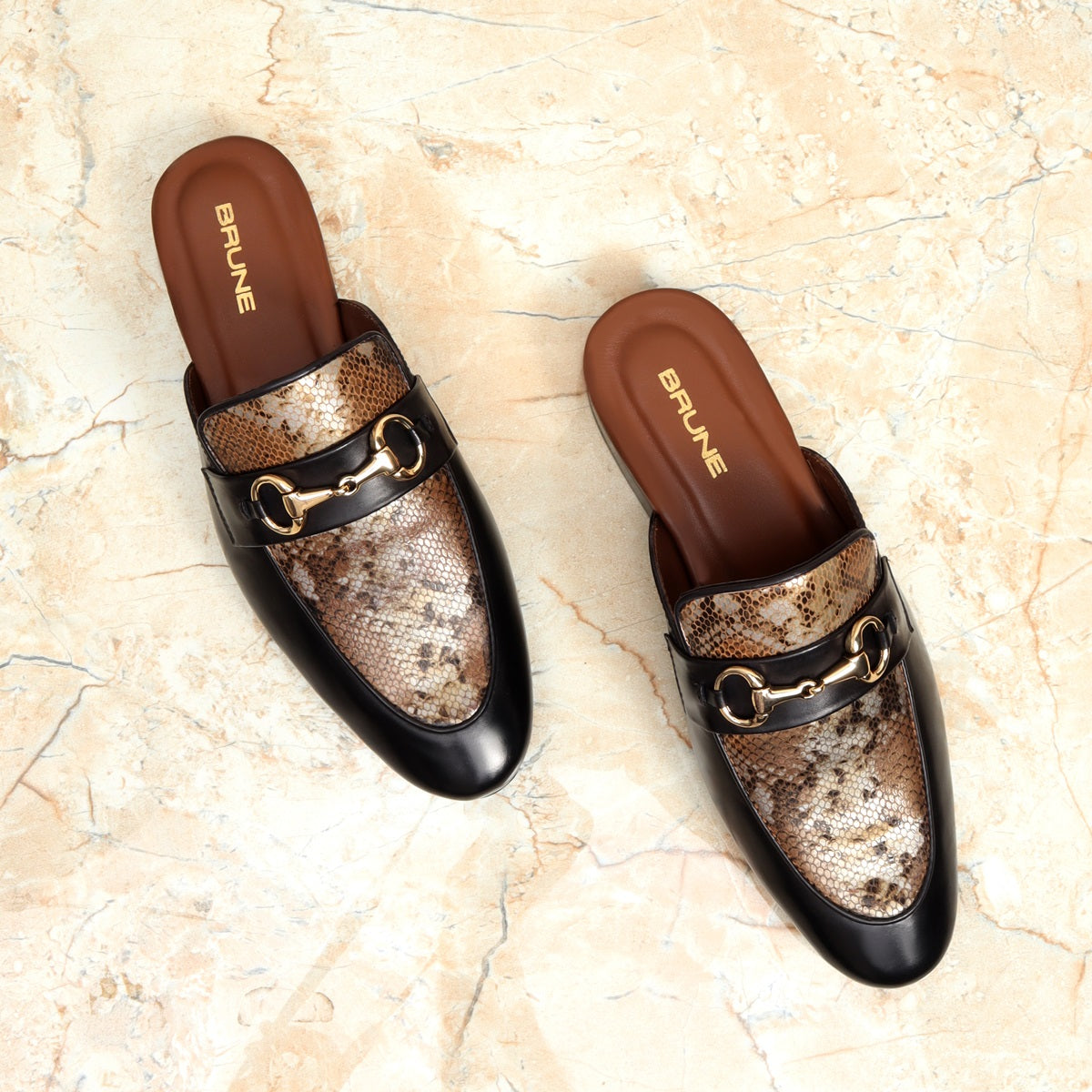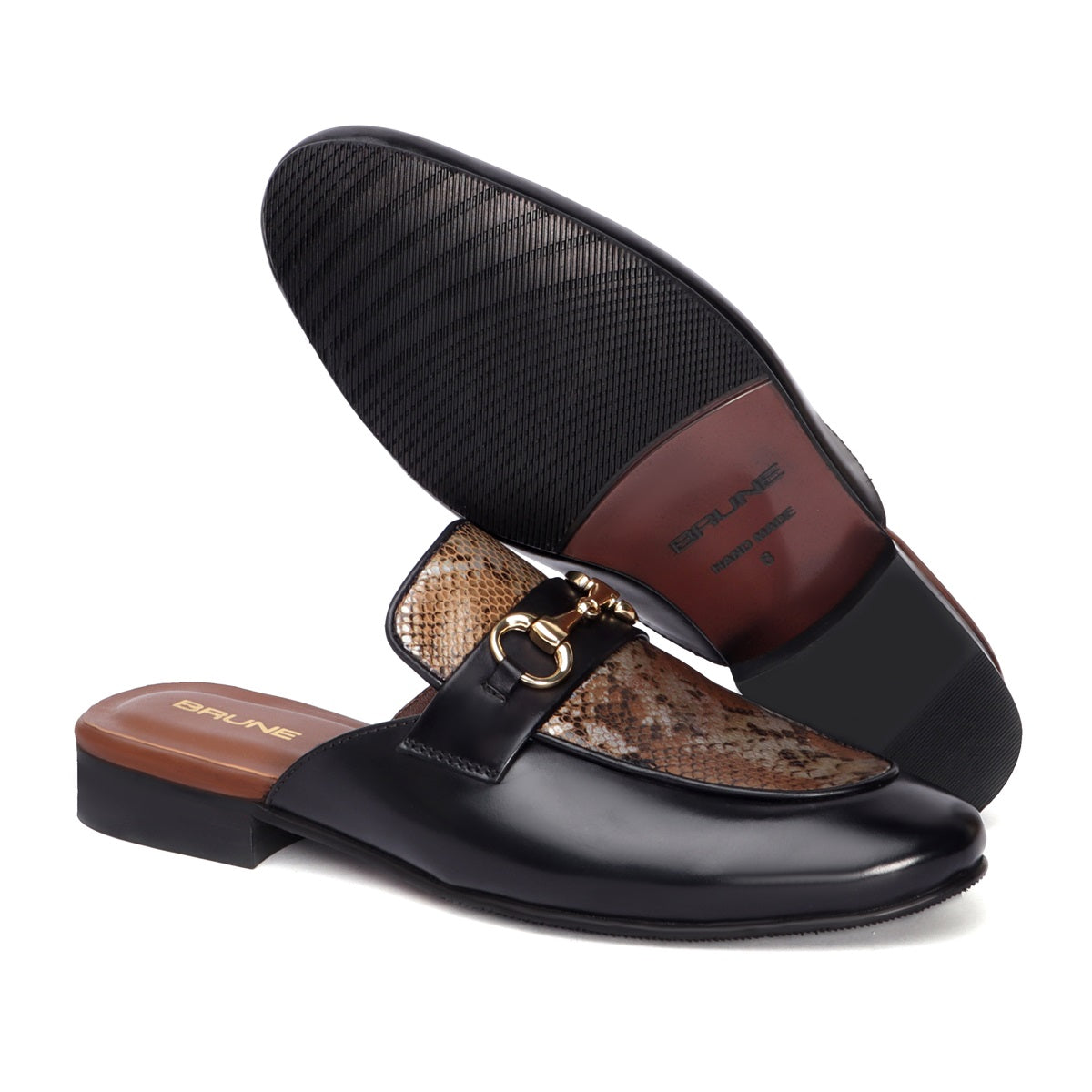 Black leather formal slippers with apron toe and designer buckle, makes it as elegant as any BRUNE & BARESKIN shoe would look, but still offering the summer special SLIPPER opening to the wear ability and usability. Mules remain favorite style of shoes, as they are convenient to use and spell minimum fuss. Snake print leather on the vamp is enhancing its look with golden metal horse-bit buckle on it. And when they are made of exemplary fitting and finish as that of the brand Brune & Bareskin, you can be sure that the shoes are nothing short of excellence. Wear this shoe like a slipper. These are made keeping in mind the style and convenience in mind. This is a must have pair in your footwear collection. You can also get it customized especially for you with your name initials and favorite color. When you choose branded by BRUNE & BARESKIN, you are sure to get more than a few glances coming your way.