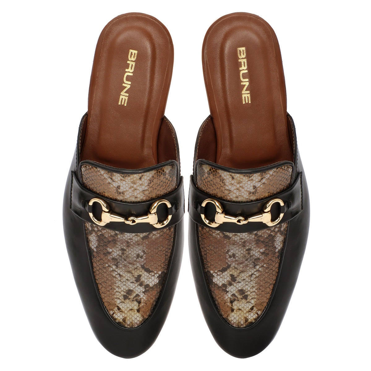 Snake Print Black Leather Horsebit Mules