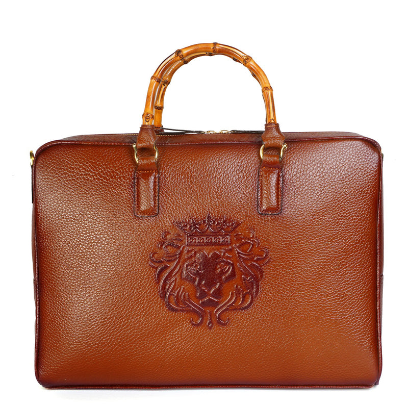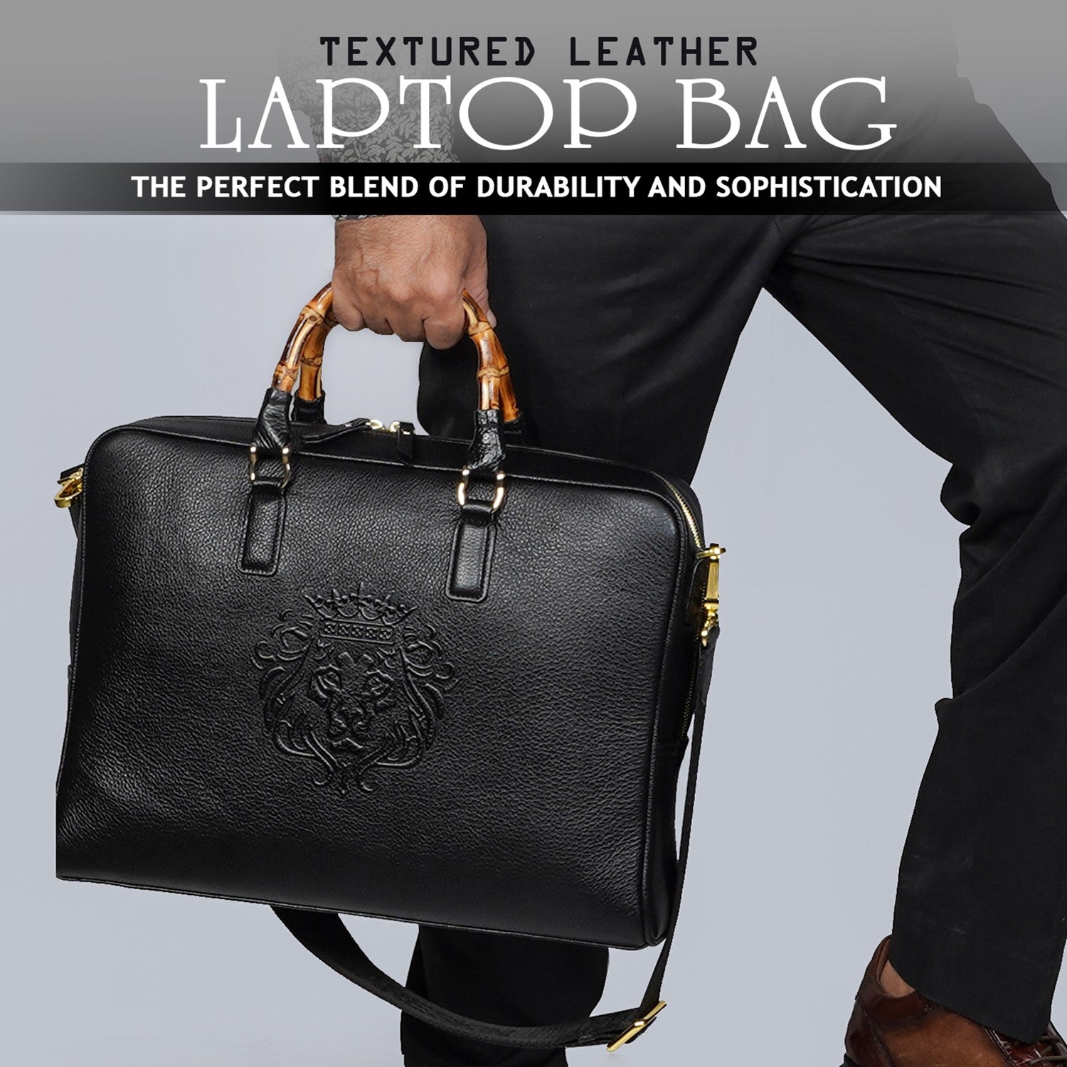 Experience the ultimate combination of style and function with the Bamboo Handle Black Laptop/Office Briefcase in Textured Leather! Handcrafted by Brune & Bareskin, this briefcase offers a unique and professional look with its premium quality textured leather and most special top bamboo handle. Stay organized with dedicated compartments for your laptop, pens, cards, and more. Perfect for business meetings and travel, this briefcase also features a detachable shoulder strap for added convenience. Elevate your professional style with this handcrafted masterpiece.