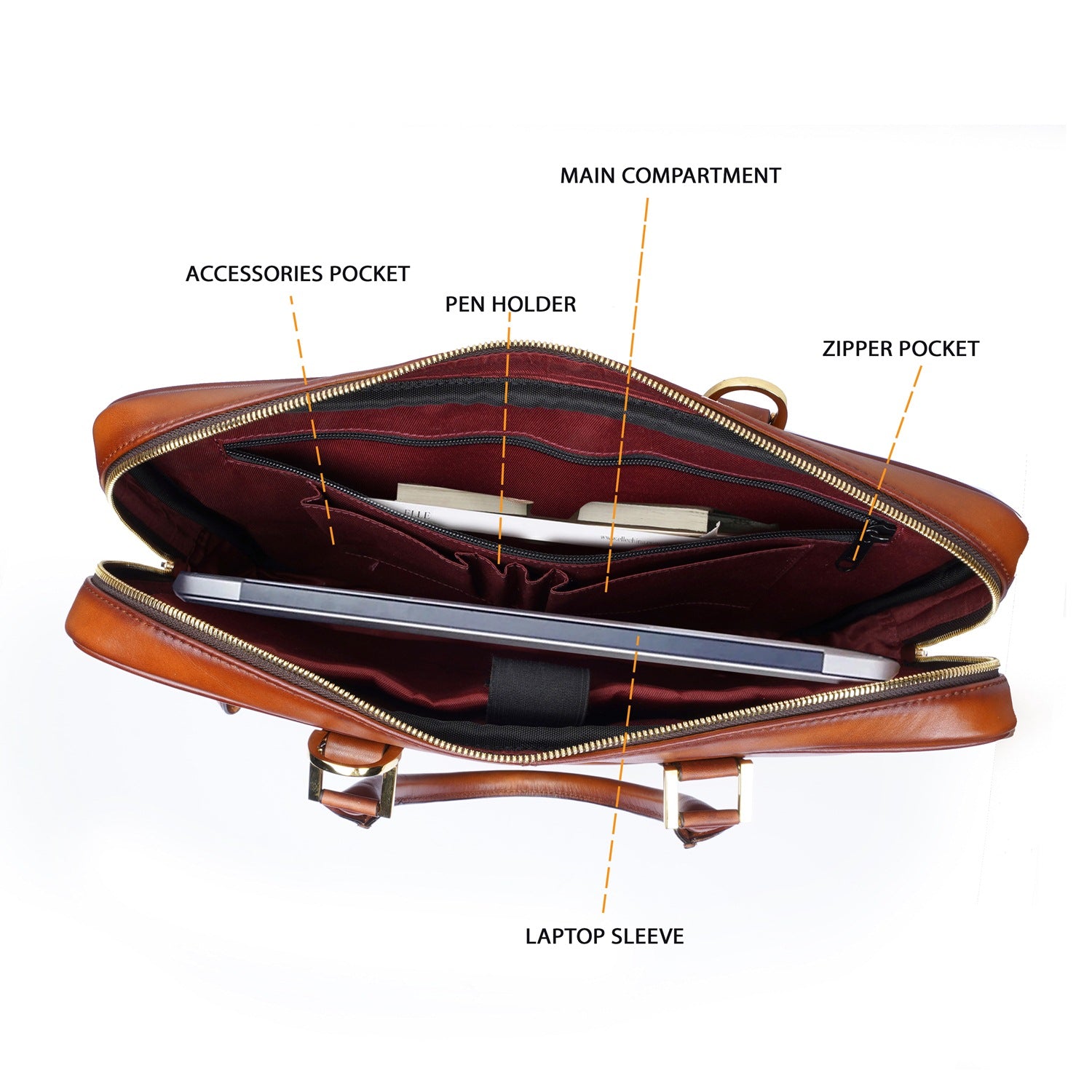 Expertly crafted by skilled artisans, the Tan Office Briefcase by Brune & Bareskin combines elegant design with practical functionality. Made from premium quality, hand-painted veg tanned leather, this unisex office briefcase features stunning tri-color leather trims on the front. It boasts a large zip compartment, dedicated padded laptop pocket, and multiple zip pockets for all your business essentials. Perfect for business meetings and travel, it also comes with a detachable shoulder strap and top leather handle. Elevate your professional style with this handcrafted masterpiece.