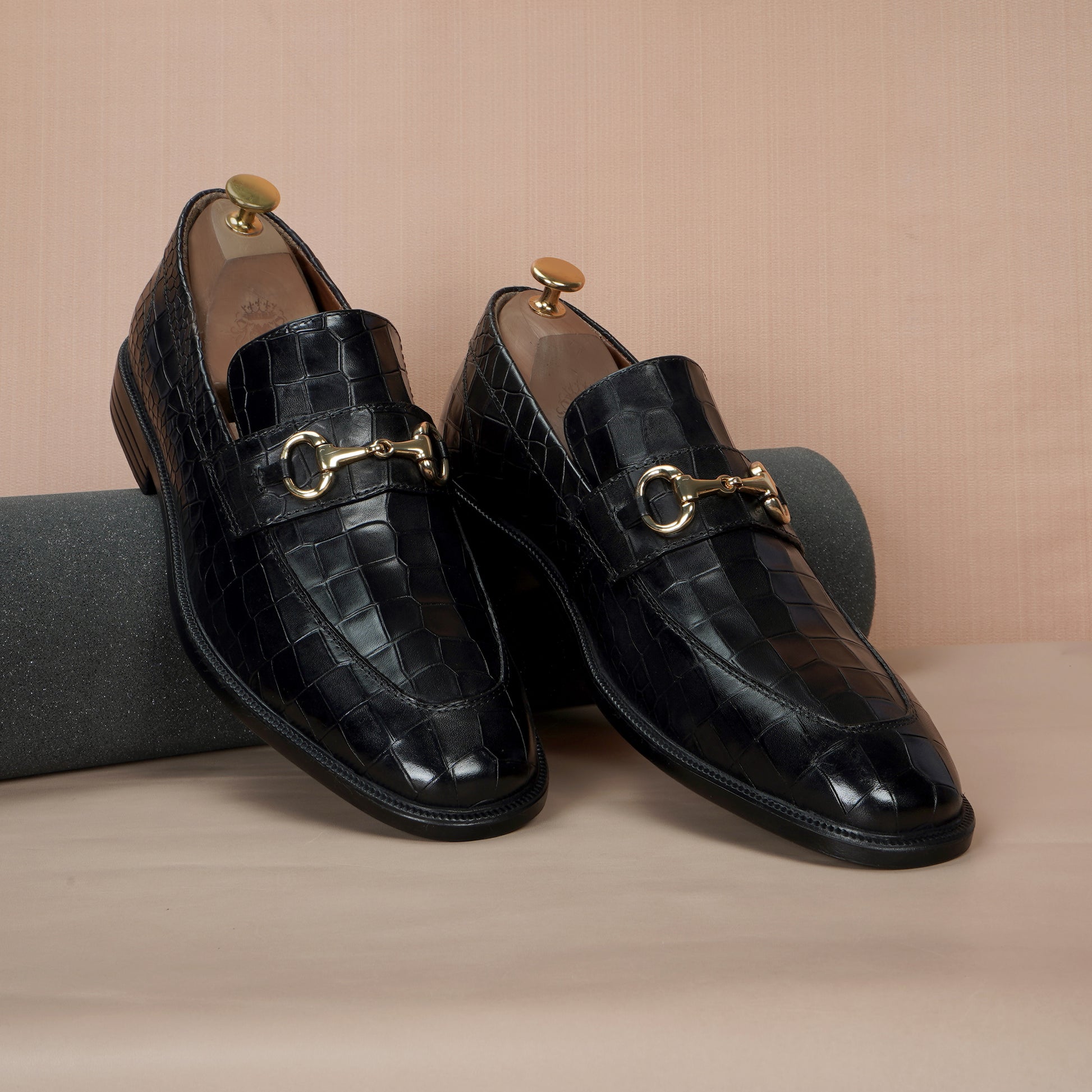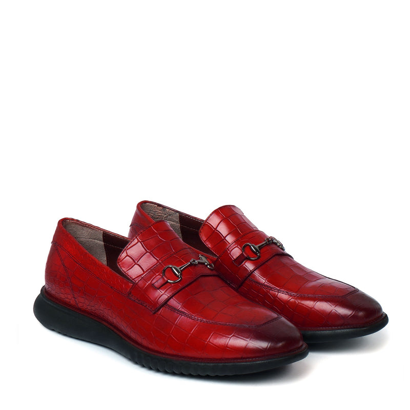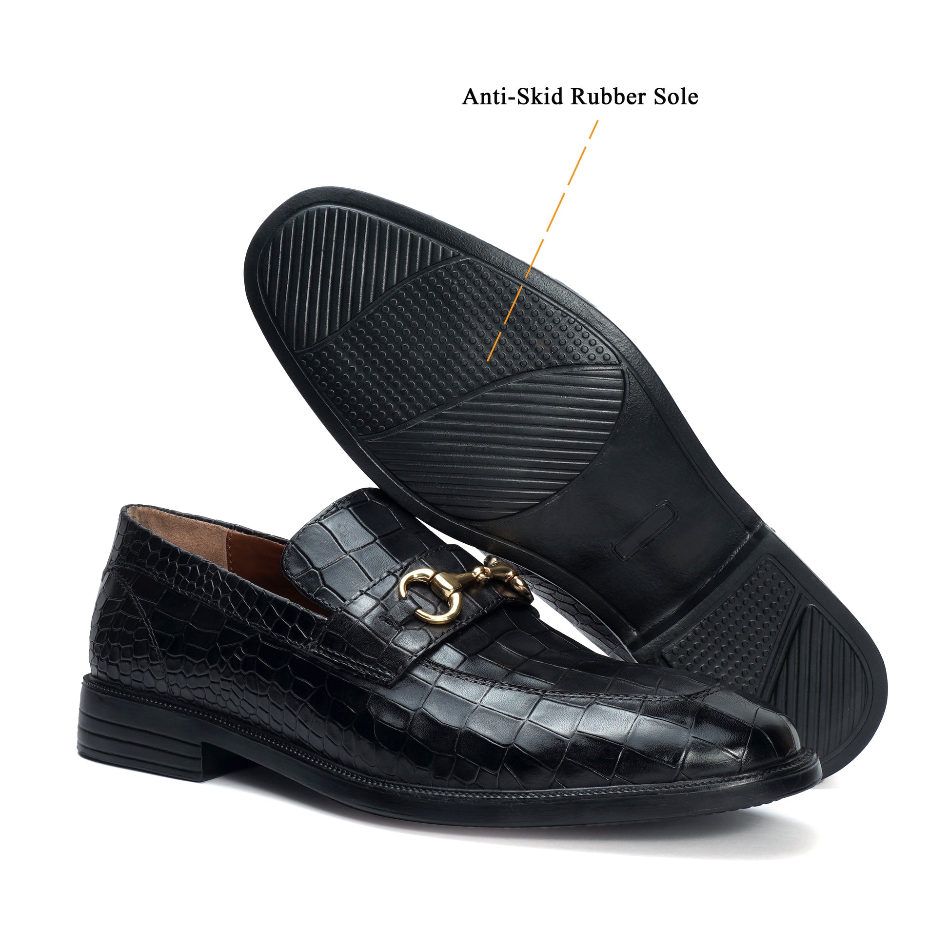 For the office or your day-to-day look, this black loafer offers a stylish upgrade to your wardrobe. This classic men's shoe is made from luxurious deep cut croco-textured leather and features an eye-catching golden horse-bit buckle detailing on vamp. This loafer is an elegant choice for any occasion. The light-weight rubberized heel sole ensures superior comfort and ease of movement. So why not experience the luxury for yourself?