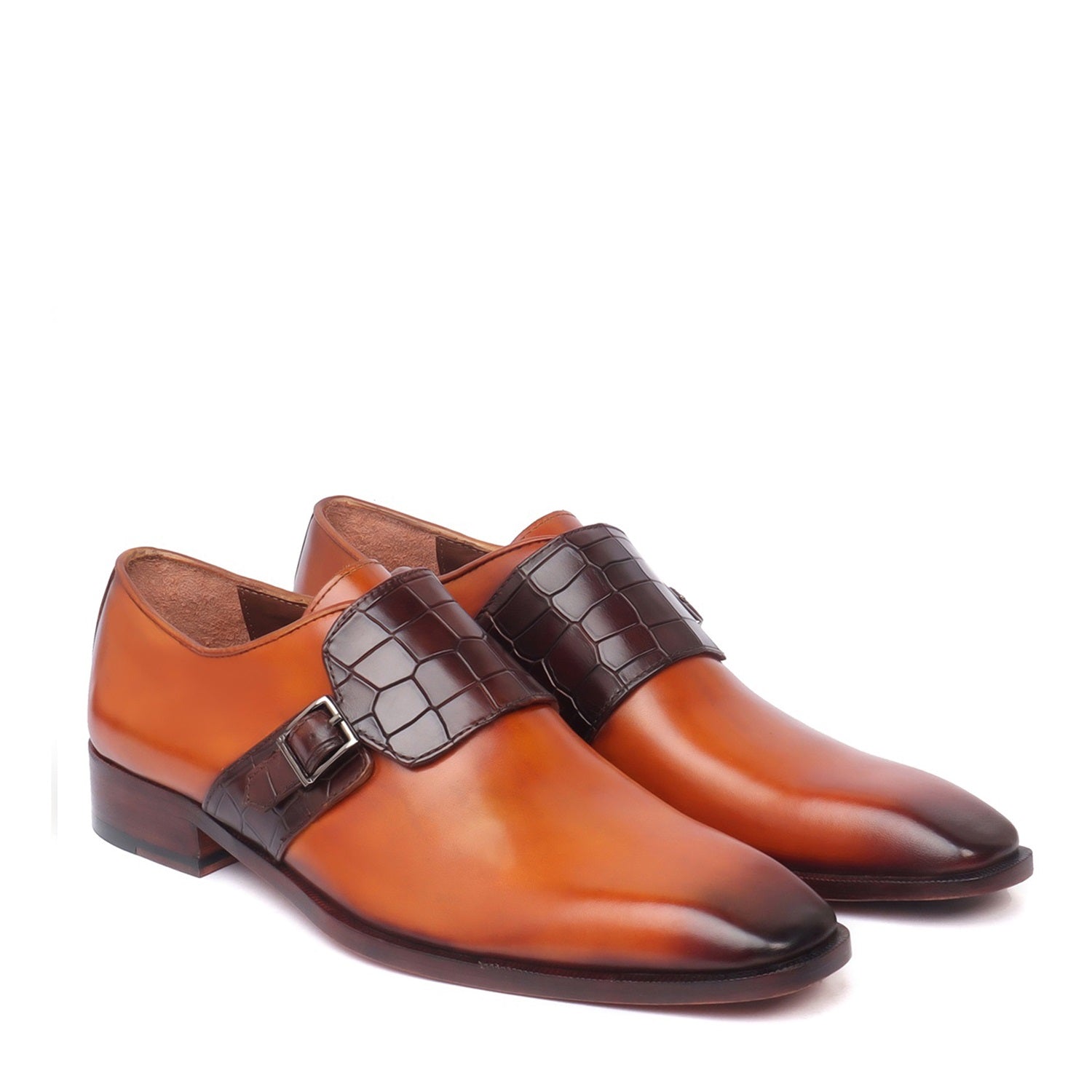 When it comes to Formal Footwear, BRUNE & BARESKIN has come a long way. Whether you are getting ready for any night-out or casual meet-ups, this Tan-Dark Brown Croco Single Monk Strap Shoe is perfect to show your class. Slip-on closure and angular toe blend the style with comfort. Burnished Toe provides the extra oomph in these modernized classic shoes. Cushioned foot-bed makes them a perfect chum for your feet. These incredibly stylish shoes enhance your looks with a wide range of attire from casual to formal.