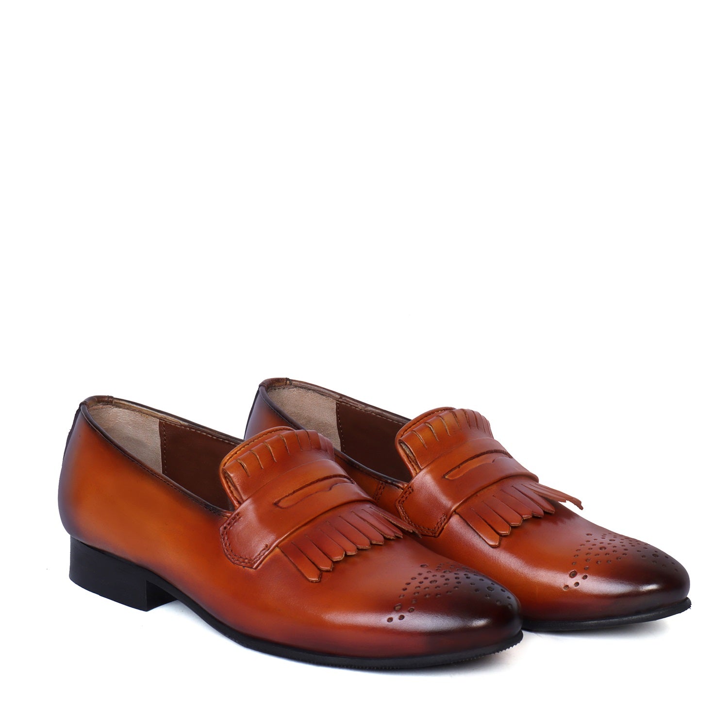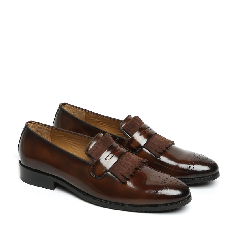 Burnished Slip-On Darker Tan Apron Toe Leather Fringes