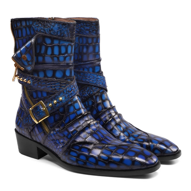 Step into style with our Brune & Bareskin Wine Leather Boots. These men's dress boots feature a sleek toe, Cuban heel, and high ankle for ultimate sophistication. The genuine leather and arrow head studs add a touch of luxury, while the wraparound adjustable buckle strap and zip closure provide a secure fit. With a gunmetal lion logo and snap button flap-over design, these boots are a true statement piece. Complete with a leather sole and 45mm Cuban heeled sole, these boots are both stylish and functional. Elevate any outfit with Brune & Bareskin. You can customize this chic boots in any of your favorite color shade with our bespoke services.
