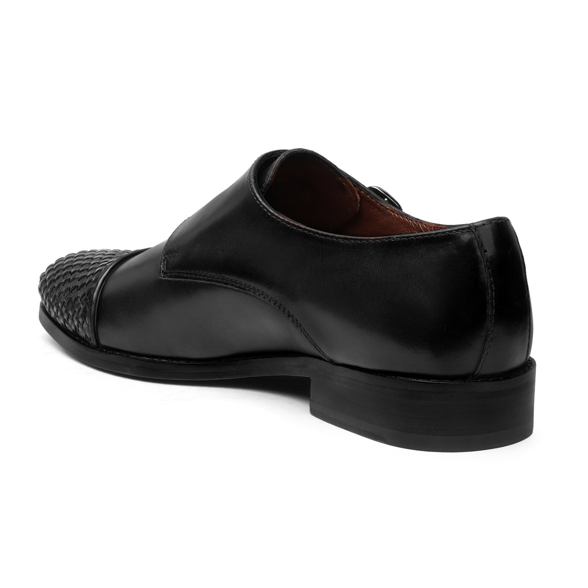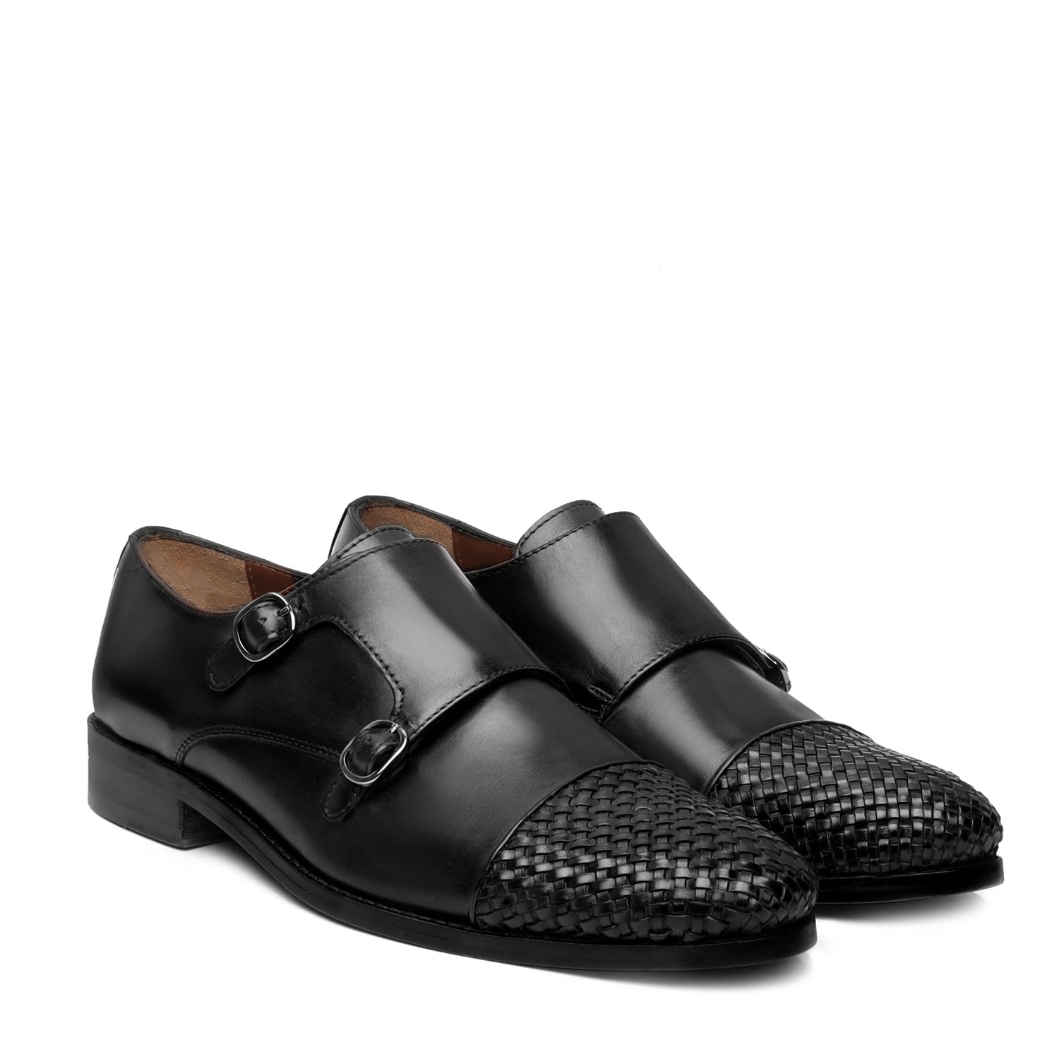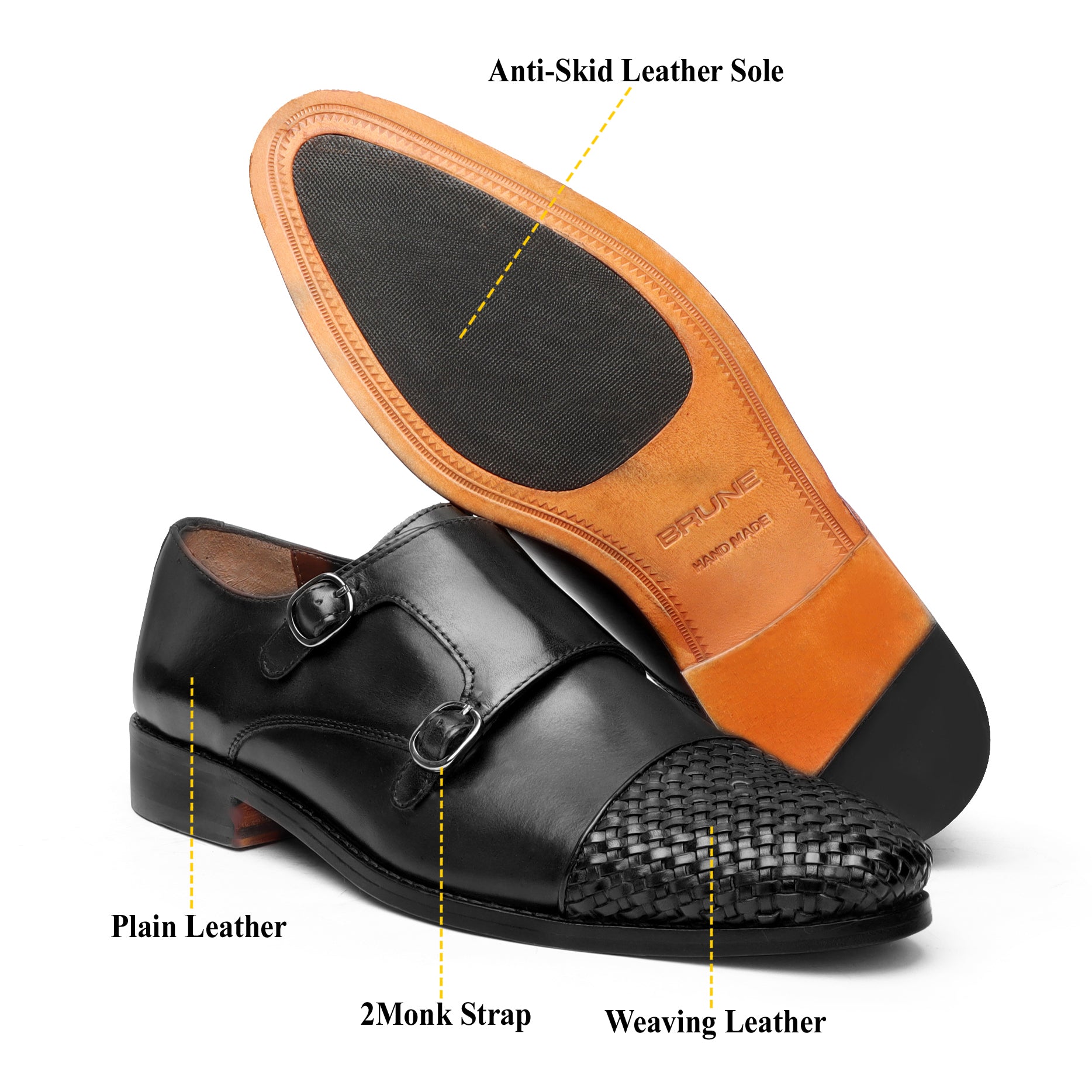 Black Contrasting Cap Toe Leather Woven Detailed Double Monk With Leather Sole Shoes By Brune & Bareskin