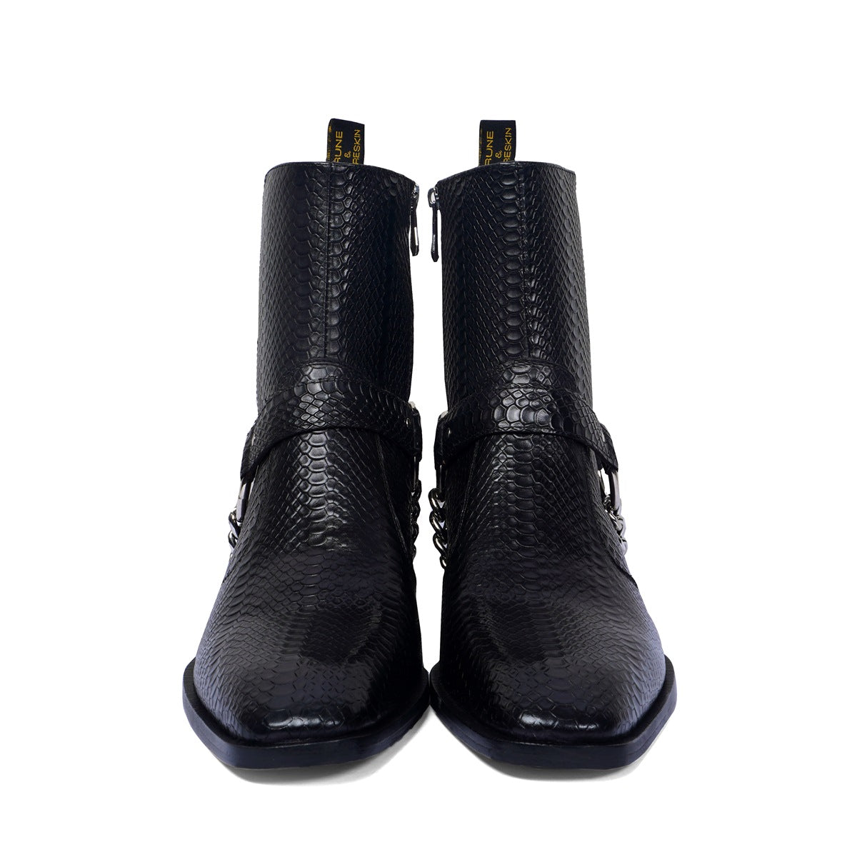 Elevate your style with the Cuban Boot in Black Snake Skin Textured Leather. Handcrafted with exquisite detailing and a Cuban heel, these chelsea boots add a touch of class to any outfit. The unique snake skin texture and black finish make for a bold and stylish statement. Plus, the adjustable silver ring buckle straps add a touch of versatility. Upgrade your formal boot game with Brune & Bareskin.